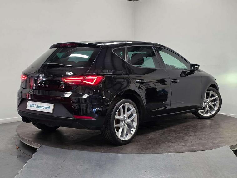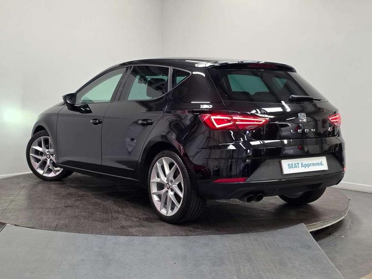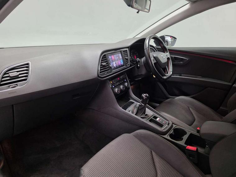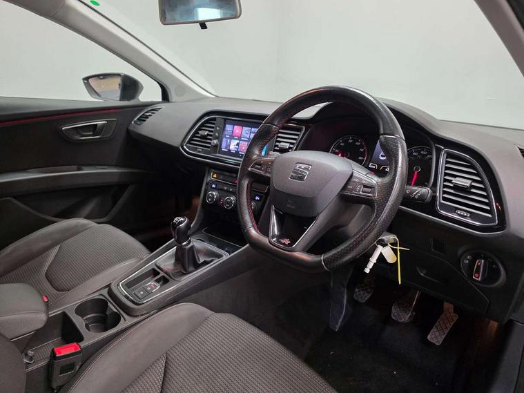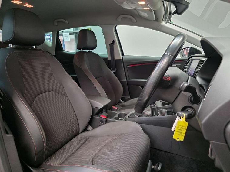 'Lights On' Reminder warning buzzer, 8" touch screen, Bluetooth Handsfree Phone Connection, Low fuel warning light, Outside temperature gauge, Rear parking sensors, Remote fuel flap release, SEAT Drive profile, SEAT logo boot release, Service interval indicator, Trip computer, Voice control system, XDS electronic differential lock, 2 USB ports, 2 USB sockets in rear, 2x SD card slot, Auxiliary input socket, Bluetooth audio streaming, DAB Digital radio, Radio/CD + MP3, Steering wheel mounted audio/phone controls, Aluminium front door sills, Black grille with chrome surround, Body colour door handles, Body coloured bumpers, Body coloured door mirrors, Dark tinted rear windows, Electric adjustable/heated/folding door mirrors, Electric front/rear windows with one touch/auto up/down, Electric headlamp adjustment, High gloss black finish B and C pillars, LED daytime running lights, LED front fog lights, LED Headlights, LED indicators in door mirrors, LED number plate light, LED tail lights, Rear wash/wipe, Reverse activated kerb-view adjustment on passenger's door mirror, Twin exhaust pipes, 12v power point in centre console, 3 height adjustable rear headrests, 60/40 split folding rear seat, Active head restraints, Additional heating and ventilation outlet in rear of centre console, Boot net, Driver seat height adjust, Driver seat lumbar adjustment, Dual zone climate control, Dust/pollen filter, Front adjustable head restraints, Front armrest with storage box, Front cupholders x 2, Front seat and rear pockets, Front sports seats, Front/rear floor mats, Height/reach adjust steering wheel, Illuminated door sills, Illuminated rear centre console, Instrument lighting with brightness control, Leather handbrake, Luggage tie-down hooks, Passenger seat height adjuster, Passenger seat lumbar adjust, Perforated leather steering wheel with red stitching + gear knob, Rear top tether child seat ISOFIX attachment, Storage boxes under front seats, 3 point seatbelts on all rear seats, ABS + traction control, Active pedestrian safety system, Child proof door locks, Collision mitigation braking system, Curtain airbags, Driver/Front Passenger airbags, Drivers knee airbag, Electronic parking brake with auto hold, ESP+EBA, Front assist including city emergency braking, Front seatbelt pretensioners, Front Seatbelt warning, Front side airbags, Hill hold control, Passenger airbag deactivation system, Tyre pressure monitoring system, 2 folding remote keys with window open/close function, Engine immobiliser, Locking wheel bolts, Remote central locking + deadlocks, Volumetric alarm with back up horn, Chrome interior trim,