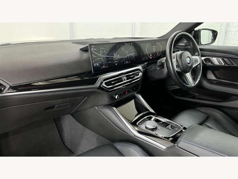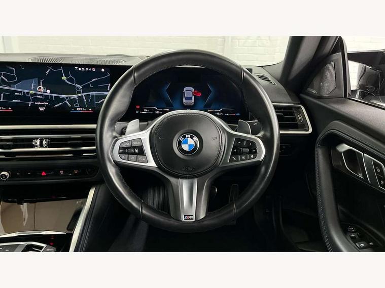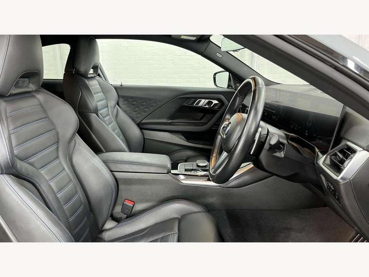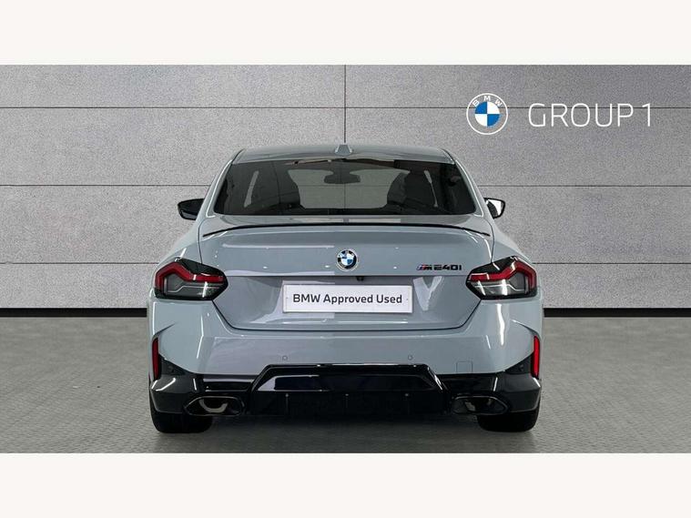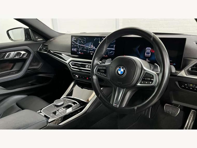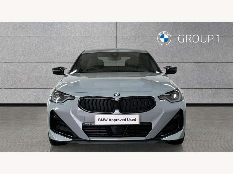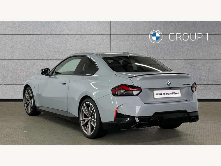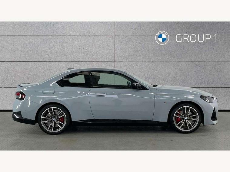 2 USB connections for charging and transferring data, 4G LTE connectivity with hard wired 4G network sim card, Attentiveness assist, Bluetooth with USB, BMW ConnectedDrive online services, BMW Intelligent Personal Assistant, BMW operating system 8 with variable, configurable widgets display information in real time, BMW Teleservices, Check Control warning system for monitoring of lights and door/luggage compartment open warning, Direct selection buttons, Drive off assistant, Driving experience switch with sport+ mode, Eco pro mode, Electric power steering, Front and rear parking sensors, Front/rear Parking distance control, iDrive controller with turn and press function, Integrated owners handbook, Intelligent functions, Live cockpit plus with nav function 12.3" instrument cluster and 14.9" centre display, Oil sensor for level and grade, Optimum shift indicator, Personal Profile, Touch operation on control display, Variable sport steering, Widescreen multi-media display, WiFi interface for wireless connection of mobile terminal devices, Aluminium lightweight construction, Balancer shaft, BMW TwinPower Turbo inline 6-cylinder petrol engine, Double VANOS, Drive performance control with ECO PRO comfort + sport mode, High precision injection, M Sport differential, Petrol Particulate Filter, Sport automatic steptronic transmission with gearshift paddles, manual gearshift time display, launch control, coasting idle ECO PRO/COMFORT modes, Twin scroll turbocharger with Valvetronic, xDrive with rear orientated application, DAB tuner, Acoustic windscreen wipers for reduced driving noise, Adaptive LED Headlights, Automatic windscreen wipers and automatic headlight, Automatically dimming rear view mirror, BMW individual lights shadow line, Body colour door handles flush with door surface, Body colour front and rear bumpers, Daytime running lights, Electric windows - front and rear, with open/close fingertip control and trap release, Exhaust tailpipes x 2 - free form finisher in black chrome in left and right, Exterior air inlets in front bumper with embellishers in high gloss black, Fading support, Flap controlled M Sport exhaust system, Front and rear bumper system with replaceable deformation elements, Front door sill finishers in black plastic with BMW designation, Front ornamental grille frame in high gloss black, Front windscreen wipers with integrated washer jets, Green tinted heat protection glazing, High beam assistant, High gloss black exterior M mirror caps, High gloss black sill, bumper trim sides and diffuser insert, High gloss shadowline exterior trim in mirror triangle cover, mirror cover panel, mirror bezel and window border, High level third brake light, Indicators integrated int mirror housing, LED registration plate light, LED technology rear tail lights, brake lights and turn indicators, Lightweight engineering, M Sport spoiler - Gurney in body colour, Model designation and M badges in cerium grey, Model designation on right side of tailgate, Rear boot, Rear fog lights, Reversing light in rear light cluster, Shark fin antenna, Side frame decorative moulding black high gloss, Single part LED rear lights with smoked glass components, Sun protection glass, Trailer stabilisation logic, Visible VIN plate, xDrive designation on left tailgate, 12V power socket in front centre console with blanking plug, 2 cupholders in front centre console, 2 zone automatic air conditioning, Ambient lighting, Compartment in front of cupholder, Conditioned based service, Driver seat backrest width adjustment, Electric front seat adjustment with driver memory, Front and rear side armrests integrated into door trim, Front armrest, Front door pockets, Front head restraints, Front M Sport seats, Front passenger seat lumbar support, Heated front seats, Illuminated glove compartment with separate small compartment, Lumbar support for driver, M headliner Anthracite, M sport leather steering wheel, M240i badge in instrument cluster, Manually adjustment steering wheel column, Rear seat backrest with manual 40:20:40 split folding, Rear seat centre foldable armrest with integrated cup holder, Single front passenger seat, Storage compartment between rear seats, Storage tray and compartment with cover in centre console, Sun visors with vanity mirrors and insert tab, Through loading system with 40/20/40 split folding 2 rear seat in 2nd row, Two folding rear seat headrests, Velour floor mats, Vernasca leather upholstery, Additional storage compartment pack without USB - 2 Series Coupe, Connected pack professional - 2 Series Coupe, Interior and exterior mirror pack - 2 Series Coupe, M Sport exterior styling aerodynamics pack - 2 Series Coupe M240i, 2 tone horn, Anti lock braking system (ABS) with cornering brake control, Automatic Stability Control (ASC), BMW emergency call, Brake drying, Child seat ISOFIX attachment for the two outer rear seats, Crash sensor activating of airbags, Unlocking doors, hazard warning lights, interior light, safety battery terminal, Deactivation of fuel pump in the event of a crash, Driver and front passenger airbags, Driver and front passenger side airbags, integrated in the door side seat backrest bolsters for all seat variants, Dynamic brake control, Dynamic stability control + (DSC+), Dynamic Traction Control - DTC, Electrically operated hand brake including automatic hold function and automatic release when driving off, Front and rear disc brakes, Head airbags for all 4 outer seats, M seat belts, M Sport brake with red calipers, Manual deactivation of front passenger airbag, Seat belt security check for driver and front passenger, Seatbelt warning, Side impact protection, Three point seat belts on 4 seats including front belt stopper, pyrotechnic belt tensioners and belt force limiters, Tyre pressure sensor, Warning triangle and first aid kit, Alarm system (Thatcham 1) with remote control and electronic engine immobiliser, Central locking switch for all doors, fuel filler cap and luggage