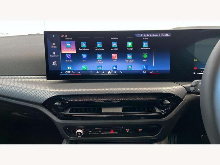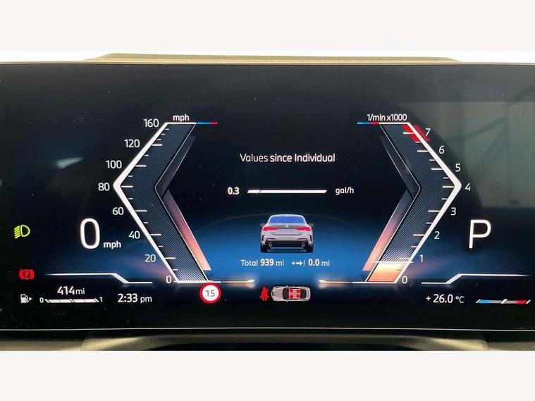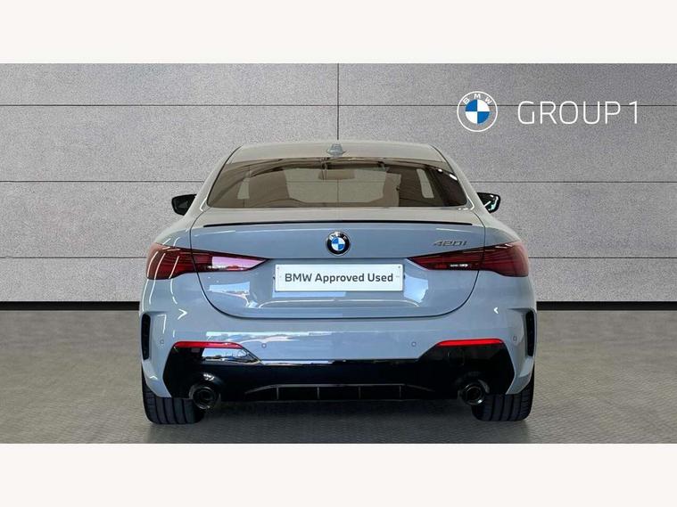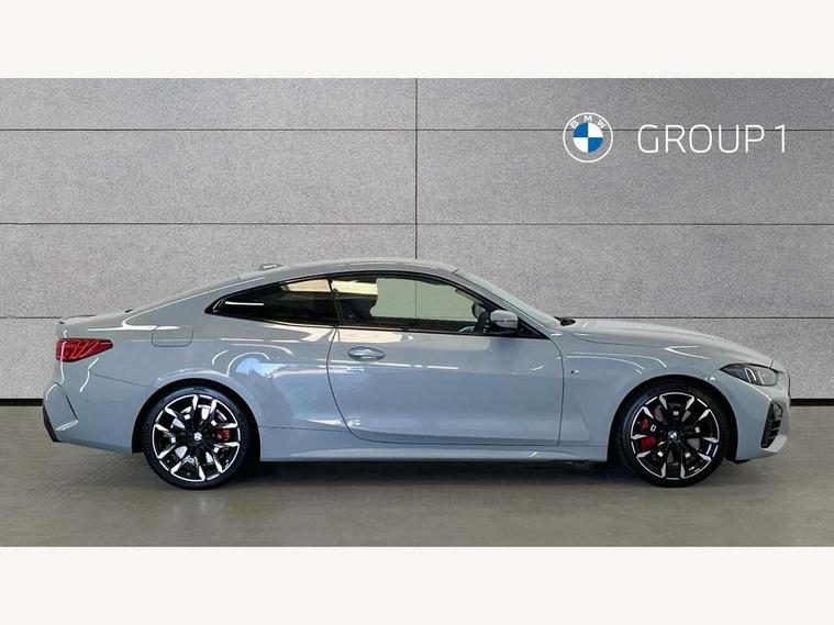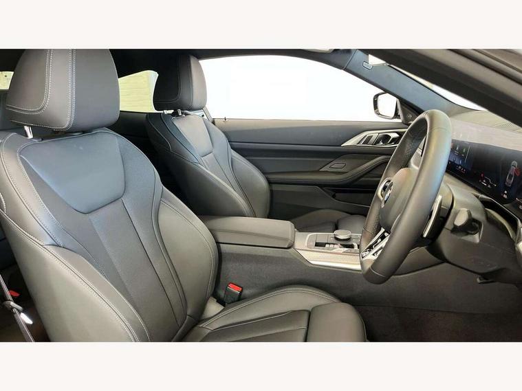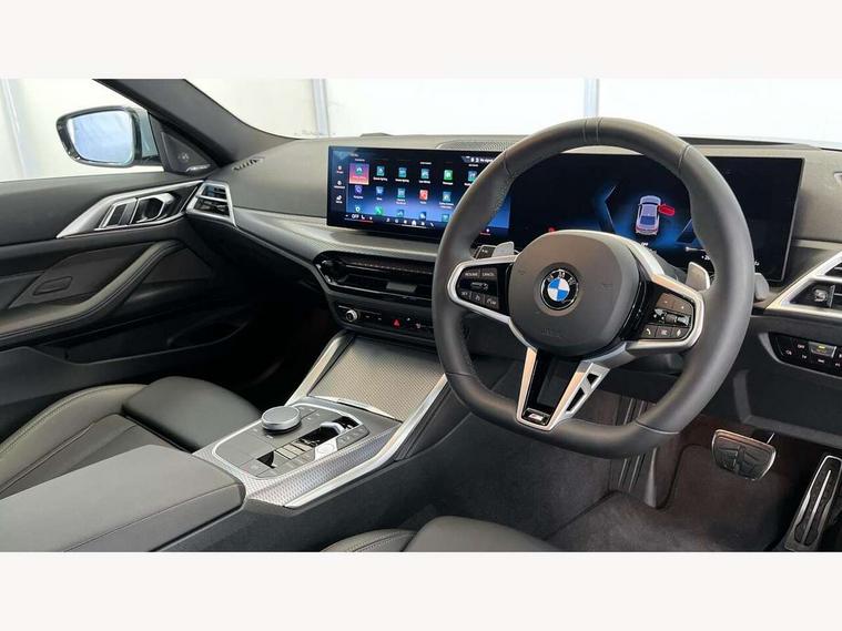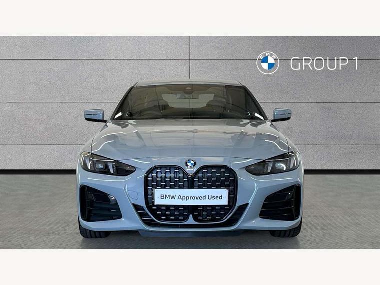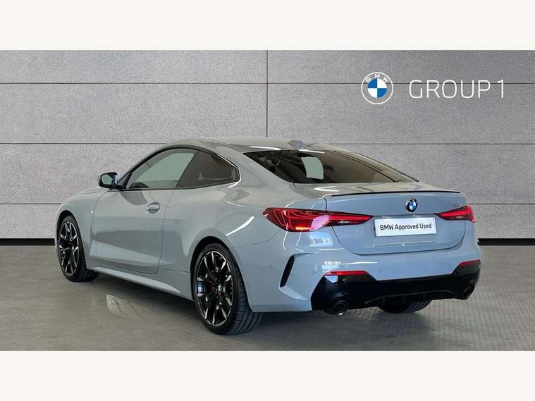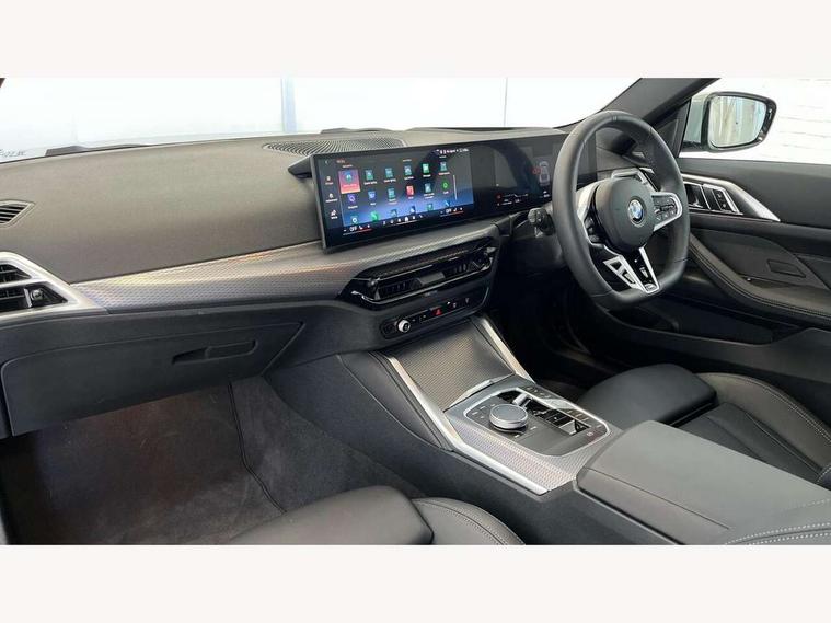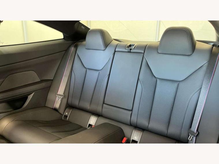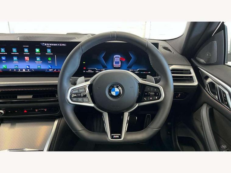 Active guard plus, Attentiveness assist, Auto start-stop, Bluetooth hands free facility with USB audio interface with audio streaming, BMW ConnectedDrive online services, BMW iDrive controller on centre console, BMW Live Cockpit Plus Nav-12.3" instrument&14.9" control Widescreen curved display/Intelligent Voice Assist/iDrive touch/Access 3rd party app/4G LTE, BMW service history, BMW Teleservices, Brake pad wear indicator in front and rear, Check Control warning system for monitoring of lights and door/luggage compartment open warning, Condition based service, Electric power steering with Servotronic steering optimised at all speed ranges, Gearshift time display in manual mode, Instrument cluster with speedometer with mph readout, tachometer, fuel gauge and oil temperature gauge, Integrated owners handbook, Language version English, Oil sensor for level and grade, warning by check control system, On board computer - average speed, fuel consumption, outside temp display with acoustic warning, clock/date, service interval, odometer/trip meter, Optimum shift indicator, Run flat indicator, Shifting point display, Variable sport steering, 8 speed automatic steptronic transmission with gearshift paddles, Balanced 50/50 weight distribution, Double joint spring strut front axle, Double VANOS, Drive performance control - ECO PRO, comfort and sport modes, High precision injection, Low centre of gravity, Petrol Particulate Filter, Stroke dependent dampers, VALVETRONIC engine management, 1x USB type A with data transfer and 1.5 Amp charging function in the centre console, 1x USB type C with 3 Amp charging function in the front centre armrest, DAB tuner, Electronic service booklet, Personal eSim, Acoustic glazing, Automatic headlight beam throw control with load dependent regulating reaction, dynamic compensation of braking dive and acceleration squat, Automatic windscreen wipers and automatic headlight, Automatically dimming electrochromatic rear view mirror, BMW emblem on engine compartment lid and tailgate, BMW radiator grille with mesh grille, end face of the nuggets in aluminium matt and frame in chrome matt, Body colour fuel filler flap, Body colour roof fin, Bonnet and tailgate badge, Brushed aluminium inserts in the front door sill finishers with BMW designation, Door sill strips, Dynamic brake lights, Electric windows - front and rear, with open/close fingertip control, anti trap facility and comfort closing function all round, Exterior mirrors - electrically folding with anti-dazzle, Fading support, Follow me home headlights, Front and rear bumper system, Front apron plastic in body colour, Green tinted heat protection glazing, High gloss shadow line exterior trim, Illuminated bow type door handles in body colour drivers side with door lock, Interior rear view electrochromatic mirror with automatic anti dazzle function, LED 3rd brake light, LED daytime running lights, LED front fog lights, LED front indicators, Licence plate panel integrated into front bumper and tailgate, Lightweight engineering, Low and high beam headlights in Bi-LED, M designation on front side panels, left and right, M rear boot spoiler, One piece front bumper cover including towing eye cover in body colour, Preparation for high beam assistant, Rear boot, Reversing light, Side frame trim strip black matt, Two part LED tailights in L-shape with components in smoked glass, brake light, LED turn indicator and rear fog light, Visible exhaust tailpipe finisher, Visible VIN plate, Welcome lights in interior and door handle area, Widened track and increased camber values for max transverse dynamics, agility and steering precision, Window recess finisher strip in matt black, Windscreen wipers with integrated heated washing jets, 12V power socket in front centre console, 2 front cupholder in centre console with clamping elements and matt black inlay, 2 Rear seat headrests, 2 seat bench in second row, 2 zone automatic air conditioning, 3 spoke flat bottom M sport leather multifunction steering wheel, 4 pieces lashing eyelets in luggage compartment, 40:20:40 split folding rear seat and rear centre armrest with two cupholders, Anthracite headlining, Armrest integrated in front and rear door trim + front centre console armrest, Battery in luggage compartment, BMW ID, Extended storage - Luggage compartment partition net on left side trim panel, Bag hook on both sides of the luggage compartment, Four grab handles integrated in roof lining, Front and rear door pockets, Front and rear reading lights, Front footwell lights, Heated driver and front passenger seats, Height adjustable front headrests, Height adjustable mechanically and infinitely variable steering column, Illuminated armrest storage compartment, Illuminated glove compartment with separate small compartment, Luggage compartment light, Make-up mirror lights, Single front passenger seat, Storage compartment in rear centre console, Sunvisors with illuminated vanity mirrors and ticket pocket, Through load system, Toolkit located in luggage compartment, Velour front floor mats, Ambient lighting pack - 4 Series, Connected professional package - 4 Series, M sport exterior styling pack - 4 Series, Park assist pack - 4 Series, 2 x 3-point rear seatbelts, Battery safety cut-off, BMW emergency call, Brake energy regeneration, Braking pre-tensioning, Child seat ISOFIX attachment for the two outer rear seats, Coasting in idle in ECO PRO mode, Cornering brake control (CBC), Crash sensor activating of airbags, Unlocking doors, hazard warning lights, interior light, safety battery terminal, Driver and front passenger side airbags, integrated in the door side seat backrest bolsters for all seat variants, Driver/Front Passenger airbags, Dry braking, Dynamic brake control, Dynamic stability control + (DSC+) - Anti-lock Braking System (ABS) with brake assist and cornering brake control + Automatic Stability Control (ASC), Dynamic Traction Control - DTC, Electric parking brake including automati