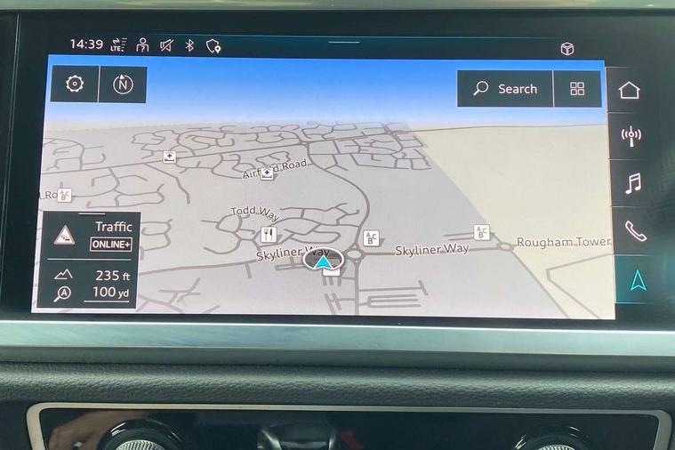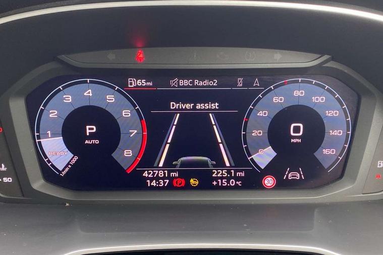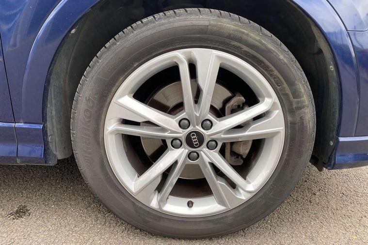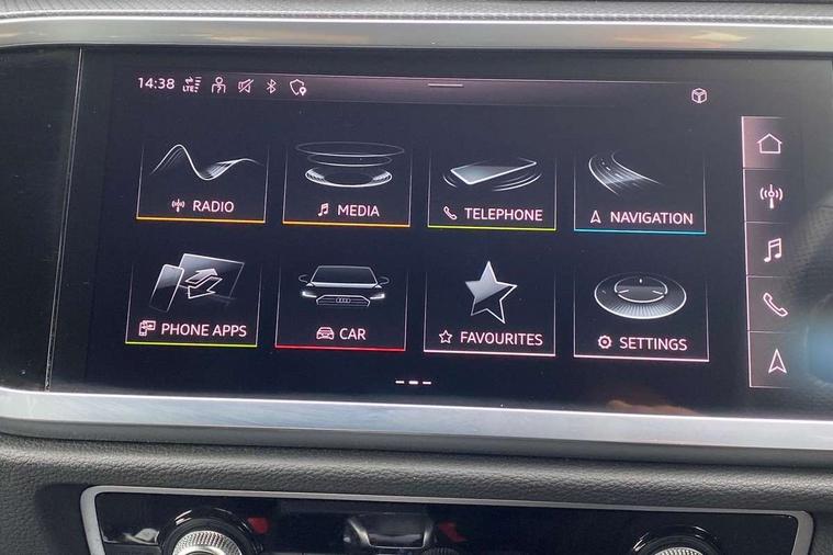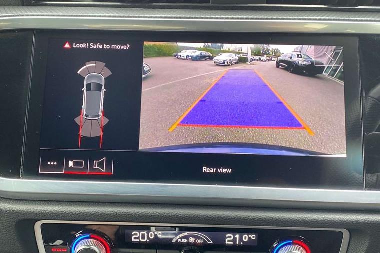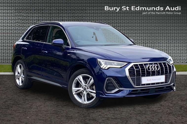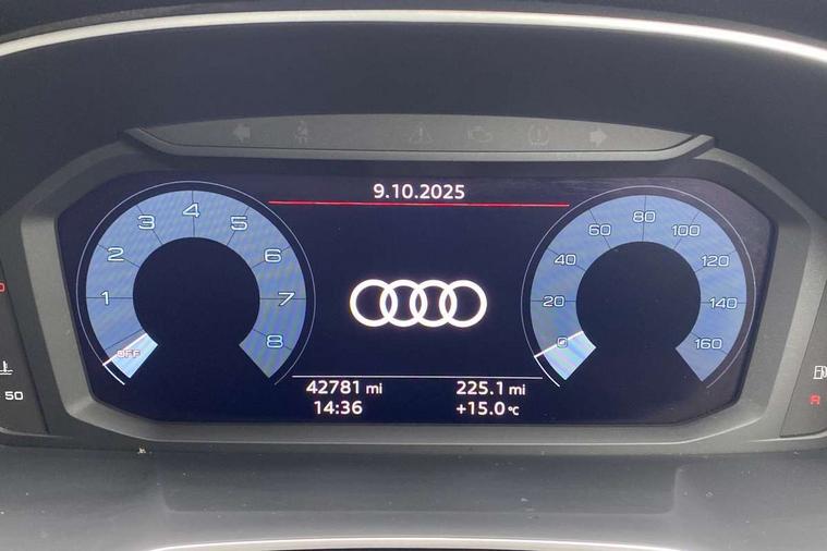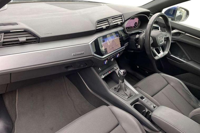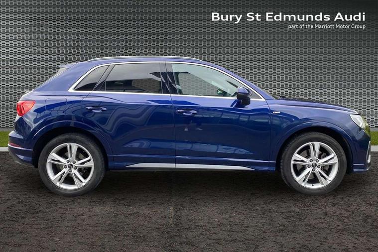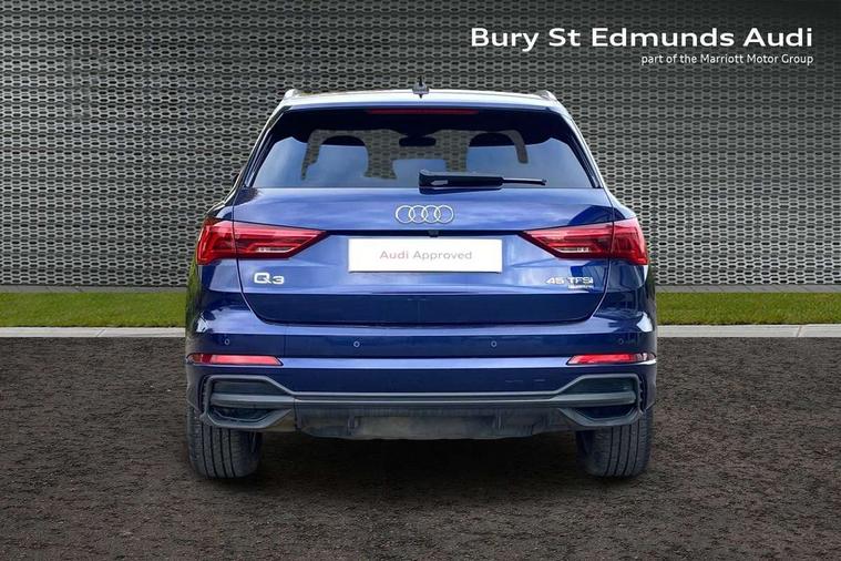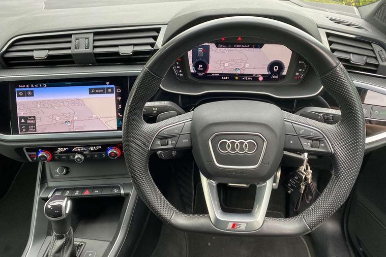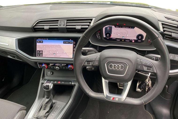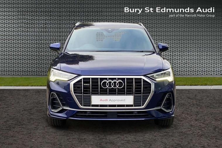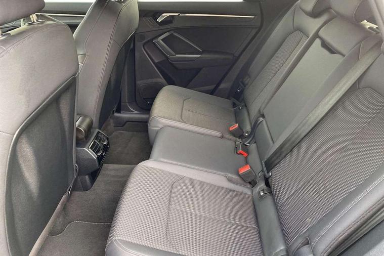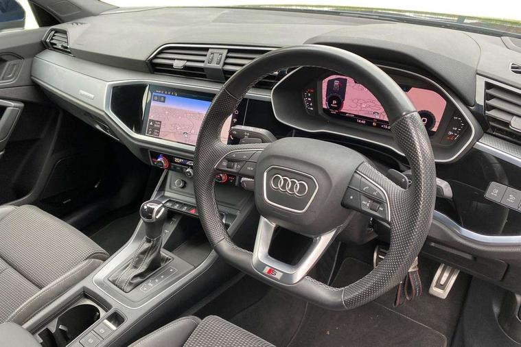Amazon alexa Integration, Audi drive select, Audi lane departure warning, Audi Virtual Cockpit - 10.25" display, Bluetooth interface, Camera based traffic sign recognition, Legal emergency call, MMI Navigation Plus with high resolution 10.1 inch touchscreen colour display, Power operated tailgate, Progressive steering, Service interval indicator, Smartphone interface includes wireless Apple carplay/Android Auto, Start stop system with recuperation, Voice control system with natural language interaction, Sports suspension, 2 USB-C ports with charge and data functions, 6 passive loudspeakers, DAB digital radio module, Acoustic windscreen, Aluminium roof rails, Aluminium window trim, Auto dimming frameless rear view mirror, Body colour front spoiler blade, Body coloured bumpers, Electrically folding, adjustable and heated door mirrors with integrated LED side indicators and kerb view function for passenger side, Front and rear electric windows, Front fog lights, Front side air inlets in matt platinum grey, Grille vertical bars in aluminium silver/Matt, High gloss black finish B and C pillars, LED Dynamic rear indicators, LED headlights with LED daytime running lights, LED rear lights, LED third brake light, Privacy glass dark tinted rear and rear-side windows (from B-pillar backwards), Rain and light sensors, Rear diffuser grille in grained matt black, Rear diffuser strip in matt titanium black, Rear side wing doors, Rear wiper, S line badges on front wings, S Line front and rear bumpers, Side skirt insert in matt Platinium grey, Titanium black radiator grille, Variable front intermittent wipers, 12V socket in rear centre console, 3 seat bench in 2nd row, 40:20:40 folding with manual adjustment for 60:40 forwards/backwards position and backrest angle, Adjustable rear seat bench/backrest with centre armrest and cupholder, Black cloth headlining, Dual zone electronic climate control, Front and rear black floor mats with contrast stitching in rock grey, Front and rear headrests, Front and rear roof module including reading lights, Front centre armrest, Glove compartment lighting, Height and reach adjustable steering wheel, Illuminated door sill trims with S logo, ISOFIX child seat mounting for front passenger with airbag deactivation and outer rear seat including top tether attachment point for outer rear seats, Luggage compartment light, Manual front seats with height adjustment, Perforated leather gearknob, Single front passenger seat, Stainless steel luggage compartment sill finisher, Stainless steel pedals, Ambient lighting pack - Q3, Non smoking pack - Q3, 3x3 point rear seatbelts, 6 airbags - Driver, front passenger, curtain and side windows, Audi pre-sense front with pedestrain and cyclist recognition, Electrically operated child locks on rear doors, Electromechanical parking brake, Electronic stabilisation control including ABS, ASR and EDL, Front seatbelt reminder, Hill descent control, Hill hold assist, Pre sense basic, Seatbelt monitoring, Tyre pressure warning, Warning triangle and first aid kit, Anti theft alarm, Anti theft wheel bolts, Immobiliser, Remote central locking, Dark matt brushed aluminium inlay, Detail dashboard around MMI touch colour display in glass look, black with surround in aluminium look, Leatherette door armrest,