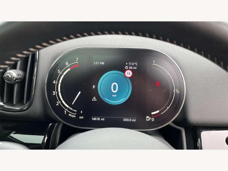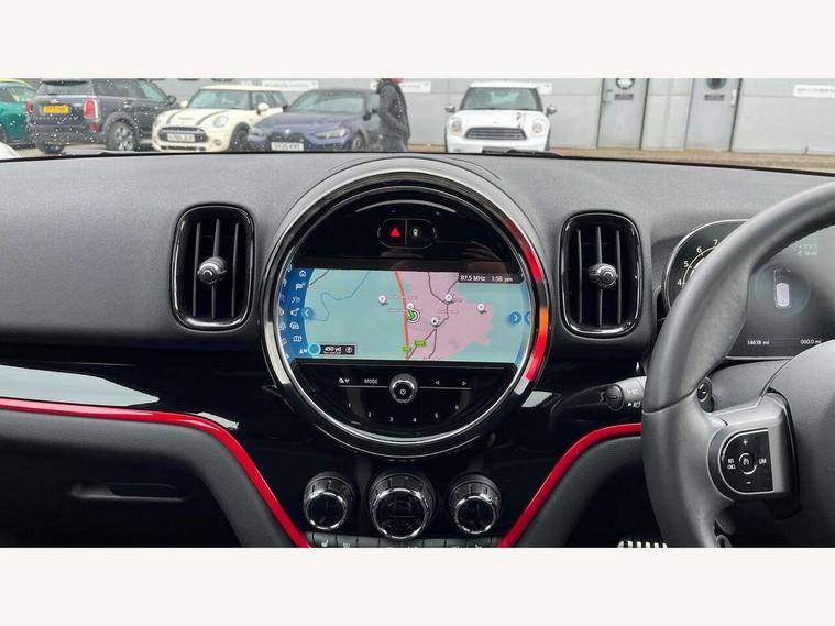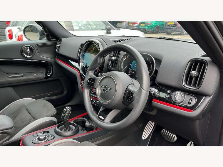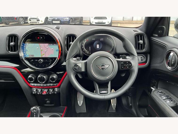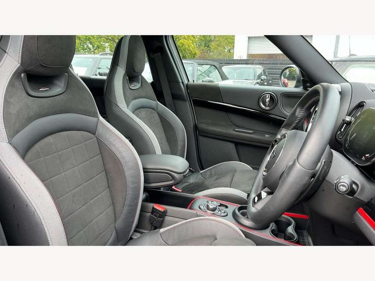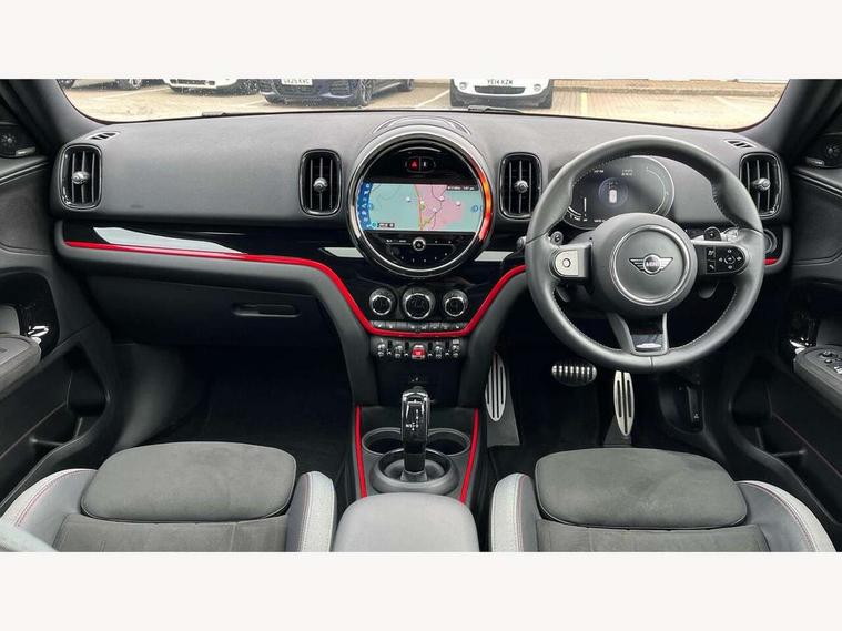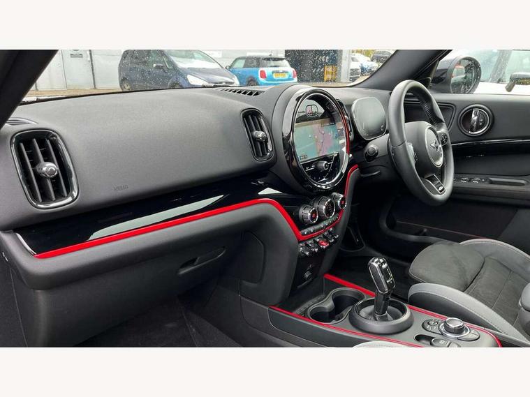 Active Guard incl speed limiting and lane departure functions with auto steering, and front collision warning with brake intervention, Automatic start/stop function with brake energy recuperation, Compatible mobile phone bluetooth with audio streaming, Cruise control with brake assist, Electro-mechanical speed dependant steering assistance, Instrument cluster, MINI Driving Modes - centre toggle switch to control driving setting (sport, mid and green), Mini E-call, On board computer, Double Vanos system, Fully variable valve control, High precision injection, Performance Control, Steptronic sport transmission with double clutch and steering wheel paddles, FM tuner and DAB digital radio, 3rd brake light, Bonnet scoop, Chrome fuel filler cap, Day time driving lights, Dynamic brake lights, Electric windows, Heated rear window, Heated windscreen washer jets, John Cooper Works - aerodynamic kit (front and rear apron, spoiler), front and rear sport bumpers and part-painted side sills with door sill finishers, John Cooper Works Logo, LED fog lights, Metal door sill strips with Cooper S imprint, Model logo, Model logo on Tailgate, Rain sensor with auto headlights, Rear fog lights, Rear side wing doors, Rear window wiper, Side scuttle panel with integrated indicator, Split rear doors, Sun/heat protection glass, White indicator lenses, 12V socket in centre console, 3 seat bench in 2nd row, 360L luggage compartment capacity, 4 lashing eyes in luggage compartment, 40:20:40 split folding rear seats, Anthracite headlining with grab handles and clothes hooks, Chrome interior highlights, Colour line - Carbon black, Cupholders, English handbook, Front headrests, Glove compartment, Height and length steering column adjustment, Interior lighting with 12 basic colours selectable via toggle switch in roof, Isofix rear child seat preparation, LED reading lights, vanity mirror lights, front foot well light and spotlight on front seats, Mini John Cooper Works leather gearshift lever and handbrake gaiters, Multifunction steering wheel, Nappa leather steering wheel with MINI Yours logo, Rear headrests, Single front passenger seat, Stainless steel pedals and foot rest, Storage compartments in doors, Sunvisors with vanity mirrors, Excitement pack - Countryman, Navigation pack - Countryman, Piano black exterior pack - Countryman Cooper S/SD/SE/Boardwalk, 2 tone horn, 3 point seatbelts on all seats, 6 Airbags - front, side, head and seat belt tensioners, Anti-lock braking system (ABS), DSC - Dynamic Stability Control, Electronic handbrake, Front and rear disc brakes, Hill start assist, Manual rear child locks, Tyre pressure monitoring system, Alarm system with tilt sensor, monitoring doors, bonnet interior and tailgate, Auto drive away locking, Deadlocking function, Electronic vehicle immobiliser, Locking wheel bolts, Start/stop toggle with keyless go, Piano black JCW interior trim, Tool kit,