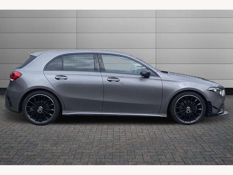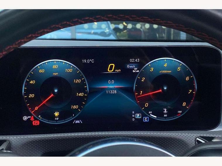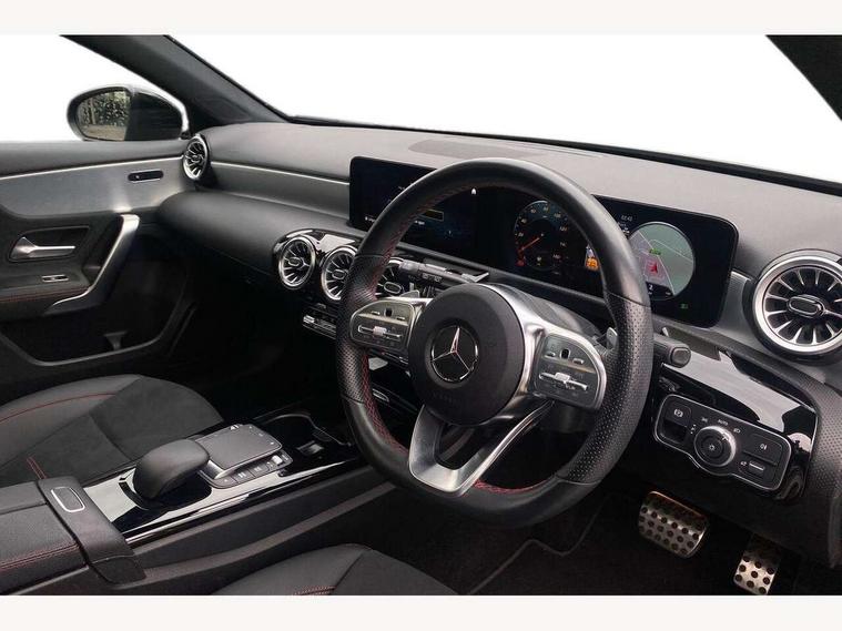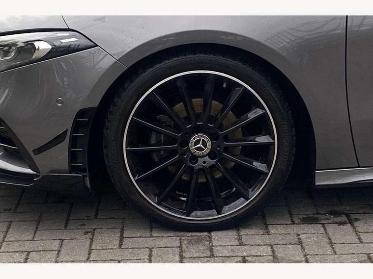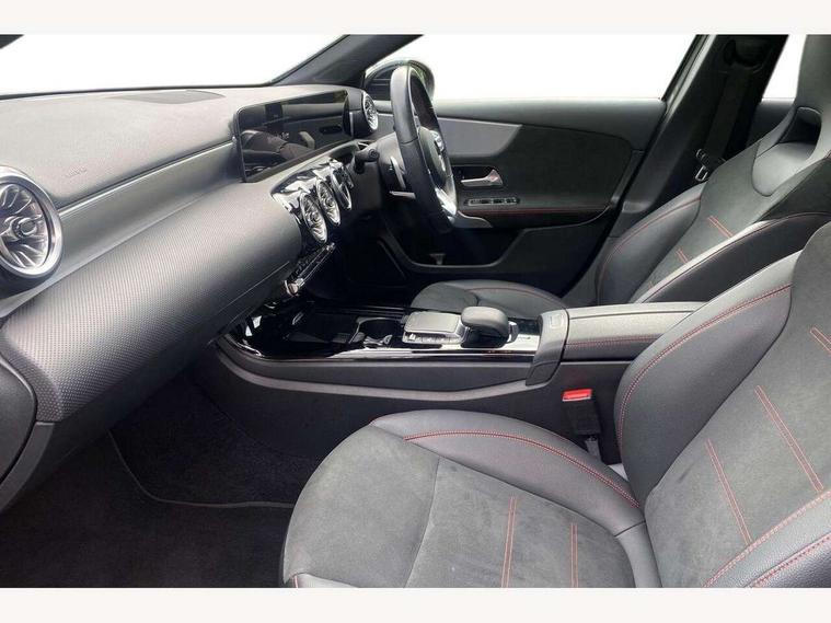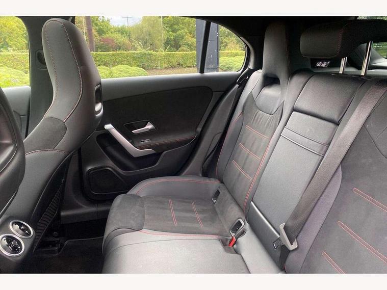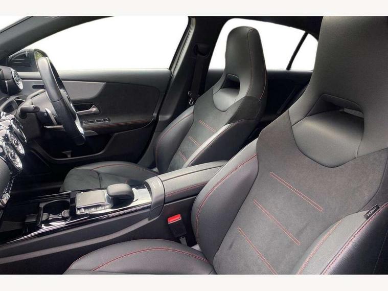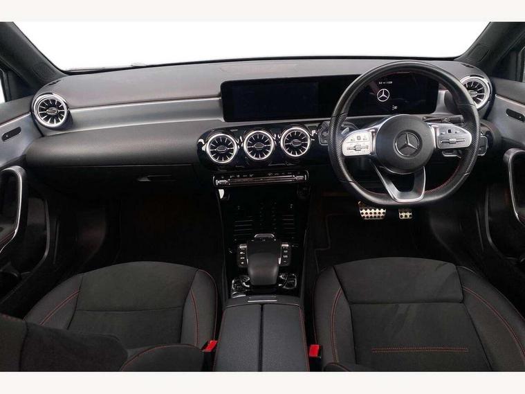 10.25" Digital instrument cluster display screen, 10.25" media display, 180 degree rear view camera with parking guidelines, Active parking assist with visual and audible warning of detected obstacles, Attention assist, Brake pad wear indicator warning light, Car wash mode, Cruise control + speed limiter, Direct steering, Dual bluetooth interfaces, DYNAMIC SELECT with a choice of driving modes (ECO, Comfort, Sport and Individual), ECO start/stop function, Fluid level warning indicator for fuel, oil, coolant and washer fluid, Hard-disk navigation, Hey Mercedes Voice activation, Lamp failure indicator, Lane keeping system, Mercedes me connect including emergency call system, accident recovery, breakdown and maintenance management, Mercedes me remote services, Outside temperature gauge, Owners manual in English, Pre-installation for private car sharing, Preinstallation for Mercedes Benz link, Service indicator (ASSYST), Smartphone integration with Apple CarPlay and Android auto, Speed limit assist, Speed sensitive power steering, Traffic sign assist, Trip computer, Ultrasonic sensors positioned in the front and rear bumpers, Lowered comfort suspension, Rear axle torsion beam, 2 USB ports (type C) in rear stowage compartment and one in front of center console, 6 speakers, DAB Digital radio, MBUX multimedia system with DAB digital radio and touchpad including satellite navigation, Mercedes-Benz sound system - 100W, 4 Electric Front and Rear windows, Adaptive brake lights, AMG bodystyling - Front apron with splitter in chrome, rear apron with chrome trim and chrome visible trim elements in tailpipe, Automatic headlights, Black weather strip, Body colour bumpers, Body colour door handles with chrome inserts, Body colour side skirt, Electric adjustable and heated door mirrors with integrated LED side indicators, Exclusive diamond radiator grille, Exhaust system - Twin visible tailpipes in polished stainless steel, Headlamp assist automatic headlamp activation, Heated glass rear windscreen + timer control, LED daytime running lights, LED High level third brake light, LED tail lamp, Multibeam LED headlights with adaptive highbeam assist plus, Panoramic sliding sunroof, Privacy glass, Radio aerial, Rain sensing windscreen wipers with two sensitivity settings, Rear fog lights, Rear side wing doors, Rear wiper, 3 seat bench in 2nd row, 3 Spoke flat bottom leather multi function steering wheel with perforated leather in grip area, 40:20:40 split folding rear seats, Artico man-made leather/Microfibre Dinamica upholstery with red contrast stitching, Auto Mercedes-Benz child seat recognition sensor, Black air vents with surround in silver chrome, Black roof lining, Brushed stainless steel sports pedals with rubber studs, Controller on centre console with chrome surround, Floor mats with AMG lettering, Front centre armrest with storage compartment, Front seat backs luggage nets, Galvanished gear shift paddles on steering wheel, Heated front seats, Height/reach adjustable steering column, Illuminated Mercedes Benz lettering front door sills with changeable cover, Interior lighting - 64 colour Ambient lighting, Interior mirror with reading lamps in black and frameless, Rear armrest with 2 cupholders, Rear head restraints, Seat occupancy sensor for front passenger seat, Single front passenger seat, Sports seats with integrated headrests, Stowage compartment in centre console with retractable cover, Sunvisors with illuminated vanity mirrors, Touchpad on center console, Twin front cupholders, Two zone thermotronic luxury automatic climate control, Light and sight pack - A Class, Mirror package - A Class, Night pack - A Class Saloon/Hatchback, Seat comfort pack - A Class, 3 rear 3 point seatbelts, ABS with Brake Assist, Active bonnet, Active brake assist includes forward collision warning system with autonomous braking, Adaptive brake assist with hold function and hill start assist, Black seatbelts, Childproof locks manually operated for rear doors and electrically operated for rear power windows, Crash responsive emergency lighting, Driver and passenger head and side airbags, Drivers knee airbag, Dual stage driver/passenger airbags, Electronic parking brake, ESP curve dynamic assist, ESP with ASR, Front and rear seatbelt reminder, Front brake callipers with Mercedes Benz lettering, ISOFIX and top tether child seat fixing points in two outer rear seats, Tyre pressure monitoring system, Warning triangle and first aid kit, Window airbags, Alarm system/interior protection/immobiliser, Keyless entry lock/unlock, Keyless Go, Remote central locking and crash sensor with emergency opening function, Urban guard vehicle protection system with immobiliser and interior protection, Matrix look light longitudinal grain aluminium trim element, 19" multi spoke light alloy wheels painted in black with a high sheen rim flange, Summer tyres, Tirefit sealant kit,