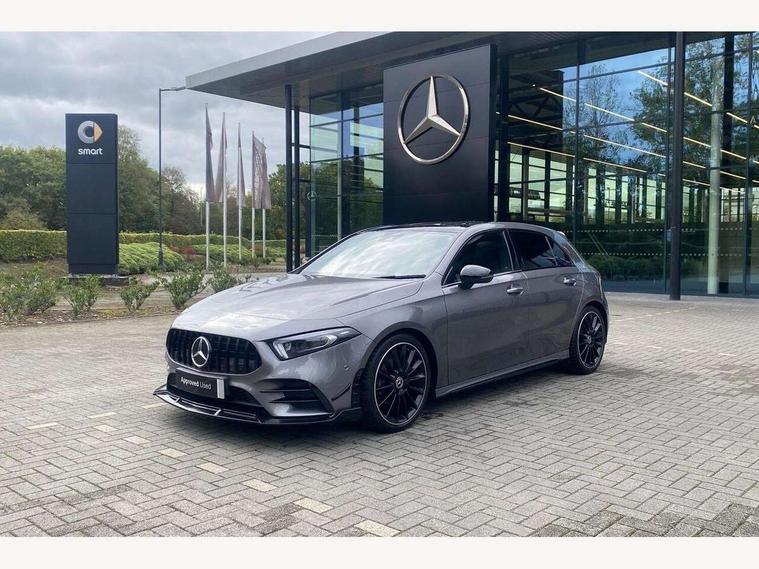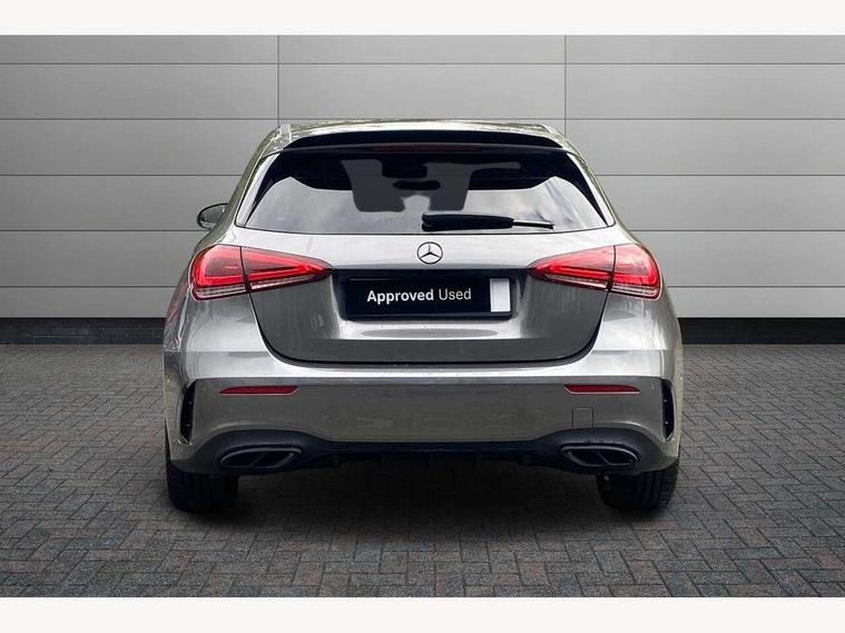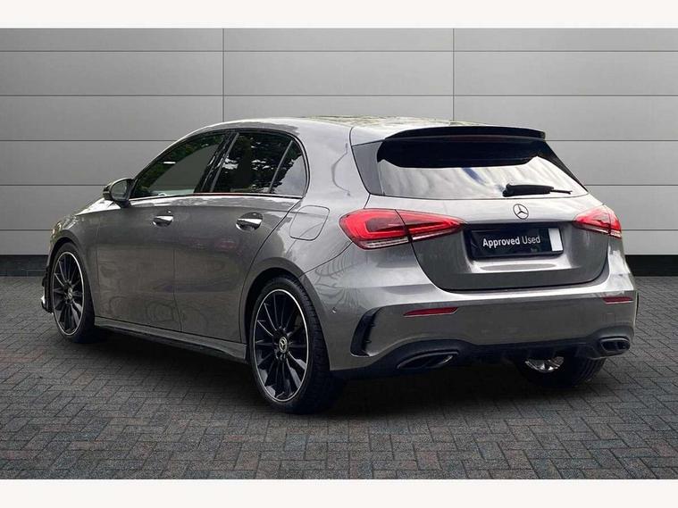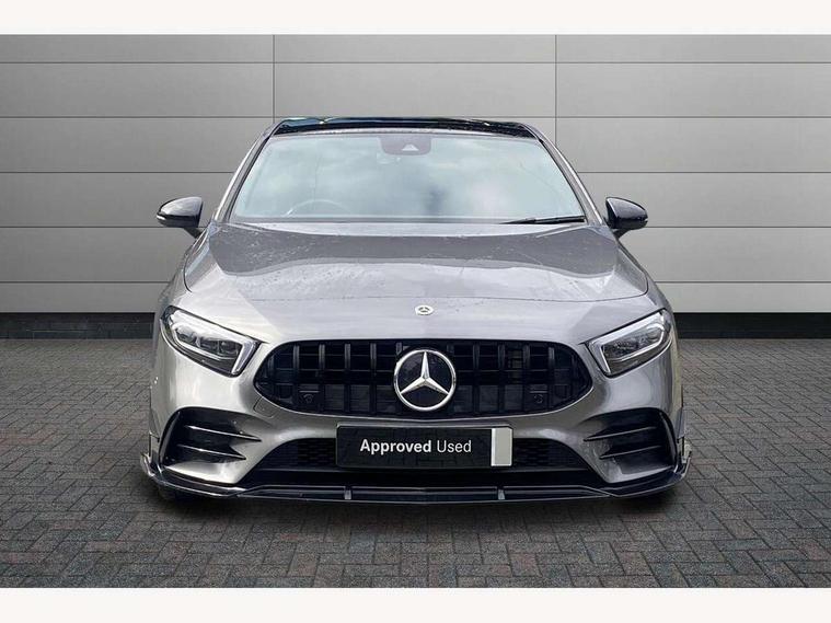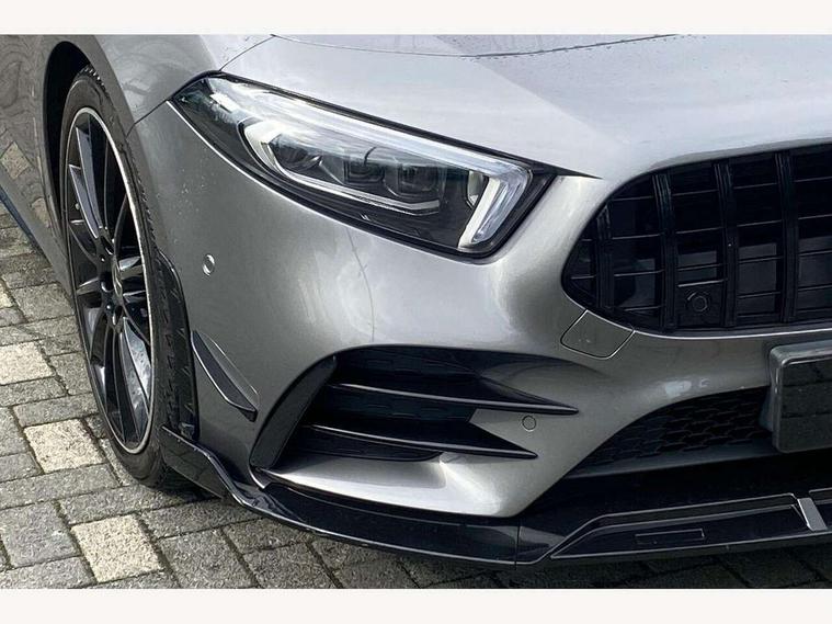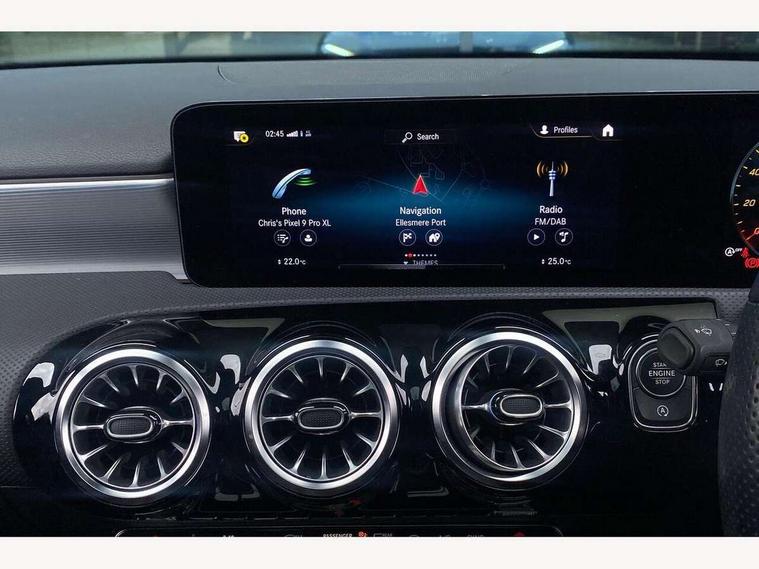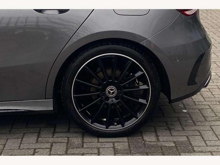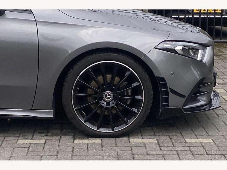 10.25" Digital instrument cluster display screen, 10.25" media display, 180 degree rear view camera with parking guidelines, Active parking assist with visual and audible warning of detected obstacles, Attention assist, Brake pad wear indicator warning light, Car wash mode, Cruise control + speed limiter, Direct steering, Dual bluetooth interfaces, DYNAMIC SELECT with a choice of driving modes (ECO, Comfort, Sport and Individual), ECO start/stop function, Fluid level warning indicator for fuel, oil, coolant and washer fluid, Hard-disk navigation, Hey Mercedes Voice activation, Lamp failure indicator, Lane keeping system, Mercedes me connect including emergency call system, accident recovery, breakdown and maintenance management, Mercedes me remote services, Outside temperature gauge, Owners manual in English, Pre-installation for private car sharing, Preinstallation for Mercedes Benz link, Service indicator (ASSYST), Smartphone integration with Apple CarPlay and Android auto, Speed limit assist, Speed sensitive power steering, Traffic sign assist, Trip computer, Ultrasonic sensors positioned in the front and rear bumpers, Lowered comfort suspension, Rear axle torsion beam, 2 USB ports (type C) in rear stowage compartment and one in front of center console, 6 speakers, DAB Digital radio, MBUX multimedia system with DAB digital radio and touchpad including satellite navigation, Mercedes-Benz sound system - 100W, 4 Electric Front and Rear windows, Adaptive brake lights, AMG bodystyling - Front apron with splitter in chrome, rear apron with chrome trim and chrome visible trim elements in tailpipe, Automatic headlights, Black weather strip, Body colour bumpers, Body colour door handles with chrome inserts, Body colour side skirt, Electric adjustable and heated door mirrors with integrated LED side indicators, Exclusive diamond radiator grille, Exhaust system - Twin visible tailpipes in polished stainless steel, Headlamp assist automatic headlamp activation, Heated glass rear windscreen + timer control, LED daytime running lights, LED High level third brake light, LED tail lamp, Multibeam LED headlights with adaptive highbeam assist plus, Panoramic sliding sunroof, Privacy glass, Radio aerial, Rain sensing windscreen wipers with two sensitivity settings, Rear fog lights, Rear side wing doors, Rear wiper, 3 seat bench in 2nd row, 3 Spoke flat bottom leather multi function steering wheel with perforated leather in grip area, 40:20:40 split folding rear seats, Artico man-made leather/Microfibre Dinamica upholstery with red contrast stitching, Auto Mercedes-Benz child seat recognition sensor, Black air vents with surround in silver chrome, Black roof lining, Brushed stainless steel sports pedals with rubber studs, Controller on centre console with chrome surround, Floor mats with AMG lettering, Front centre armrest with storage compartment, Front seat backs luggage nets, Galvanished gear shift paddles on steering wheel, Heated front seats, Height/reach adjustable steering column, Illuminated Mercedes Benz lettering front door sills with changeable cover, Interior lighting - 64 colour Ambient lighting, Interior mirror with reading lamps in black and frameless, Rear armrest with 2 cupholders, Rear head restraints, Seat occupancy sensor for front passenger seat, Single front passenger seat, Sports seats with integrated headrests, Stowage compartment in centre console with retractable cover, Sunvisors with illuminated vanity mirrors, Touchpad on center console, Twin front cupholders, Two zone thermotronic luxury automatic climate control, Light and sight pack - A Class, Mirror package - A Class, Night pack - A Class Saloon/Hatchback, Seat comfort pack - A Class, 3 rear 3 point seatbelts, ABS with Brake Assist, Active bonnet, Active brake assist includes forward collision warning system with autonomous braking, Adaptive brake assist with hold function and hill start assist, Black seatbelts, Childproof locks manually operated for rear doors and electrically operated for rear power windows, Crash responsive emergency lighting, Driver and passenger head and side airbags, Drivers knee airbag, Dual stage driver/passenger airbags, Electronic parking brake, ESP curve dynamic assist, ESP with ASR, Front and rear seatbelt reminder, Front brake callipers with Mercedes Benz lettering, ISOFIX and top tether child seat fixing points in two outer rear seats, Tyre pressure monitoring system, Warning triangle and first aid kit, Window airbags, Alarm system/interior protection/immobiliser, Keyless entry lock/unlock, Keyless Go, Remote central locking and crash sensor with emergency opening function, Urban guard vehicle protection system with immobiliser and interior protection, Matrix look light longitudinal grain aluminium trim element, 19" multi spoke light alloy wheels painted in black with a high sheen rim flange, Summer tyres, Tirefit sealant kit,