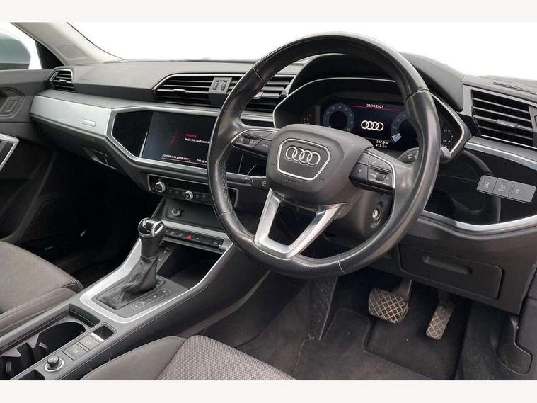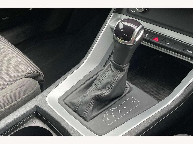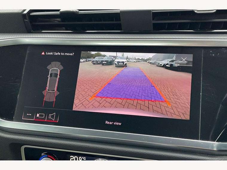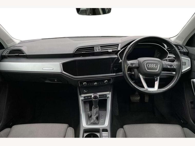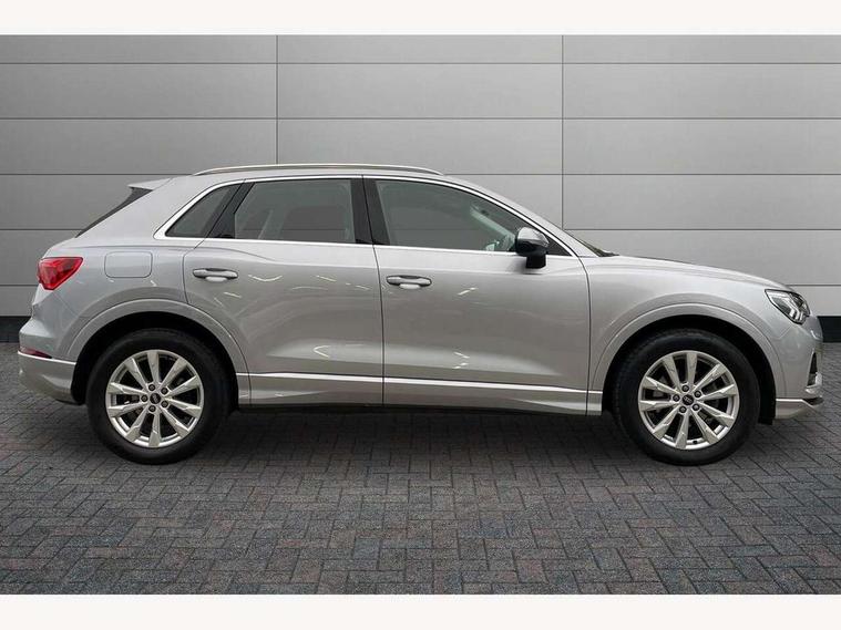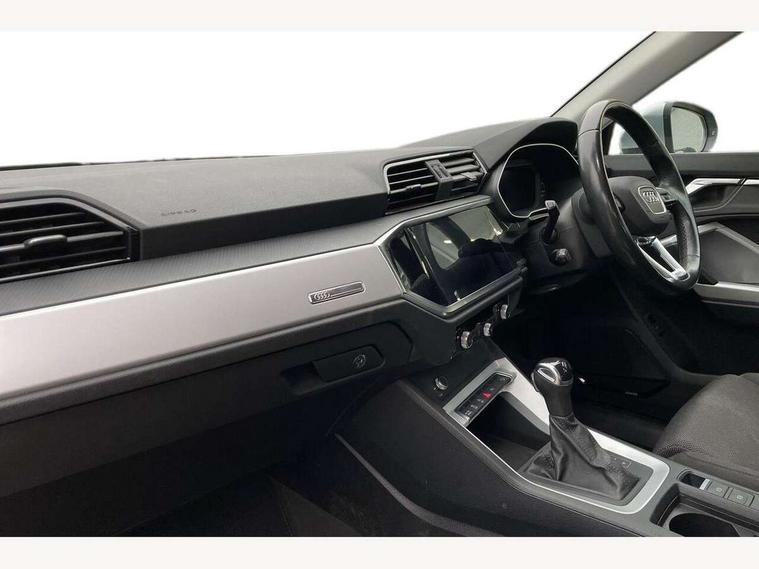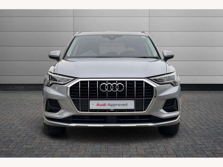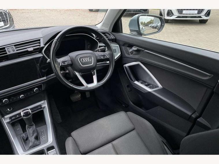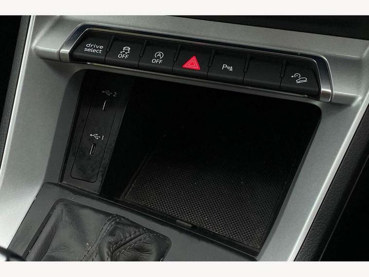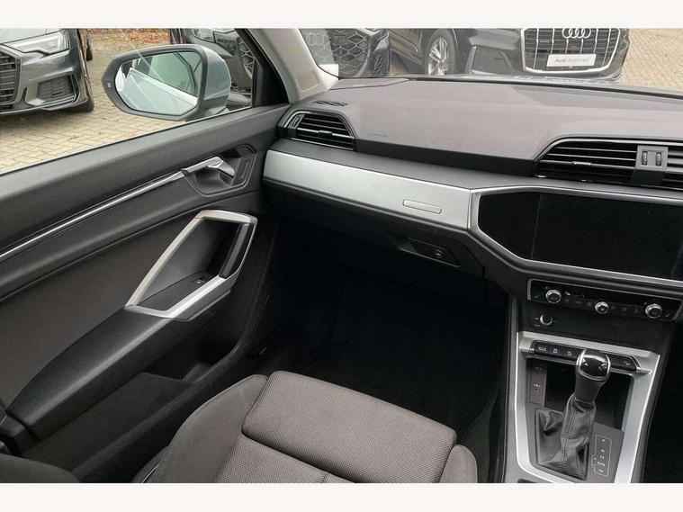 Amazon alexa Integration, Audi connect safety and service (e-call), Audi drive select, Audi lane departure warning, Audi Virtual Cockpit - 10.25" display, Bluetooth interface, Camera based traffic sign recognition, MMI Navigation Plus with high resolution 10.1 inch touchscreen colour display, Power operated tailgate, Progressive steering, Service interval indicator, Smartphone interface includes wireless Apple carplay/Android Auto, Start stop system with recuperation, Voice control system with natural language interaction, 48V Mild hybrid technology, Standard suspension, 2 USB-C ports with charge and data functions, 6 passive loudspeakers, DAB digital radio module, Acoustic windscreen, Aluminium roof rails, Aluminium window trim, Auto dimming frameless rear view mirror, Body coloured bumpers, Electrically folding, adjustable and heated door mirrors with integrated LED side indicators and kerb view function for passenger side, Front and rear electric windows, Front fog lights, Front side air inlets in matt selenite silver, Front spoiler in matt selenite silver, Grille vertical bars in aluminium silver/Matt, High gloss black finish B and C pillars, LED headlights with LED daytime running lights and dynamic rear indicator, LED rear lights, Rain and light sensors, Rear diffuser strip in matt selenite silver, Silver chrome grille surround, Titanium black radiator grille, 12V socket in rear centre console, 3 spoke multi-function leather steering wheel, 40:20:40 folding with manual adjustment for 60:40 forwards/backwards position and backrest angle, Aluminium door sill trims, Dual zone electronic climate control, Front and rear floor mats, Front and rear headrests, Front and rear roof module including reading lights, Front centre armrest, Glove compartment lighting, Height and reach adjustable steering wheel, ISOFIX child seat mounting for front passenger with airbag deactivation and outer rear seat including top tether attachment point for outer rear seats, Luggage compartment light, Lunar silver cloth headlining, Manual front seats with height adjustment, Stainless steel luggage compartment sill finisher, Non smoking pack - Q3, 3x3 point rear seatbelts, 6 airbags - Driver, front passenger, curtain and side windows, Audi pre-sense front with pedestrain and cyclist recognition, Electrically operated child locks on rear doors, Electromechanical parking brake, Electronic stabilisation control including ABS, ASR and EDL, Hill descent control, Hill hold assist, Pre sense basic, Seatbelt monitoring, Tyre pressure warning, Warning triangle and first aid kit, Anti theft alarm, Anti theft wheel bolts, Remote central locking, Detail dashboard around MMI touch colour display in glass look, black with surround in aluminium look, Micrometallic silver inlay, Tool kit, Tyre repair kit,