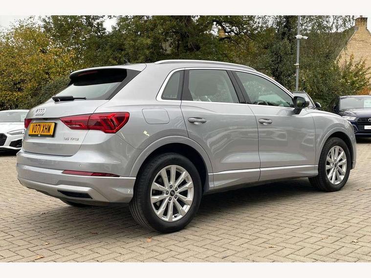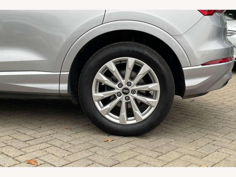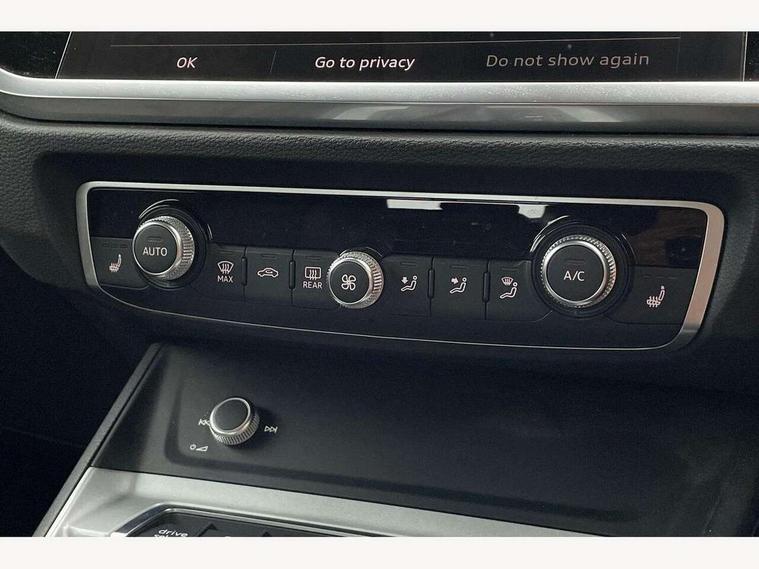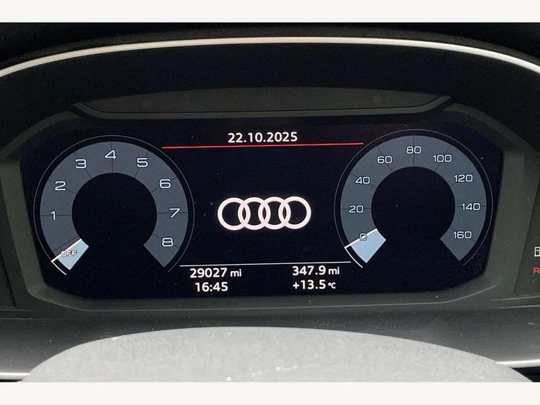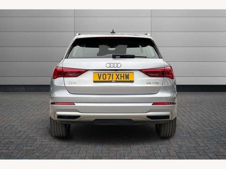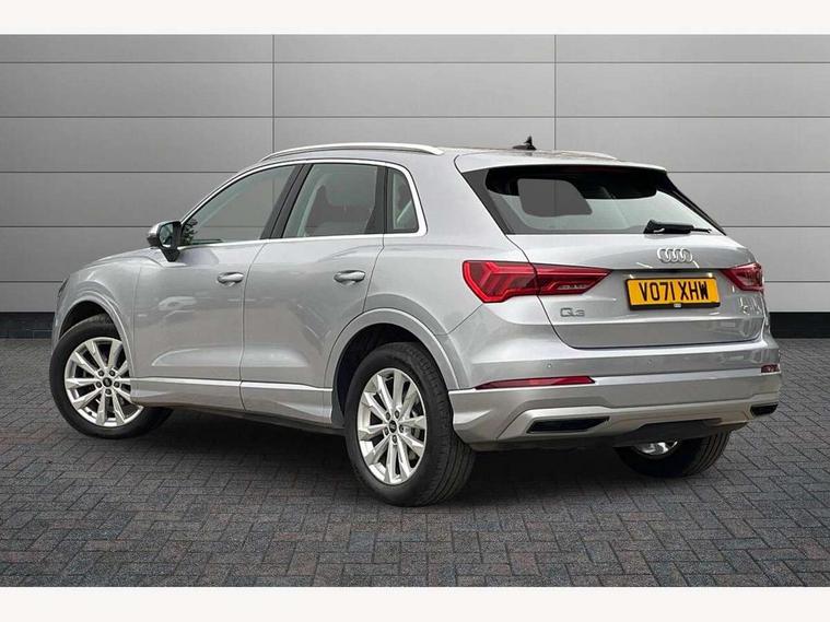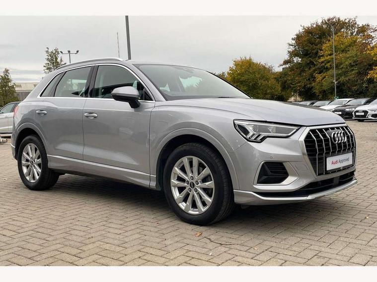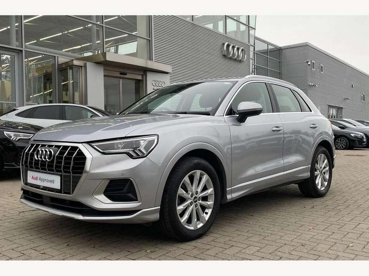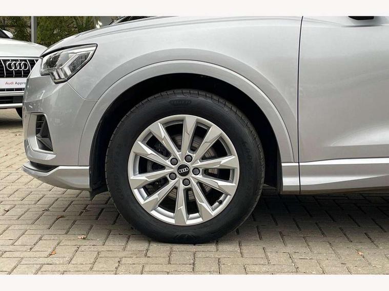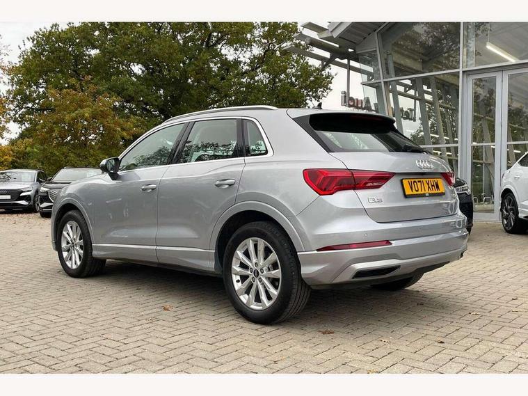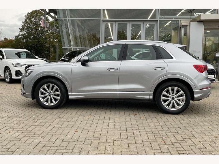 Amazon alexa Integration, Audi connect safety and service (e-call), Audi drive select, Audi lane departure warning, Audi Virtual Cockpit - 10.25" display, Bluetooth interface, Camera based traffic sign recognition, MMI Navigation Plus with high resolution 10.1 inch touchscreen colour display, Power operated tailgate, Progressive steering, Service interval indicator, Smartphone interface includes wireless Apple carplay/Android Auto, Start stop system with recuperation, Voice control system with natural language interaction, 48V Mild hybrid technology, Standard suspension, 2 USB-C ports with charge and data functions, 6 passive loudspeakers, DAB digital radio module, Acoustic windscreen, Aluminium roof rails, Aluminium window trim, Auto dimming frameless rear view mirror, Body coloured bumpers, Electrically folding, adjustable and heated door mirrors with integrated LED side indicators and kerb view function for passenger side, Front and rear electric windows, Front fog lights, Front side air inlets in matt selenite silver, Front spoiler in matt selenite silver, Grille vertical bars in aluminium silver/Matt, High gloss black finish B and C pillars, LED headlights with LED daytime running lights and dynamic rear indicator, LED rear lights, Rain and light sensors, Rear diffuser strip in matt selenite silver, Silver chrome grille surround, Titanium black radiator grille, 12V socket in rear centre console, 3 spoke multi-function leather steering wheel, 40:20:40 folding with manual adjustment for 60:40 forwards/backwards position and backrest angle, Aluminium door sill trims, Dual zone electronic climate control, Front and rear floor mats, Front and rear headrests, Front and rear roof module including reading lights, Front centre armrest, Glove compartment lighting, Height and reach adjustable steering wheel, ISOFIX child seat mounting for front passenger with airbag deactivation and outer rear seat including top tether attachment point for outer rear seats, Luggage compartment light, Lunar silver cloth headlining, Manual front seats with height adjustment, Stainless steel luggage compartment sill finisher, Non smoking pack - Q3, 3x3 point rear seatbelts, 6 airbags - Driver, front passenger, curtain and side windows, Audi pre-sense front with pedestrain and cyclist recognition, Electrically operated child locks on rear doors, Electromechanical parking brake, Electronic stabilisation control including ABS, ASR and EDL, Hill descent control, Hill hold assist, Pre sense basic, Seatbelt monitoring, Tyre pressure warning, Warning triangle and first aid kit, Anti theft alarm, Anti theft wheel bolts, Remote central locking, Detail dashboard around MMI touch colour display in glass look, black with surround in aluminium look, Micrometallic silver inlay, Tool kit, Tyre repair kit,