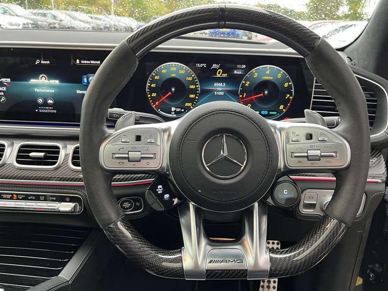AMG track pace, Attention assist, Brake wear warning display, Cockpit display 12.3" widescreen digital instrument cluster, Direct steer speed sensitive steering, DYNAMIC SELECT with a choice of driving modes (ECO, Comfort, Sport and Individual), Easy-pack tailgate - Powered opening/closing automatically, ECO start/stop function, Geofencing, Hard-disk navigation, Head up Display, Hey Mercedes Voice activation, High resolution 12.3" multimedia colour display, Instrument cluster with AMG menu including RACETIMER and AMG start-up display, Mercedes me connect including emergency call system, accident recovery, breakdown and maintenance management, Outside temperature display, Pre-installation for private car sharing, Remote boot release, Service indicator (ASSYST), Smartphone integration with Apple CarPlay and Android auto, Status display for rear seat belts in instrument cluster, Traffic Sign Assist, Traffic sign recognition including wrong way warning function and display of posted speed limits in the instrument cluster, Trip computer in multifunction display showing current fuel consumption, Wireless charging system for mobile devices, 85 litre fuel tank, Agility control suspension with selective damping system and lowered by 15mm, AMG ride control+ sports suspension based on Air body control air suspension with Adaptive damping system, EQ Boost starter alternator, Petrol Particulate Filter (PPF), Additional USB connection, Burmester surround sound system, DAB Digital radio, Dual bluetooth interface, 2 USB ports (type C), Hard disk navigation with MBUX multimedia system, Adaptive brake lights, Adaptive high beam assist, Aerial for GPS, Aluminium look, illuminated running boards with rubber studs, AMG bodystyling front and rear aprons and side skirts in polished aluminium, AMG performance exhaust system, AMG specific radiator grille, BITURBO 4MATIC lettering on front wings, Body coloured bumpers, Electric windows with one touch opening/closing and obstruction sensors, Exterior mirrors heated and electronically adjustable, Front green tinted glass, Illuminated front door sill panels with "AMG" lettering, LED rear lights, Multi beam LED headlights, Panoramic sunroof, Privacy glass - heat insulating dark tinted glass, Radiator grille with integrated star and single louvre in matt iridium silver with chrome trim, Radio aerial integrated into rear window, Rain sensing windscreen wipers, Rear wiper, Roof rail system, Top surround of side windows in polished aluminium, Visible twin pipe exhaust system integrated into bumper, Waistline in polished aluminium, 3 spoke AMG multifunction steering wheel with touch control buttons, trimmed in black nappa leather with DINAMICA grip area, flattened bottom section, 4 way adjustable front head restraints and 2 way rear head restraints, 40:20:40 split folding rear seats, AMG brushed stainless steel sports pedals with rubber studs, AMG Exclusive Nappa leather upholstery, AMG floor mats with AMG lettering, AMG front sports seats, Automatic child seat recognition sensor, Central stowage compartment with 12 V socket in centre console, Chrome door pins, Climatised front seats, Comfort front headrests, Courtesy lights in rear grab handles with reading light functionality, Dinamica microfibre roof liner in black, Electric height/reach adjustable steering column, Four way fully front electric seat adjustment, Front centre armrest with stowage compartment and illuminated grab handles, Gearshift paddles on steering wheel, Glasses compartment in overhead control panel, Glove compartment - lockable, air conditioned and illuminated, Heated front seats, Interior lighting - 64 colour Ambient lighting, Multicontour front seats, Nappa leather upper dash trim, Seat occupancy sensor for front passenger seat, Second row three seats, Sports steering wheel, Sunvisors with illuminated vanity mirrors, Thermotronic automatic 4 zone climate control, Touchpad, Airmatic package - GLE, AMG night pack - GLE 53/63, Anti theft Protection package - GLE, Driving assistance plus pack - GLE 63, Energizing comfort package - GLE, Interior chrome package - GLE, Keyless go comfort package - GLE, Memory package - GLE, Mirror package - GLE, Parking package with 360 camera - GLE, Active bonnet, Adaptive brake system with HOLD function and brake drying in the wet, Airbags - driver and front passenger, with extended adaptivity for front passenger airbag, Airbags - sidebag for driver and front passenger with combined thorax/pelvis bag, Airbags - windowbags, AMG high performance composite braking system, Anti-lock braking system (ABS), Childproof locks manually operated for rear doors and electrically operated for rear power windows, Drivers knee airbag, Electronic parking brake, Electronic Stability Programme (ESP), ISOFIX child seat attachment points two outer rear seats, Pre-Safe anticipatory safety system, Red brake callipers with AMG lettering, Red seat belts, Three point rear seat belts, Tyre pressure monitoring system and loss warning system, Warning triangle and first aid kit, Alarm system/interior protection/immobiliser, Central locking with interior switch, automatic locking and crash sensor with emergency opening function, Chrome surround electric key, Keyless entry, Dashboard and door, AMG carbon fibre, Trim - Centre console, AMG carbon fibre trim, 22" AMG cross spoke light alloy wheels painted in matt black with high sheen rim flange, Summer tyres with noise reducing absorber, TIREFIT with tyre inflation compressor,