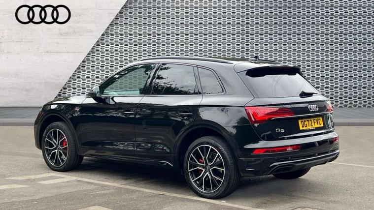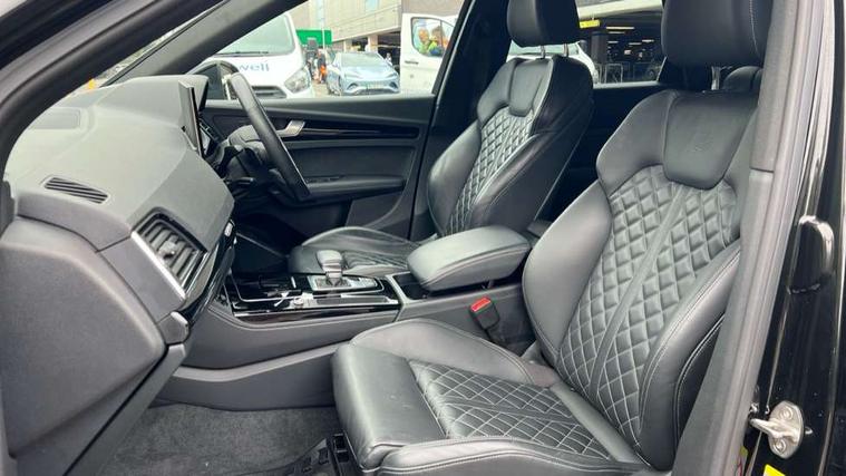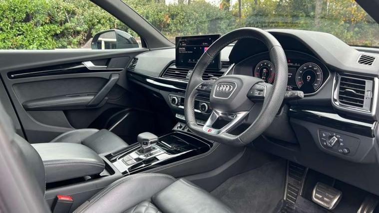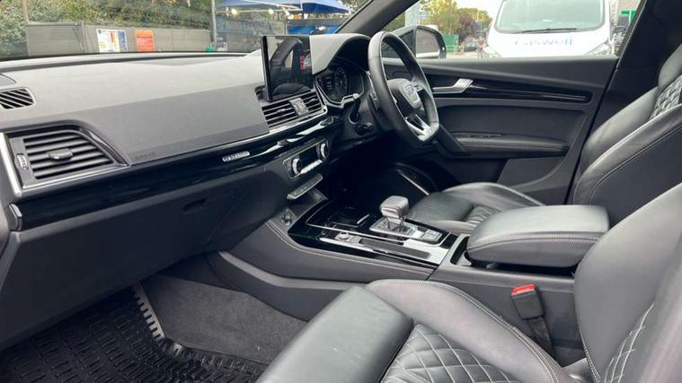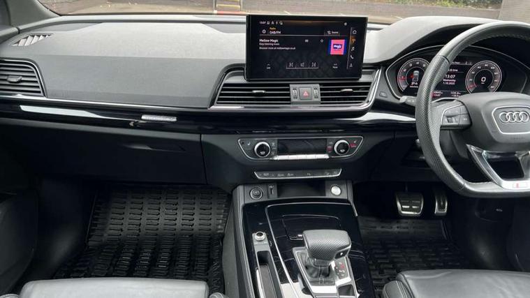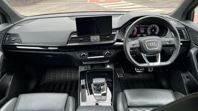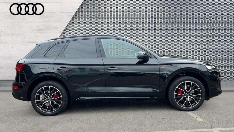 Audi connect safety and service (e-call), Audi connect with Amazon Alexa Integration, Audi drive select, Audi virtual cockpit plus with 12.3" screen and three different layout designs, Audi wireless smartphone interface, Automatic start-stop system with coasting functionality and efficiency programme, Bluetooth interface, Electro - mechanical power assisted steering, MMI navigation plus with 10.1" touch screen, Power tailgate, Reversing camera, Service interval indicator, Voice control system with Audi hotword activation "Hey Audi", Quattro on demand, S line sports suspension, DAB Digital radio, Acoustic windscreen, Audi matrix LED headlights with dynamic front and rear indicators, Audi rings at front and rear in black, Audi rings decal on rear doors, Auto dimming door mirrors, Auto dimming rear view mirror, Automatic headlights and windscreen wipers, Black door mirrors, Black roof rails, Body colour bumpers, Body colour underbody protection, Chrome plated exhaust trims, Daytime running lights, Door sills in Selenite silver, Electric adjustable/heated/folding door mirrors, Front air inlet surrounds in titanium black, Front and rear electric windows, Headlight washers, High gloss black B pillar trims and triangular rear door trim, High level LED brake light, Rear chrome trim strip below lights, Rear privacy glass and rear side windows, Rear side wing doors, Rear wiper, Roof bars, S Line rear spoiler, 2 x USB charging port with aux input socket, 3 rear headrests, 4 way electric lumbar support for driver and front passenger, 40:20:40 split folding 3 rear bench seat in 2nd row with rear centre armrest, Black cloth headlining, Comfort front centre armrest, Contrast stitching on seats, steering wheel and gear lever gaiter, Deluxe 3 zone electronic climate control, Electrically adjustable front seats, Fine Nappa leather upholstery with diamond pattern contrast stitching + front sport seats with S embossed logo, Front/rear floor mats, Gear lever in black leather, Heated front seats, Height adjustable front head restraints, Height/reach adjustable steering column, Illuminated door sill trims with S logo, ISOFIX child seat mounting and top tether, Rear seat bench plus, Removable luggage compartment floor, Single front passenger seat, Stainless steel pedals, Sunvisors with vanity mirrors, Black styling package - Q5 Edition 1, Extended interior upholstery pack - Q5, Extended LED Interior multi coloured Lighting Pack - Q5, 3 point seatbelts on all seats, 6 airbags - Driver, front passenger, curtain and side airbags, Electrically operated child locks on rear doors, Electromechanical parking brake, Electronic stabilisation control including ABS, ASR and EDL, Front and rear brake calipers painted in red, Front passenger airbag deactivation, Hill descent control, Hill hold assist, Multi collision brake assist, Pop-up bonnet for pedestrian protection, Pre sense city, Seat belt force limiter, Seatbelt monitoring, Tyre pressure warning, Warning triangle and first aid kit, Anti theft alarm, Anti-theft wheel bolts, Keyless Go access/ignition system, Remote central locking, Piano black finish inlay,