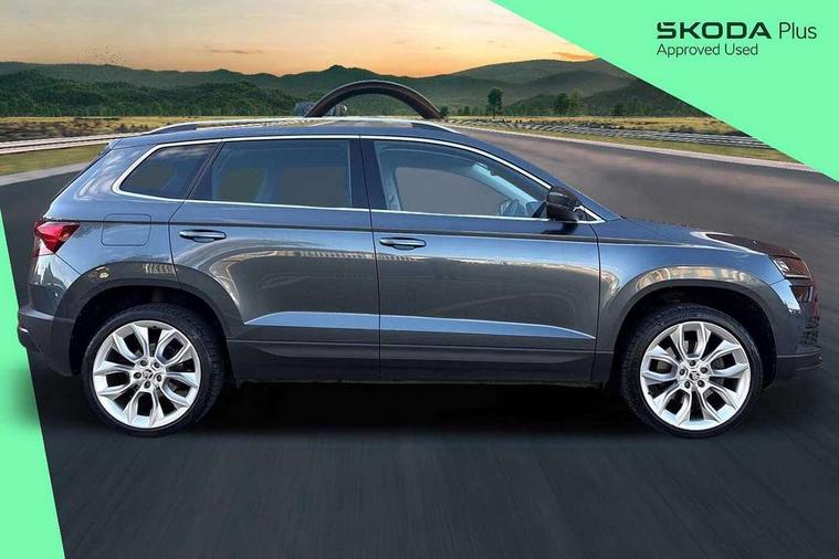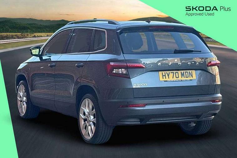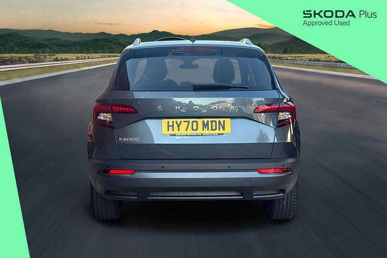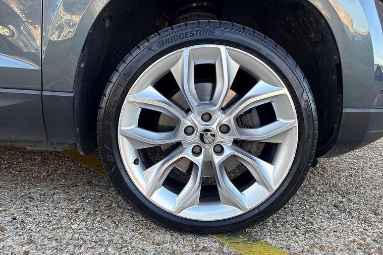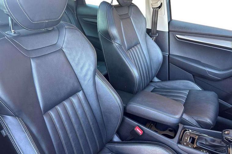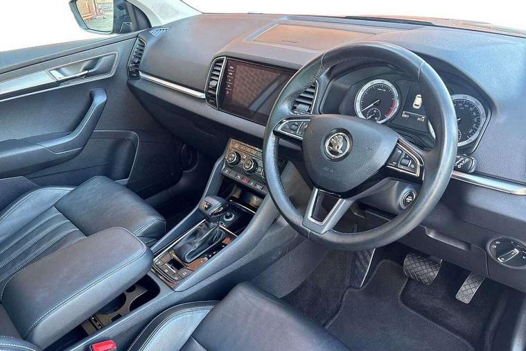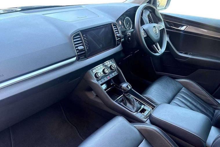 Care connect, Drive mode selector, Driver alert system, Driver fatigue sensor, Driver profile selection, Gesture control, Multifunction colour trip computer, Outside temperature gauge, Rear cross traffic alert, Rear view camera, Service interval indicator, SmartLink + wireless for Apple and wired for Android, Start/stop system with regenerative braking, Traffic sign recognition, USB C Port x 2 in front centre console, Columbus satellite navigation with 9.2" touchscreen display and integrated WiFi, WLAN and web radio, DAB radio with Bluetooth, SD card slot, USB connection, Wireless charging without wireless aerial connection, Acoustic glass, Aero front windscreen wipers with intermittent function, Automatic headlight control system, Black electric window control buttons, Body colour door mirrors and handles, Body coloured bumpers, Electric front and rear windows with child proof lock, Full LED headlights + adaptive front light system + LED daytime running lights and front cornering fog lights, Headlight washers, Heated rear windscreen, LED rear lights with high functionality, Light assistant (coming/leaving home/tunnel light), Panoramic sliding sunroof, Privacy glass, Safety reflectors on front doors, Third brake light, 1.5 litre bottle holders in driver and front passenger door panels, 12V socket in boot, 12v socket in front centre armrest with storage compartment and rear air vents, 2 Folding hooks and nets in boot, 2 Front readings lights for driver and passenger, 3 rear height adjustable headrests, 4 foldable roof handles with rear coat hooks, 4 lashing points on luggage floor, Backrest release, Cargo elements in boot, Chrome inner door handles, Folding tables on the front seat backrests, Front head restraints, Front seat and rear pockets, Height adjustable front three point seats belts with tensioners, Height adjustable passenger seat, Height/reach adjust steering wheel, Ice scraper, Illuminated and cooled glovebox, Illuminated luggage compartment, Isofix child seat preparation outer rear, Leather upholstery, Net programme in boot, Pen holder, Pollen filter, Rear boot cover, Rear reading lights, Rear seats fixed folding and divided 60:40, Retractable parcel shelf attachable to tailgate, Safety vest holder, Seatbelt reminder signalisation and pretensioner for all seats, Storage box in upper central dashboard closed, Storage compartment below the passenger seat, Sunvisors with illuminated vanity mirrors, Textile floor mats, Umbrella under passenger seat, VarioFlex seats with retractable parcel shelf, Chrome roof rails + chrome pack - Karoq, Electrically adjustable driver's seat with memory function pack - Karoq, LED Interior lighting pack with Skoda welcome logo - Karoq, Airbags - Front side, head, knee and curtain, Automatic door unlocking in case of crash, Automatic fuel cut off in case of crash, Driver airbag, Electronic parking brake with auto hold function, Emergency rear braking signal, ESC including ABS, MSR, ASR, EDS, HBA, DSR, RBS, MKB and traction control, Front assist radar scanning of the space in front of the car with automatic braking, Hill hold control, Passenger airbag with switch-off function, Pedestrian monitor, Three point seatbelts rear, Two tone horn, Tyre pressure display, Tyre pressure monitor, Alarm with interior monitoring, back up horn and tilt sensor with safe function, Electronic engine immobiliser, Keyless entry and keyless start with safe system, Remote central locking with 2 remote folding keys, Chrome framed air vents, 19" Crater alloy wheels with anti theft wheel bolts, Storage on wheel cover,
