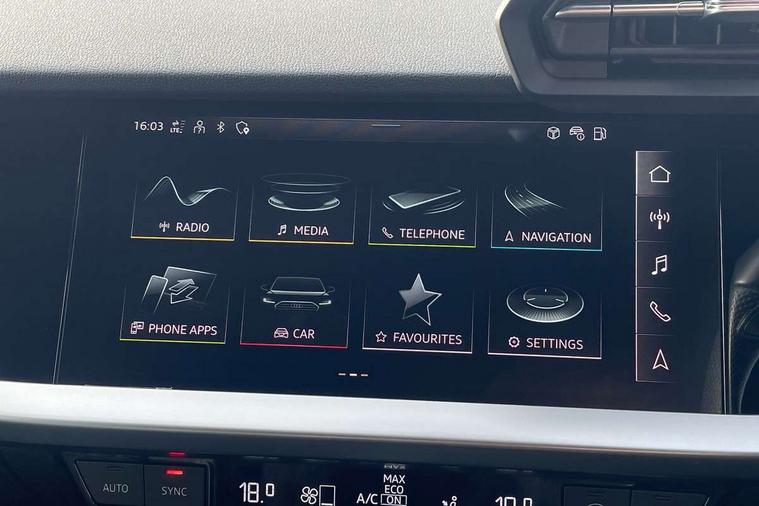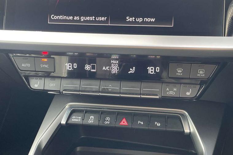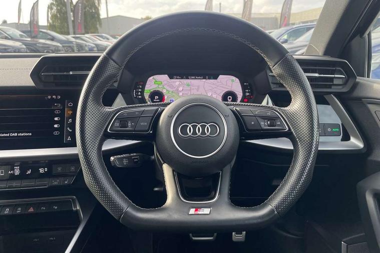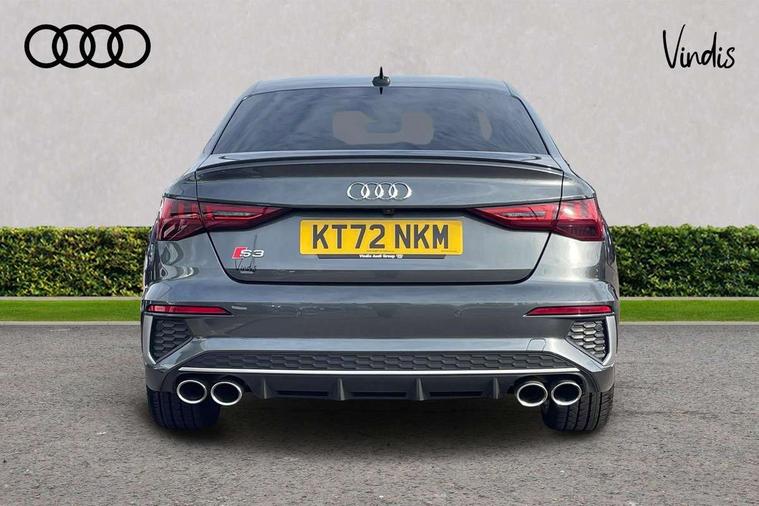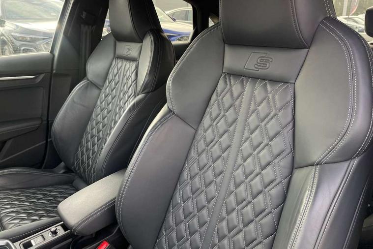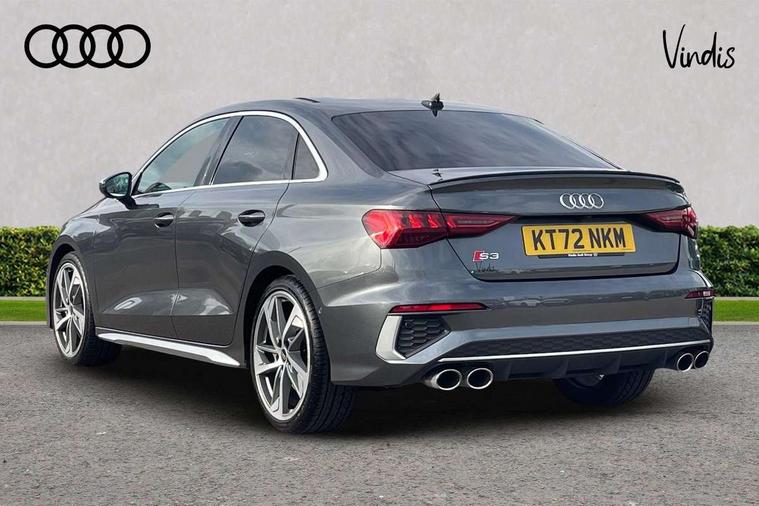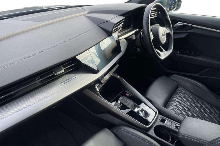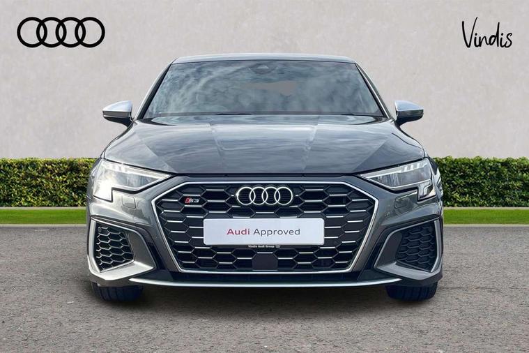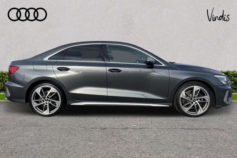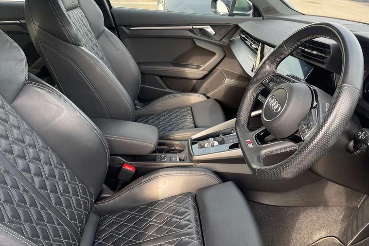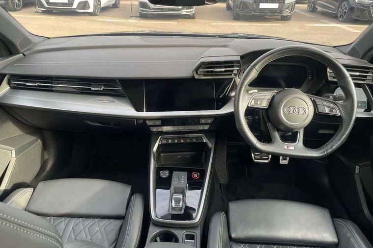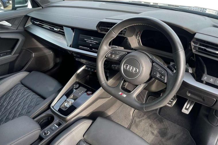 Audi connect emergency call and service, Audi drive select (Auto, Comfort, Dynamic, Efficiency and Individual), Audi smartphone interface, Audi Virtual Cockpit - 10.25" digital and colour instrument cluster, Automatic start/stop system with recuperation, Bluetooth interface, Collision avoidance assistant, Lane departure warning system, MMI Navigation Plus with high resolution 10.1" colour touch screen display, Progressive steering, Service indicator, Voice control system with natural language interaction, Quattro permanent all wheel drive, S sport suspension with spring damper adjustment and lowering by 15mm, 2x USB Type C ports (for charging and data transfer), 6 passive loudspeakers, CD player, DAB Digital radio, 3rd brake light, Acoustic glass windscreen, Audi Beam uses LEDs to project the Audi logo onto the ground as you exit your S3, Auto dimming frameless rear view mirror, Electrically adjustable/heated/folding/auto dimming door mirrors with integrated LED indications + kerb view function for passenger side, Front electric windows, Headlight washers, Illuminated door sills with aluminium inserts at the front with S logo, LED daytime running lights, LED headlights with LED rear lights and dynamic rear indicators, Light and rain sensors, Model and engine designation badges at rear, Privacy glass - dark tinted rear window, rear door and side windows, Rear boot, Rear electric windows, Rear side wing doors, 12V socket and storage compartment in front centre console, 3 seat bench in 2nd row, 40/20/40 split folding rear seat bench with cupholder, Black cloth headlining, Dual zone electronic climate control, Front and rear centre armrest in leather, Front and rear headrests, Front/rear floor mats, Heated front seats, Height and reach adjustable steering wheel, Illuminated vanity mirror, Interior lighting - glove compartment light and right hand side, Luggage compartment floor covering, Single front passenger seat, Stainless steel pedals and front footrest in black, Body styling design pack - S3, LED interior lighting pack - A3 Saloon, Storage pack - A3/S3 Saloon, 3x3 point rear seat belts, Driver and front passenger airbag with passenger airbag deactivation, Electronic Stabilisation Control (ESC) including ABS, ASR and EDL, First aid kit with warning triangle and 2 safety vests, Front side airbags with head airbags and interaction airbag, Hill hold assist, Pre-sense front with pedestrian and cyclist detection, Seatbelt monitoring, Tyre pressure loss indicator, Anti theft alarm, Anti-theft wheel bolts, Electronically operated child locks, Immobiliser, Remote control central locking, Aluminium air vent surrounds, Aluminium trim elements, Dark spectrum aluminium inlays, accent surfaces in the dashboard and centre console in platinum grey silk effect paint finish,