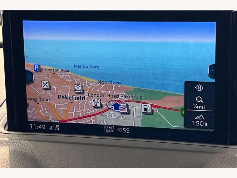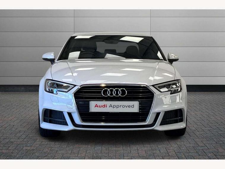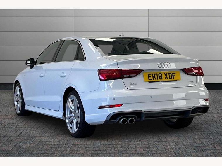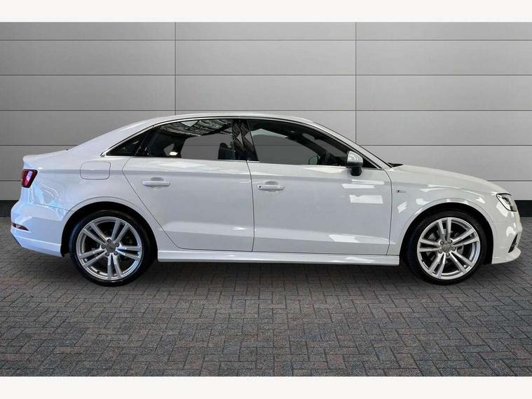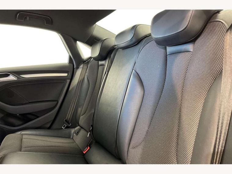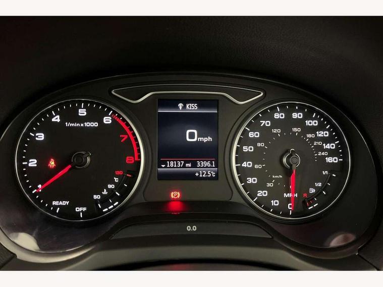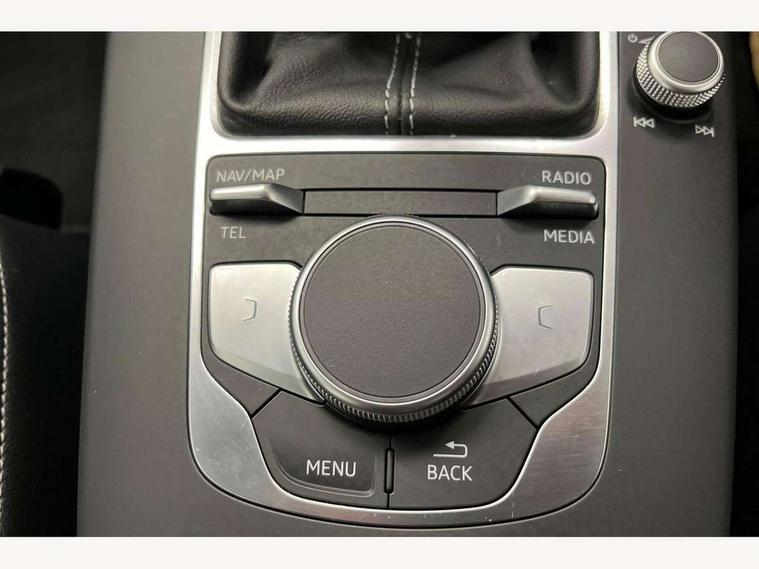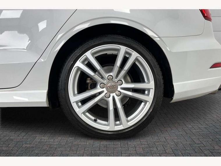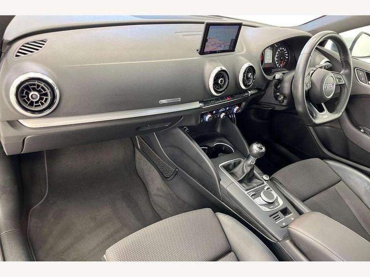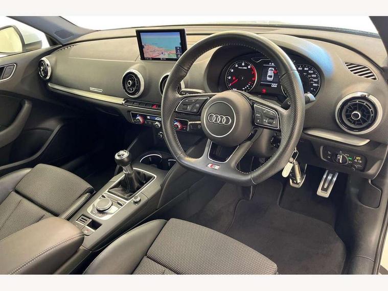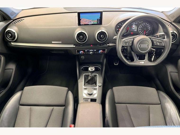 Audi connect, Audi drive select, Audi smartphone interface, Bluetooth interface, Colour driver's information system display, Electro-mechanical PAS, SD card based satellite navigation system, Service interval indicator, Voice control system, 2 USB ports, Audi music interface, Aux-in socket, CD player, DAB Digital radio, MMI radio plus with 7" colour MMI screen and MMI controller, Aluminium side window trim, Automatic lights and wipers, Body colour bumpers, Body colour door mirrors with integral indicators, Body colour roof spoiler, Chrome exhaust tailpipes, Electric operated/heated door mirrors, Front and rear electric windows, Heated rear window, Heated windscreen washer jets, High gloss dark chrome radiator grille, LED daytime running lights, S Line body styling, 3 adjustable rear headrests, 3 spoke flat bottomed multi-function leather steering wheel, 4 lashing points to secure luggage, Adjustable front armrest, Black cloth headlining, Driver/passenger sunvisors, Dual zone electronic climate control, Front and rear interior lights with delay, Front sports seats, Front/rear floor mats, Height/depth adjustable steering column, Illuminated door sills, Illuminated glovebox, ISOFIX child seat preparation+airbag deactivation, Jack and tool kit, Stainless steel pedals, Storage compartment in centre console, Storage compartments in doors, Storage under driver's seat, LED interior light pack - A3/RS3, Non smoking pack - A3, Storage and luggage pack - A3/RS3, 3 point seatbelts on all seats, ABS/EBD, ASR, Curtain airbags, Driver and passenger side airbags, Driver/Front Passenger airbags, Drivers knee airbag, EDL, Electromechanical parking brake, ESC - Electronic Stability Control + traction control, Front passenger airbag deactivation, Seatbelt warning, Tyre pressure warning, Warning triangle and first aid kit, Anti theft alarm, Anti-theft wheel bolts, Immobiliser, Remote control central locking, Aluminium air vent surrounds, Aluminium trim elements, Matt brushed aluminium inlays,