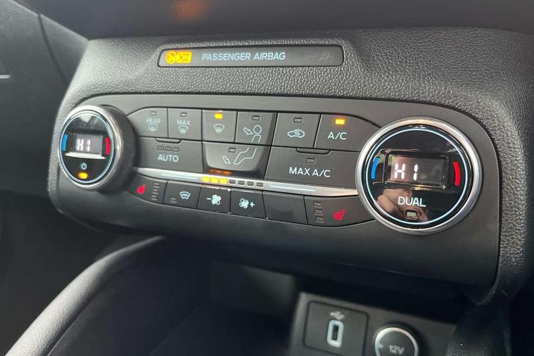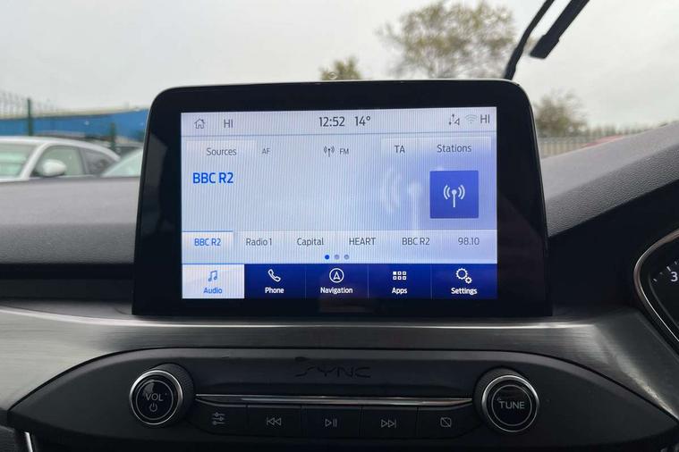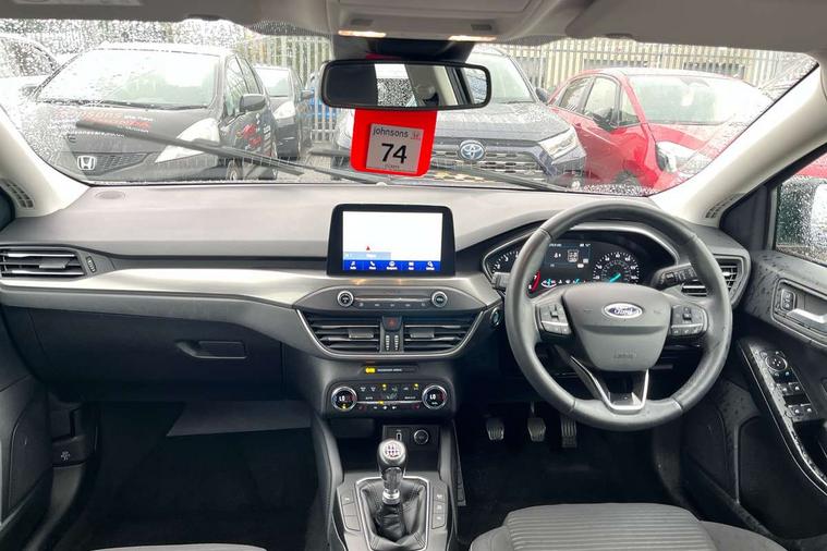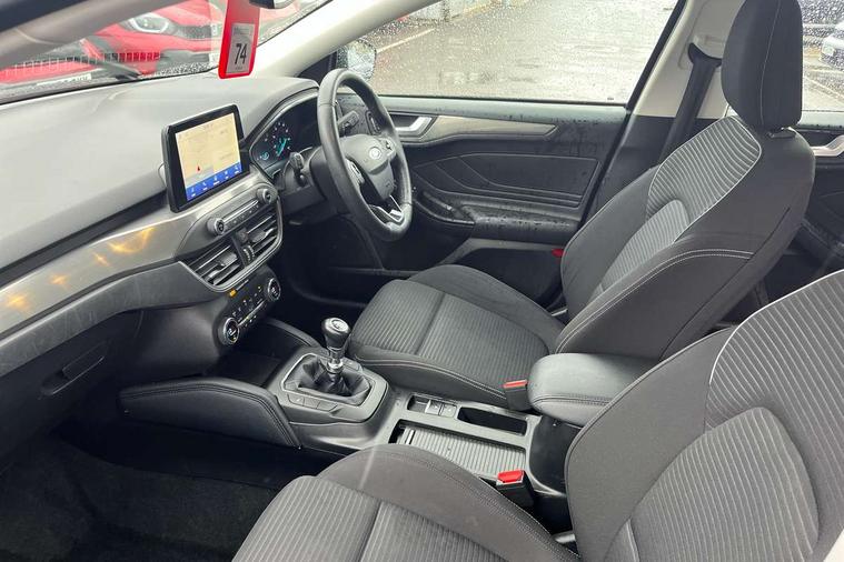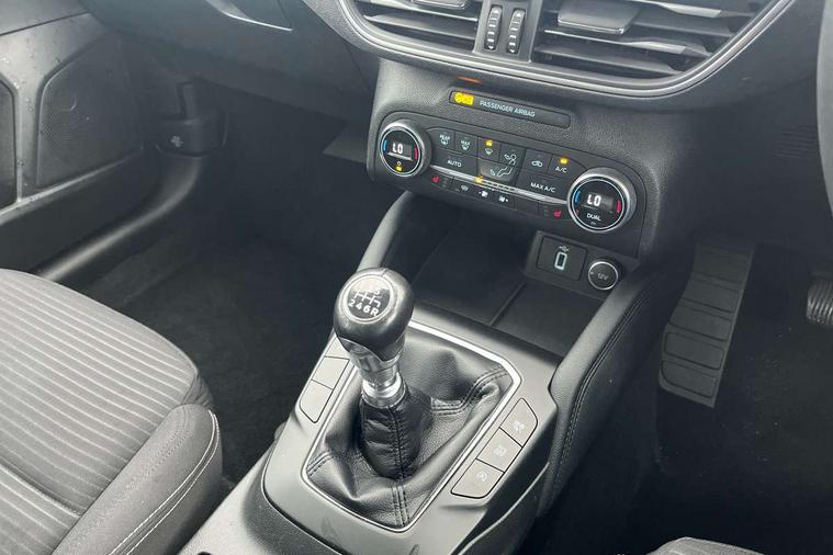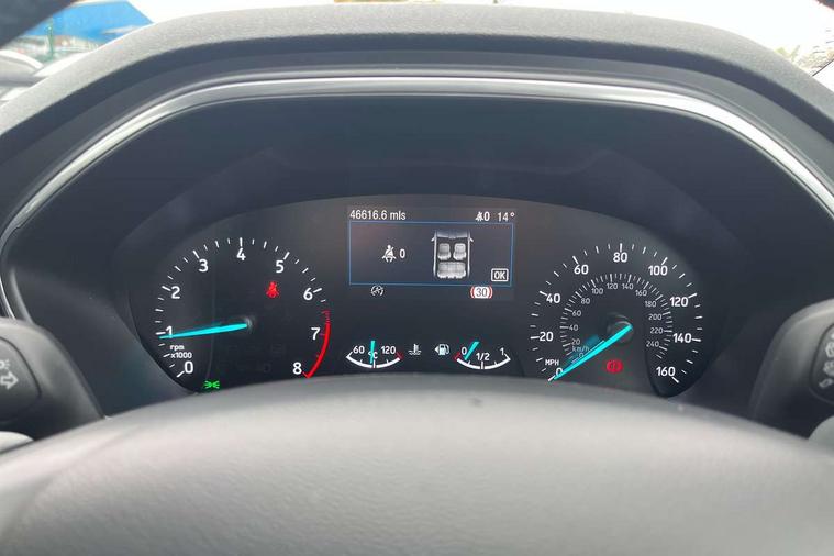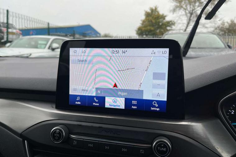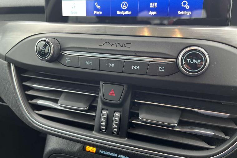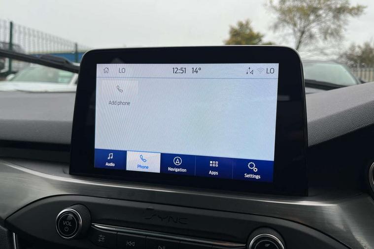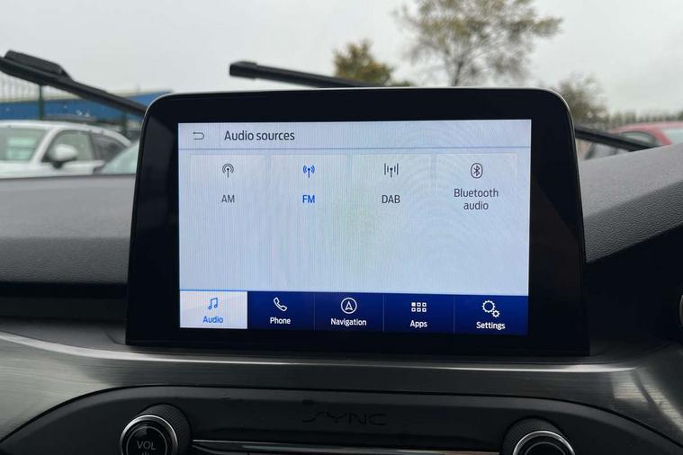 4" TFT coloured cluster screen, Bluetooth system, Digital clock, Easy fuel capless refuelling system, Eco mode, Ford pass connect, Ford SYNC 3 nav system with DAB radio, 8" colour touch screen, voice control, app link, Apple car play/Android auto and 4.2" TFT coloured cluster, Lane keeping aid with lane departure warning, PAS, Selectable drive mode, Trip computer, 2 USB ports, Aux input, 'Quickclear' heated windscreen/heated washer jets, Auto dimming rear view mirror, Auto headlamps (on/off), Automatic rain sensing wipers, Body colour large rear spoiler, Body coloured bumpers, Body coloured door handles, Body coloured electrically operated and heated door mirrors with side indicators, Electrically operated front and rear windows with one touch opening and closing, Front fog lamps with cornering function, Front variable intermittent wipers with electric wash, Halogen reflector headlamps, Heated rear window, LED daytime running lamp, LED rear lamps, Power folding door mirrors with puddle lights, Tailgate wash/wipe, Upper grille with chrome surround and horizontal bars, 3 spoke leather trimmed steering wheel with integrated audio controls, 60/40 split back and cushion rear seats with 2 height adjustable headrests, Ambient lighting, Centre console with sliding front armrest, Cloth upholstery, Driver's lumbar support, Dual zone electronic air temperature control, Front/rear floor mats, Heated front seats, Height adjustable front headrests, Isofix child seat preparation, Leather gear knob, Reach + rake adjustable steering column, Rear centre headrest, ABS+Electronic Brake force Distribution, Auto hold function, Driver airbag, Electronic parking brake, Electronic stability control, Front and rear seatbelt reminder, Front inertia reel height adjustable seatbelts with pre-tensioners, Front passenger airbag, Front side airbags, Hill start assist, Passenger airbag deactivate switch, Post collision braking, Pre collision assist with autonomous emergency braking and pedestrian/cyclist detection, Side curtain airbags, Three rear inertia reel lap/diagonal seatbelts, Tyre pressure monitoring system, Ford keyfree system with Keyless entry and keyless start, MyKey system, Remote central locking & engine immobiliser, Thatcham category 1 alarm, 16" 15 spoke sparkle silver alloy wheels, Mini steel spare wheel,