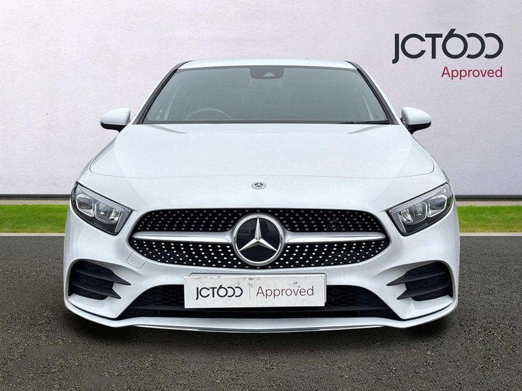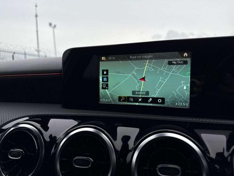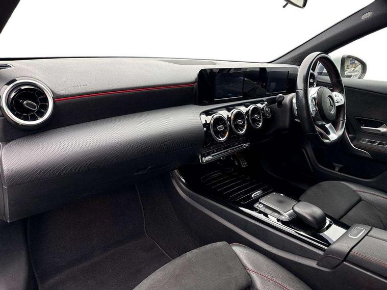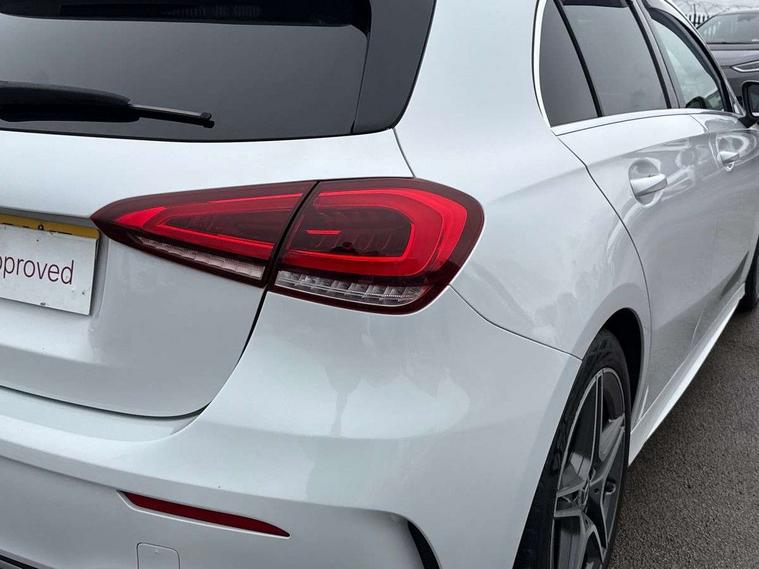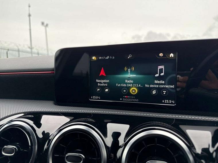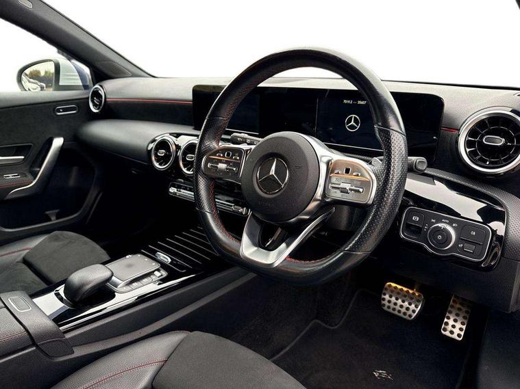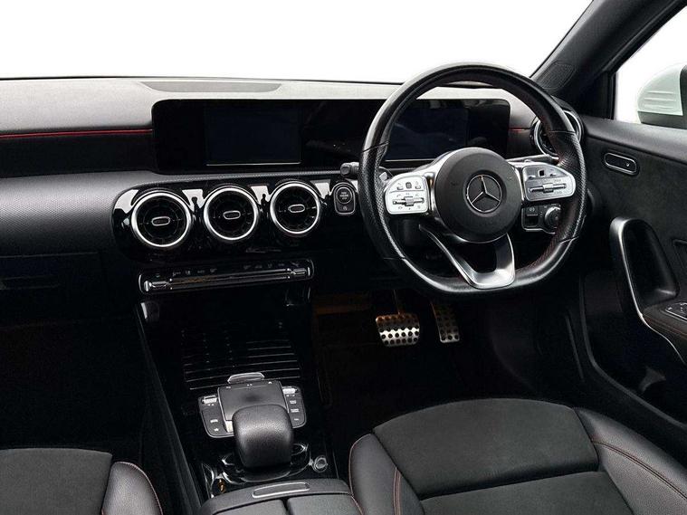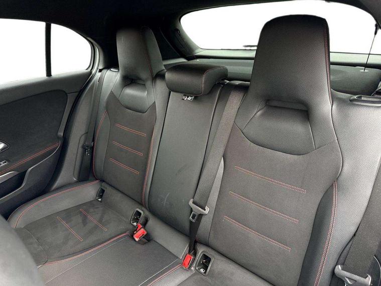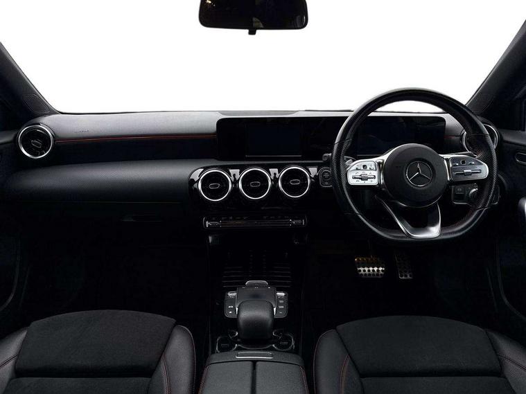180 degree rear view camera with parking guidelines, 7" colour screen in instrument panel, 7" touchscreen media display, Attention assist, Brake pad wear indicator warning light, Car wash mode, Cruise control + speed limiter, Direct steering, Dual bluetooth interfaces, DYNAMIC SELECT with a choice of driving modes (ECO, Comfort, Sport and Individual), ECO start/stop function, Fluid level warning indicator for fuel, oil, coolant and washer fluid, Hard-disk navigation, Hey Mercedes Voice activation, Lamp failure indicator, Mercedes me connect including emergency call system, accident recovery, breakdown and maintenance management, Mercedes me remote services, Outside temperature gauge, Owners manual in English, Pre-installation for private car sharing, Preinstallation for Mercedes Benz link, Service indicator (ASSYST), Speed sensitive power steering, Trip computer, Lowered comfort suspension, Rear axle multi-link, 2 USB ports (type C) in rear stowage compartment and one in front of center console, 6 speakers, DAB Digital radio, MBUX multimedia system with DAB digital radio and touchpad including satellite navigation, Mercedes-Benz sound system - 100W, 4 Electric Front and Rear windows, Adaptive brake lights, AMG bodystyling - Front apron with splitter in chrome, rear apron with chrome trim and chrome visible trim elements in tailpipe, Black weather strip, Body colour bumpers, Body colour door handles, Body colour side skirt, Body coloured door mirrors, Chrome beltline trim, Diamond radiator grille with chrome pins and silver louvre + chrome insert, Electric adjustable and heated door mirrors with integrated LED side indicators, Exhaust system - Twin visible tailpipes in polished stainless steel, Headlamp assist automatic headlamp activation, Heated glass rear windscreen + timer control, LED high performance headlamps with integrated LED daytime running lights, LED tail lamp, LED third brake light, Privacy glass, Radio aerial, Rain sensing windscreen wipers with two sensitivity settings, Rear fog lights, Rear wiper, Window line trim strip in chrome, 3 Spoke flat bottom leather multi function steering wheel with perforated leather in grip area, 40:20:40 split folding rear seats, Artico man-made leather/Microfibre Dinamica upholstery with red contrast stitching, Auto Mercedes-Benz child seat recognition sensor, Black air vents with surround in silver chrome, Black roof lining, Brushed stainless steel sports pedals with rubber studs, Controller on centre console with chrome surround, Floor mats with stitched edging and AMG lettering, Front centre armrest with storage compartment, Front door sills with Mercedes Benz lettering, Front seat backs luggage nets, Front seat cushion length adjustment, Galvanished gear shift paddles on steering wheel, Heated front seats, Height/reach adjustable steering column, Interior mirror with reading lamps in black and frameless, Manual height adjustable front seats, Rear head restraints, Seat occupancy sensor for front passenger seat, Sports seats with integrated headrests, Stowage compartment in centre console with retractable cover, Sunvisors with illuminated vanity mirrors, Touchpad on center console, Twin front cupholders, Two zone thermotronic luxury automatic climate control, Light and sight pack - A Class, Seat comfort pack - A Class, 3 rear 3 point seatbelts, ABS with Brake Assist, Active bonnet, Active brake assist includes forward collision warning system with autonomous braking, Adaptive brake assist with hold function and hill start assist, Black seatbelts, Childproof locks manually operated for rear doors and electrically operated for rear power windows, Crash responsive emergency lighting, Driver and passenger head and side airbags, Drivers knee airbag, Dual stage driver/passenger airbags, Electronic parking brake, ESP curve dynamic assist, ESP with ASR, Front and rear seatbelt reminder, Front brake callipers with Mercedes Benz lettering, ISOFIX and top tether child seat fixing points in two outer rear seats, Tyre pressure monitoring system, Warning triangle and first aid kit, Window airbags, Alarm system/interior protection/immobiliser, Keyless Go, Remote central locking and crash sensor with emergency opening function, Urban guard vehicle protection system with immobiliser and interior protection, Dinamica microfibre trim in black, 18" AMG 5 twin spoke light alloy wheels in titanium grey with highsheen finish, Summer tyres, Tirefit sealant kit,