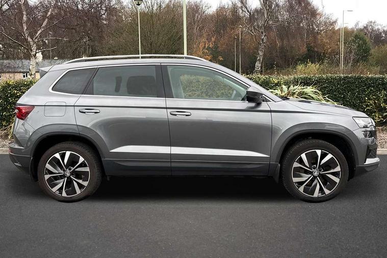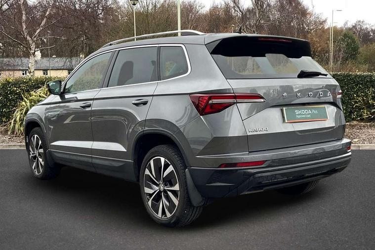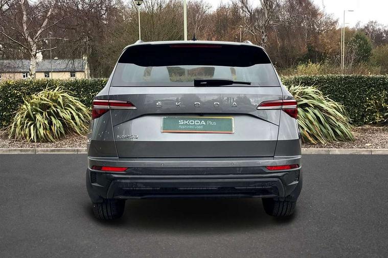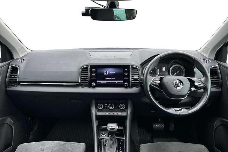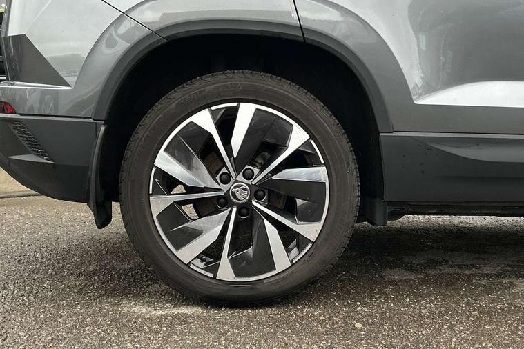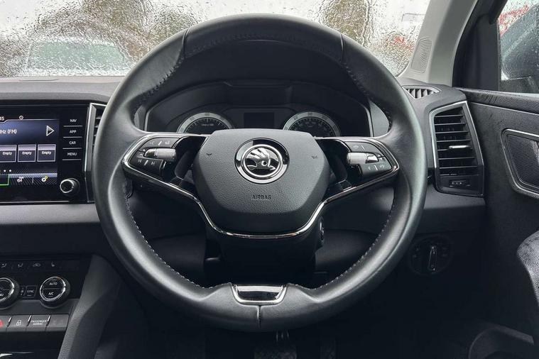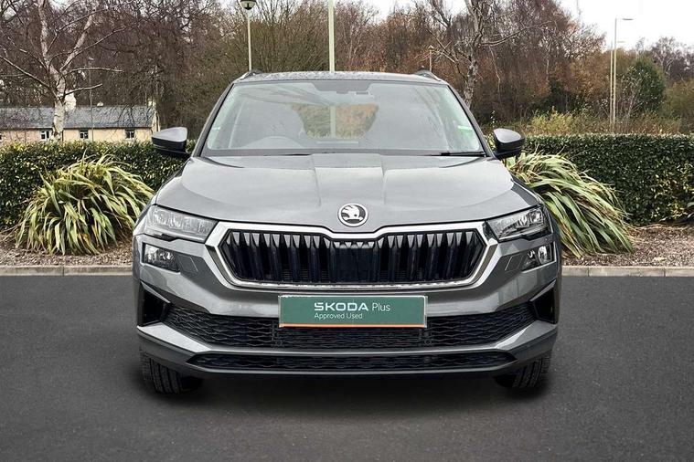8" Digital display, Care connect, Colour multifunction trip computer, Driver fatigue sensor, Emergency services call system, Outside temperature gauge, Service interval indicator, SmartLink wireless for Apple and wired for Android, Start/stop system with regenerative braking, USB C Port x 2 in front centre console, 8 Speakers, DAB radio with Bluetooth, USB connection, Acoustic glass, Aero front windscreen wipers with intermittent function, Auto dimming rear view mirror with light and rain sensors, Automatic headlight control system, Black electric window control buttons, Body colour door mirrors and handles, Electric front and rear windows with child proof lock, Heated rear windscreen, LED daytime running lights, LED rear lights with high functionality welcome effect and dynamic indicators, Light assistant (coming/leaving home/tunnel light), Plastic scuff plates, Privacy glass, Rear side wing doors, Rear spoiler, Rear window wiper with washer system and intermittent control, Safety reflectors on front doors, 1.5 litre bottle holders in driver and front passenger door panels, 12V socket in boot, 12v socket in front centre armrest with storage compartment and rear air vents, 2 Folding hooks and nets in boot, 2 spoke leather heated multifunction steering wheel with DSG paddles, 2 x Tablet holder, 3 rear height adjustable headrests, 3 seat bench in 2nd row, 4 foldable roof handles with rear coat hooks, Black floor carpet, Chrome inner door handles, Decorative door sills with KAROQ badging, Double sided boot floor, Foldable hooks in the boot, Front head restraints, Height adjustable front three point seats belts with tensioners, Height/reach adjust steering wheel, Ice scraper, Illuminated glovebox, Illuminated luggage compartment, Isofix child seat preparation for front passenger seat, Isofix child seat preparation outer rear, Manual lumbar support for front seats, Pen holder, Pollen filter, Rear boot cover, Rear reading lights, Rubbish bin door, Safety vest holder, Single front passenger seat, Storage box in upper central dashboard closed, Sunvisors with illuminated vanity mirrors, Textile floor mats, Ticket holder, VarioFlex seats with standard rear seat release, Chrome roof rails + chrome pack - Karoq, Parking pack - Karoq, Automatic door unlocking in case of crash, Automatic fuel cut off in case of crash, Child locks on rear doors, Driver airbag, Electronic parking brake with auto hold function, Emergency rear braking signal, ESC including ABS, MSR, ASR, EDS, HBA, DSR, RBS, MKB and traction control, Front side airbags, Hill hold control, Knee airbags, Passenger airbag with switch-off function, Pedestrian monitor, Seatbelt reminder signalisation and pretensioner for all seats, Three point seatbelts rear, Two tone horn, Tyre pressure display, Tyre pressure monitor, Alarm with interior monitoring, back up horn and tilt sensor with safe function, Electronic engine immobiliser, Keyless entry and start/stop, Remote central locking with 2 remote folding keys, Chrome framed air vents, Anti-theft wheel bolts protection, Storage on wheel cover, Tool kit,