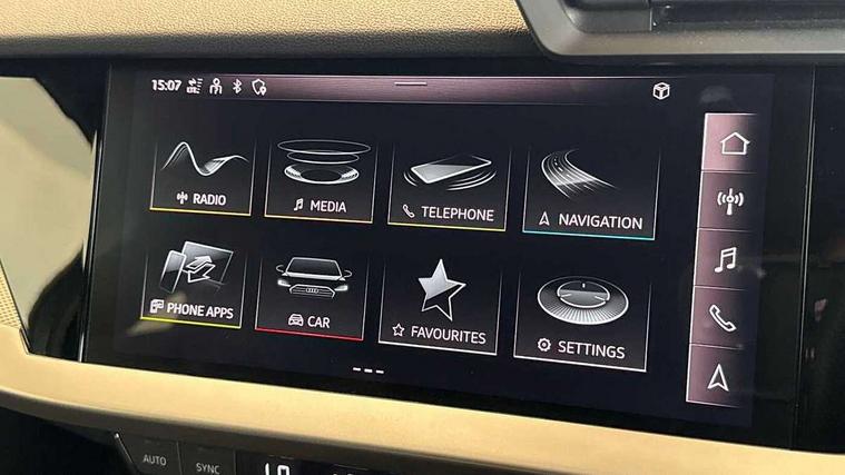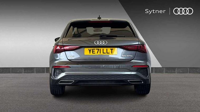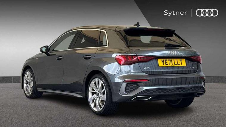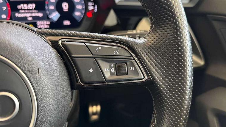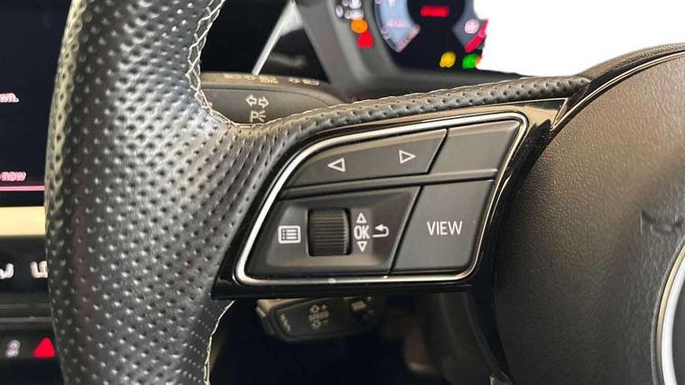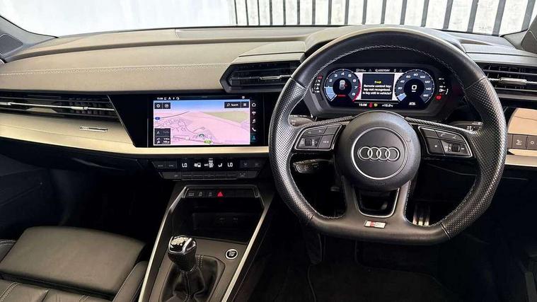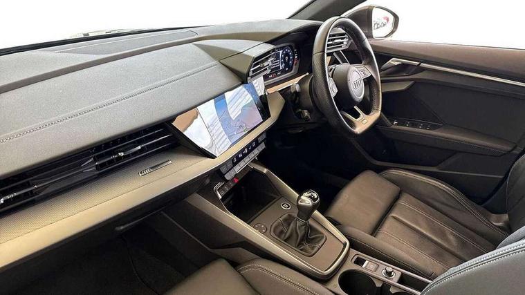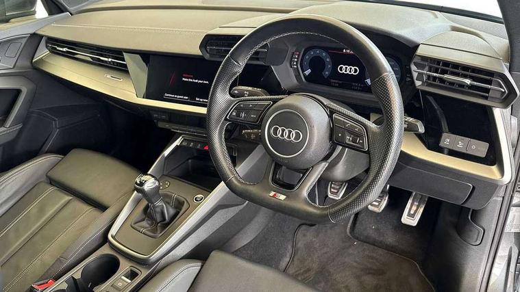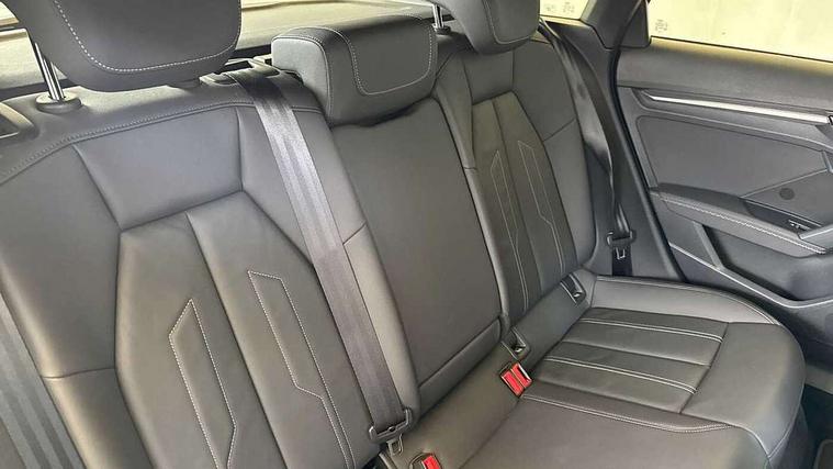 Audi connect emergency call and service, Audi drive select (Auto, Comfort, Dynamic and Individual), Audi smartphone interface, Audi Virtual Cockpit - 10.25" digital and colour instrument cluster, Automatic start/stop system with recuperation, Bluetooth interface, Collision avoidance assistant, Electromechanical power speed sensitive steering, Lane departure warning system, MMI Navigation Plus with high resolution 10.1" colour touch screen display, Service indicator, Trip computer, Voice control system with natural language interaction, 2xUSB-C connection with data and charging functions, 6 passive loudspeakers, DAB Digital radio, 3rd brake light, Acoustic glass windscreen, Aluminium window trim, Auto dimming frameless rear view mirror, Electrically adjustable/heated/folding/auto dimming door mirrors with integrated LED indications + kerb view function for passenger side, Front electric windows, Illuminated aluminium inserts front door sills with S logo, LED daytime running lights, LED headlights with LED rear lights and dynamic rear indicators, Light and rain sensors, Privacy glass - dark tinted rear window, rear door and side windows, Rear electric windows, Rear side air outlets in grained matt black, Rear wiper, S line bumpers, S roof spoiler, 12V socket and storage compartment in front centre console, 40/20/40 split folding rear seat bench with cupholder, Black cloth headlining, Dual zone electronic climate control, Front and rear centre armrest in leather, Front and rear headrests, Front/rear floor mats, Height and reach adjustable steering wheel, Interior lighting - glove compartment light and right hand side, Luggage compartment floor covering, Manual boot compartment lid, Manually adjustable front seats, Seat side bolsters, Stainless steel pedals and front footrest, Twin leather upholstery with front sports seats S embossed logo, Aluminium interior elements pack - A3 Sportback, S line styling pack - A3 Sportback, 3x3 point rear seat belts, Driver and front passenger airbag with passenger airbag deactivation, Electronic Stabilisation Control (ESC) including ABS, ASR and EDL, First aid kit with warning triangle and 2 safety vests, Front side airbags with head airbags and interaction airbag, Hill hold assist, Pre-sense front with pedestrian and cyclist detection, Seatbelt monitoring, Tyre pressure loss indicator, Anti theft alarm, Anti-theft wheel bolts, Electronically operated child lock, Immobiliser, Remote control central locking, Accent surfaces in the dashboard and centre console in platinum grey silk effect paint finish, Dark spectrum aluminium inlays,