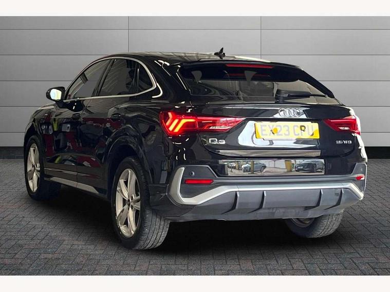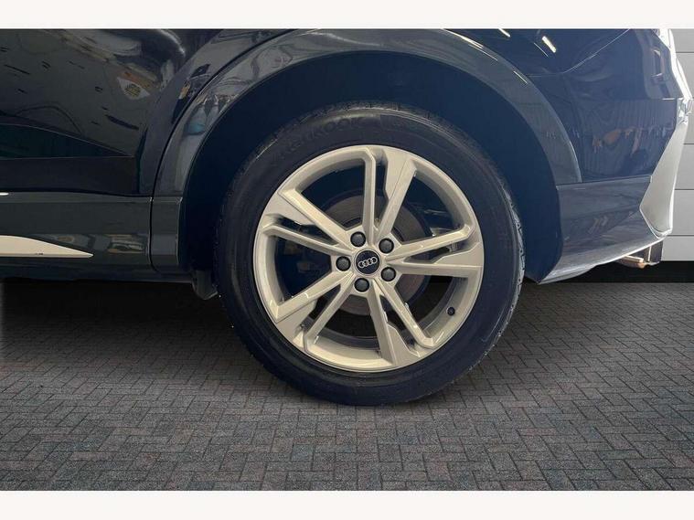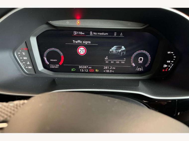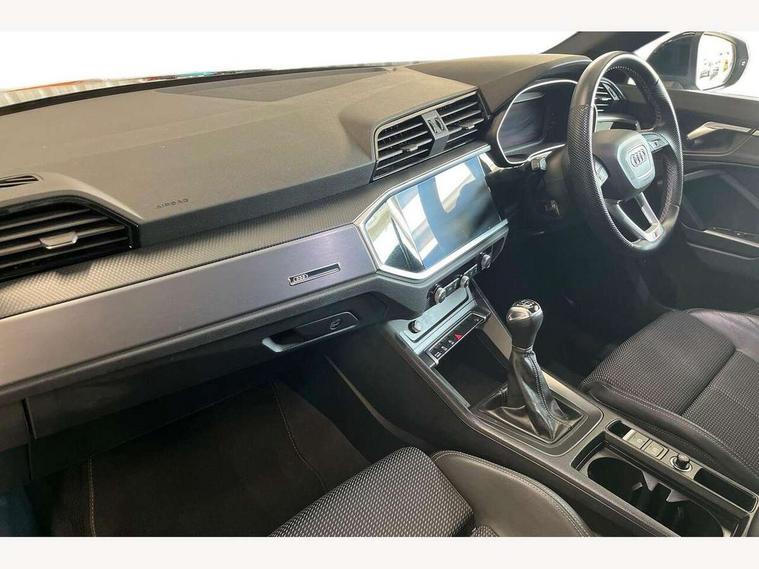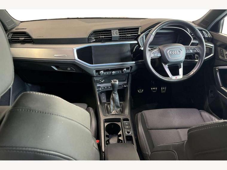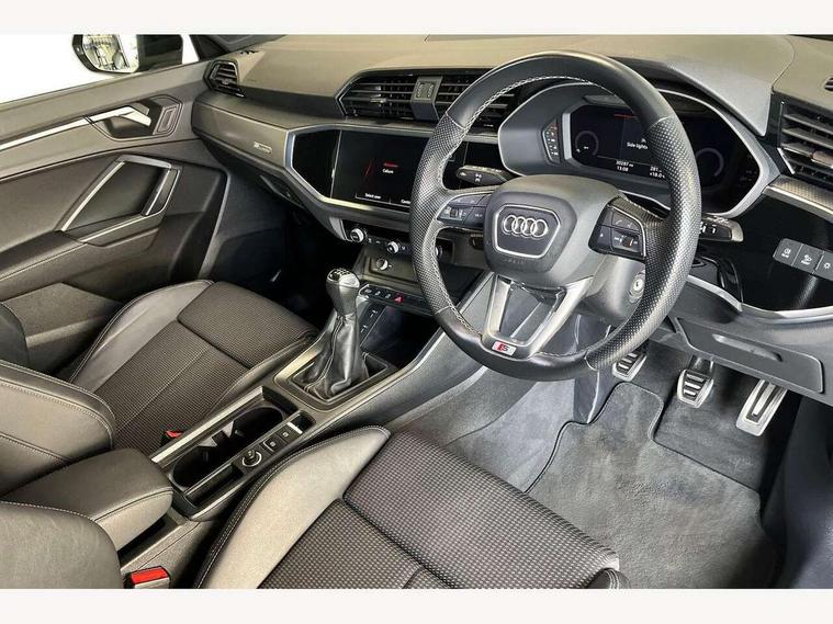 Audi drive select, Audi lane departure warning, Audi Virtual Cockpit - 10.25" display, Bluetooth interface, Camera based traffic sign recognition, Cruise control + speed limiter, Legal emergency call, MMI Navigation Plus with high resolution 10.1 inch touchscreen colour display, Power operated tailgate, Progressive steering, Rear parking sensors, Service interval indicator, Smartphone interface includes wireless Apple carplay/Android Auto, Start stop system with recuperation, Voice control system with natural language interaction, Sports suspension, 2 USB-C ports with charge and data functions, 6 passive loudspeakers, DAB digital radio module, Acoustic windscreen, Aluminium window trim, Auto dimming frameless rear view mirror, Diffuser grille in grained matt black, Diffuser trim in selenite silver, Electrically folding, adjustable and heated door mirrors with integrated LED side indicators and kerb view function for passenger side, Front and rear electric windows, Front fog lights, Front side air inlets in selenite silver, Front underbody protection in manhattan grey paint finish, Grille surround in aluminium silver matt, High gloss black finish B and C pillars, LED Dynamic rear indicators, LED headlights with LED daytime running lights, LED rear lights, LED third brake light, Privacy glass dark tinted rear and rear-side windows (from B-pillar backwards), Radiator grille in anthracite black with inlay in matt aluminium silver, Rain and light sensors, Rear side wing doors, Rear underbody protection in matt black, Rear wiper, S line badges on front wings, S line front and rear bumpers and side skirts in contrasting Manhattan grey paint finish, Side skirt insert in matt Platinium grey, Variable front intermittent wipers, 12V socket in rear centre console, 3 seat bench in 2nd row, 3 spoke leather multifunction steering wheel features S badging and grips in perforated leather with contrast stitching, 40:20:40 folding with manual adjustment for 60:40 forwards/backwards position and backrest angle, Adjustable rear seat bench/backrest with centre armrest and cupholder, Black cloth headlining, Dual zone electronic climate control, Front and rear black floor mats with contrast stitching, Front and rear headrests, Front and rear roof module including reading lights, Front centre armrest, Glove compartment lighting, Height and reach adjustable steering wheel, Illuminated door sill trims with S logo, ISOFIX child seat mounting for front passenger with airbag deactivation and outer rear seat including top tether attachment point for outer rear seats, Luggage compartment light right in white, Luggage compartment sill protection in stainless steel, Manual front seats with height adjustment, Perforated leather gearknob, Single front passenger seat, Stainless steel pedals, Ambient lighting pack - Q3, Non smoking pack - Q3, 3x3 point rear seatbelts, 6 airbags - Driver, front passenger, curtain and side windows, Audi pre-sense front with pedestrain and cyclist recognition, Electrically operated child locks on rear doors, Electromechanical parking brake, Electronic stabilisation control including ABS, ASR and EDL, Front seatbelt reminder, Hill descent control, Hill hold assist, Pre sense basic, Seatbelt monitoring, Tyre pressure warning, Warning triangle and first aid kit, Anti theft alarm, Anti theft wheel bolts, Immobiliser, Remote central locking, Aluminium look interior elements, Black dashboard, Dark matt brushed aluminium inlay, Detail dashboard around MMI touch colour display in glass look, black with surround in aluminium look, Leatherette door armrest,