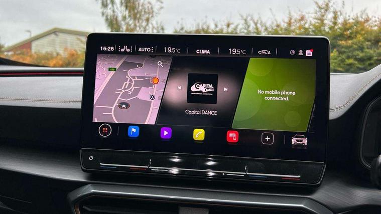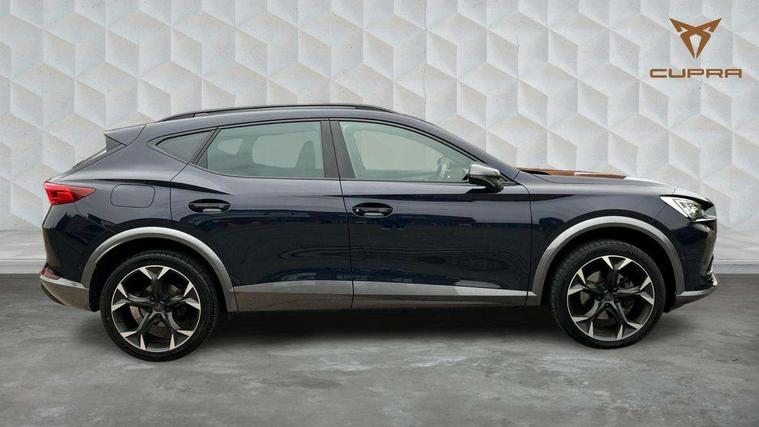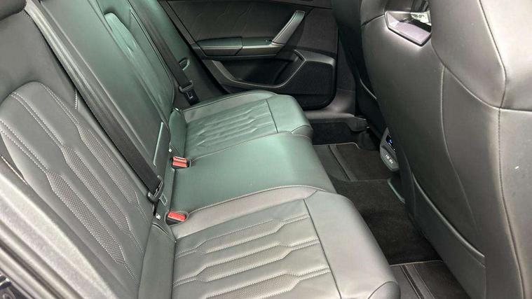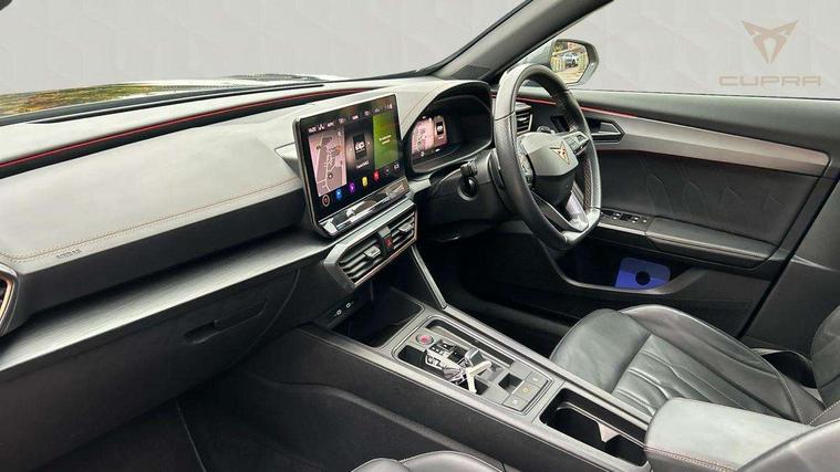 Digital cockpit and configurable dashboard, Driver alert system, Driving profile selection, Forward collision warning with automatic braking, Lane assist, Navigation system with 12'' Touchscreen Display, Park assist (inc front/rear parking sensors), PAS, Predictive adaptive cruise control with speed limiter, Rear view camera, RPM, trip computer, outside temp gauge, instrument light brightness, low fuel warning light, lights on reminder, gearshift indicator, Service interval indicator, Start/stop system with regenerative braking, Voice control system, Wireless apple carplay, Wireless phone charger, Electronic locking differential and dynamic traction support, Standard suspension, 2 front and 2 rear USB type C sockets, Auxiliary input socket, DAB radio, Auto dimming rear view mirror, Body colour door handles, Body coloured bumpers, Dark grey wing mirror, Daytime running light with automatic headlight control and coming home feature, Dynamic headlight range control, Electric front/rear windows, Electrically adjustable heated and folding door mirrors with memory function, Front fog lamps with cornering function, Gloss black roof rails and window surrounds, LED Headlights, LED Taillights with dynamic indicator, Rain sensing wipers, Rear diffuser with black simulated exhaust pipes, Rear side wing doors, Rear wash/wipe, Third brake light, Tinted rear windows, Welcome lights, 12v power supply in centre console, 12V socket, 12v socket in loadspace, 2 front and 2 rear reading lights, 230V socket, 3 seat bench in 2nd row, 60/40 split rear bench seat with armrest and mechanical seat release, Black headlining, Dust/pollen filter, Front and rear head restraints, Front centre armrest, Height/reach adjust steering wheel, Illuminated interior front door sills, Illuminated sunvisor with mirror, Isofix, Leather multi function heated steering wheel with gear shift paddles, Luggage tie-down hooks, Single front passenger seat, Three zone climate control with control panel in rear, Variable luggage/load compartment floor, Wraparound lighting, Genuine Nappa leather Pack - Cupra, 3 point seatbelts on all rear seats, ABS, Brake control system - ESC and brake booster, Child proof door locks, Driver and front passenger airbags with front passenger airbag de-activation, Electronic parking brake, Front and rear disc brakes, Front side curtain airbags, Hill hold control, Public e-call, Seat belt reminder for front and rear seats, Tyre pressure monitoring system, Anti theft alarm system, Keyless entry and start system (KESSY), Locking wheel bolts, Copper and aluminium interior detailing, 19" 'Exclusive' machined sport matte black and silver alloy wheels,