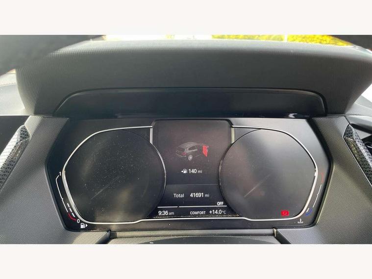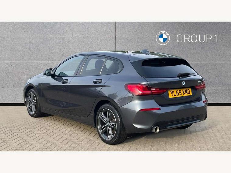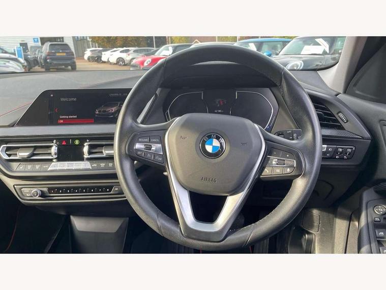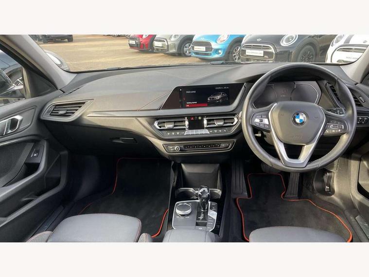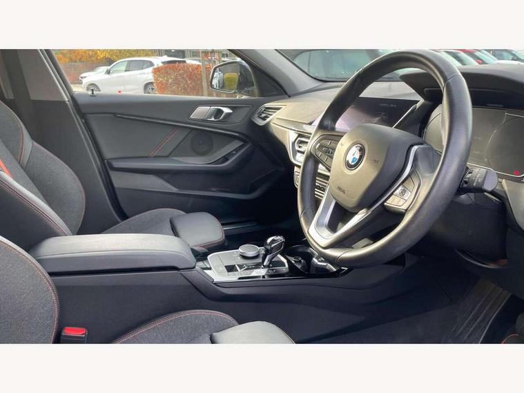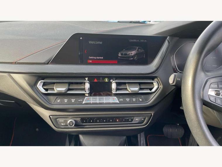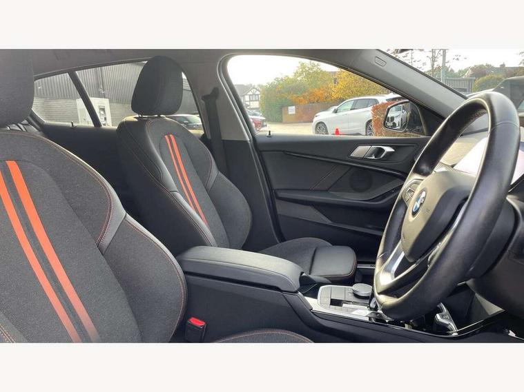 Active guard plus, Attentiveness assist, BMW Online services, BMW Teleservices, Check Control warning system for monitoring of lights and door/luggage compartment open warning, Connected eDrive Services, Eco pro mode, Electric power steering, Integrated owners handbook, On board computer, Optimum shift indicator, Personal Profile, Pull away assistant, Speed limiter, Anti roll bar front and rear, Balancer shaft, Double VANOS, Drive Performance Control, Electronic differential lock, Petrol Particulate Filter, VALVETRONIC engine management, Bluetooth audio streaming, DAB Digital radio, Auto dimming rear view mirror, Body colour door handles, Body colour mirror caps, Chrome exhaust tailpipe in single, round (Exhaust tailpipe, stainless steel - single, round), Chrome kidney grille with extra wide black, high gloss black vertical slats, Direction indicator side lights in exterior mirrors, Fading support, Follow me home headlights, Front and rear electric windows with open and close fingertip control, anti trap facility and comfort closing, Front bumper in Body colour with exclusive Sport air inlets finished in High gloss Black, Front door sill finishers in black plastic with BMW designation, Green tinted heat protection glazing, Headlight beam throw control, Heated, electrically adjustable exterior mirror aspheric on driver side, convex on passenger side, High gloss shadow line exterior trim, High level third brake light, LED daytime running lights, LED front fog lights, Lightweight engineering, Matt black air guide grilles, Matt black roof moulding, B pillar finisher and wheel arch trim, Matt black window frame, Model designation on right side of tailgate, Nearside reverse light in rear light cluster, Rain sensor including auto headlights activation, Rear bumper in Body colour with exclusive Sport design elements finished in High gloss Black, Rear fog lights, Rear window wiper, Shark fin antenna, Visible VIN plate, Welcome lighting, Windscreen wipers with integrated washing jets, 12V power socket in centre console, 2 cupholders in front centre console, 3 rear seat head restraints, 3 spoke sports leather steering wheel in pearl Chrome, Child seat ISOFIX attachment for two outer rear seats and front passenger seat with anchorage points, Conditioned based service, Driver side folding compartment in instrument panel, Folding rear clothes hook, Folding rear seats, Four grab handles integrated in roof lining, Front and rear door pockets, Front and rear side armrest integrated into door trim, Front armrest foldable with integrated storage compartment, Front sports seats with electric side bolster adjustment, Glove compartment, Height adjustable front head restraints, Manual adjust steering wheel, Multi-function controls for steering wheel, Rear seat backrest with manual 60:40 split folding with 3 top tether clips integrated on rear of seat panels, Storage compartment in centre console, Sun visors with vanity mirrors and insert tab, Two zone automatic air conditioning, Velour floor mats, Extended storage pack - 1 Series, Interior lights pack - 1 Series, 2 tone horn, 3 point seatbelts on all seats, front pyrotechnic belt tensioners, stopper and belt force limiters, rear coded belt buckles, Airbags - Front driver and passenger, front and rear head, front side, curtain head protection, Anti lock braking system (ABS) with brake assist, BMW emergency call, Brake drying, Braking readiness, Crash sensor activating central locking release, hazard warning lights, fuel cut off, interior lighting + activation of safety battery terminal clamp, Driver and front passenger seat belt security check, Dynamic stability control + (DSC+), Dynamic Traction Control - DTC, Electrically operated hand brake, Front passenger manual airbag deactivation, Rear child proof door locks, Seatbelt warning, Side impact protection, Tyre pressure monitoring system, Warning triangle and first aid kit, Automatic drive away locking facility, Central locking switch for all doors, fuel filler cap and luggage compartment, Deadlocking function system to all doors, Locking wheel bolts, Remote central locking with two Integrate key, one button for opening and closing all lock, open and close window, button for open luggage compartment, Start/stop button with comfort go keyless engine start and auto start stop deactivation button, Thatcham Cat.1 alarm and immobiliser, Contrast stitching on instrument panel, Illuminated Berlin interior trim, Reduced rolling resistance tyres,