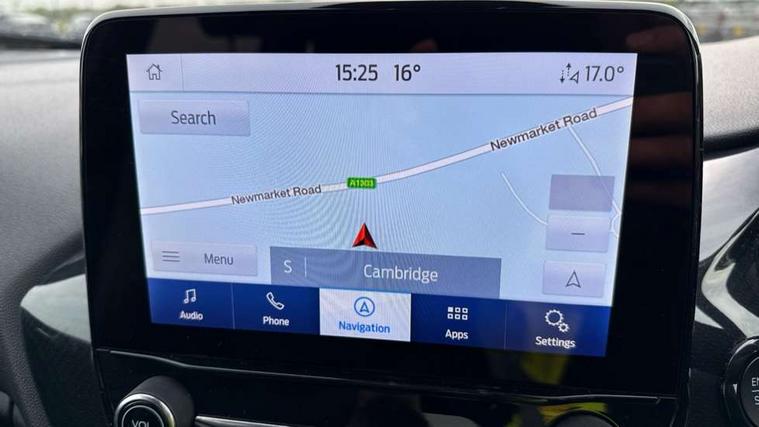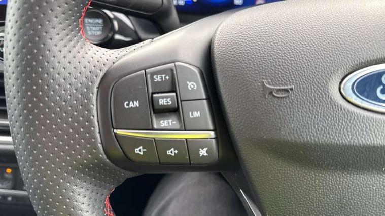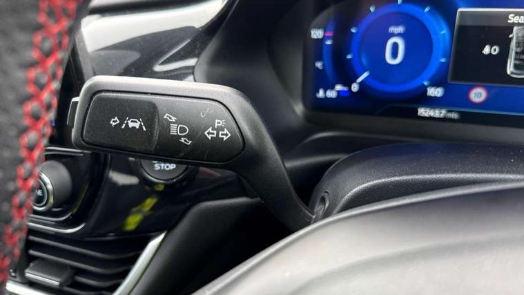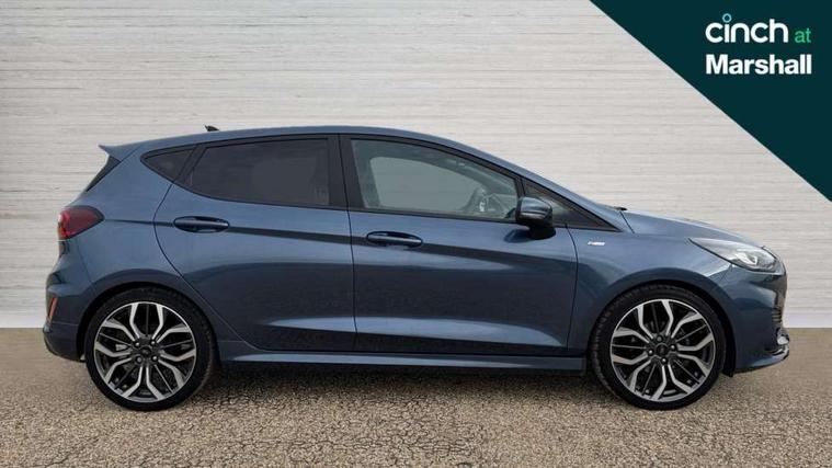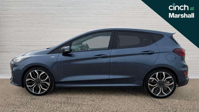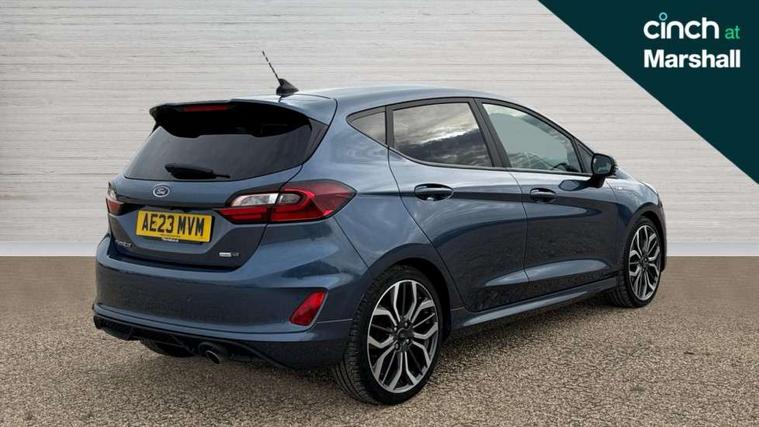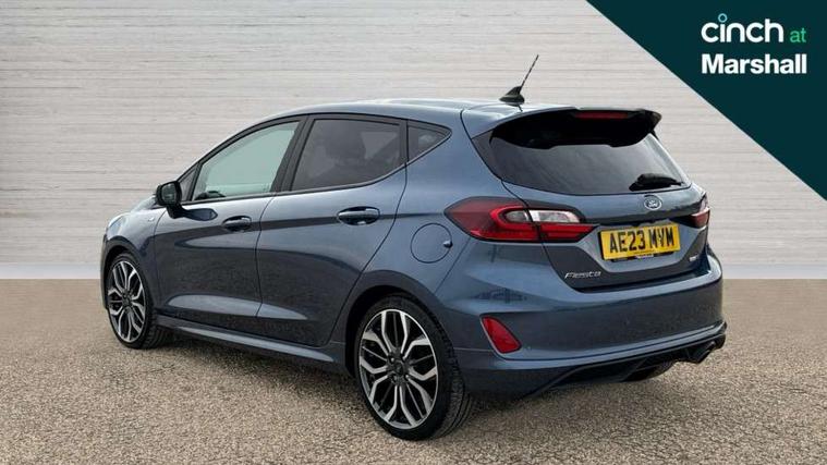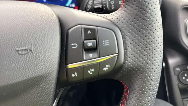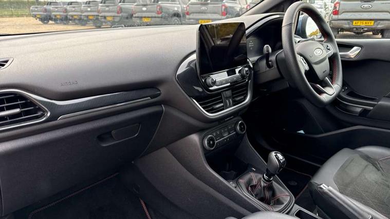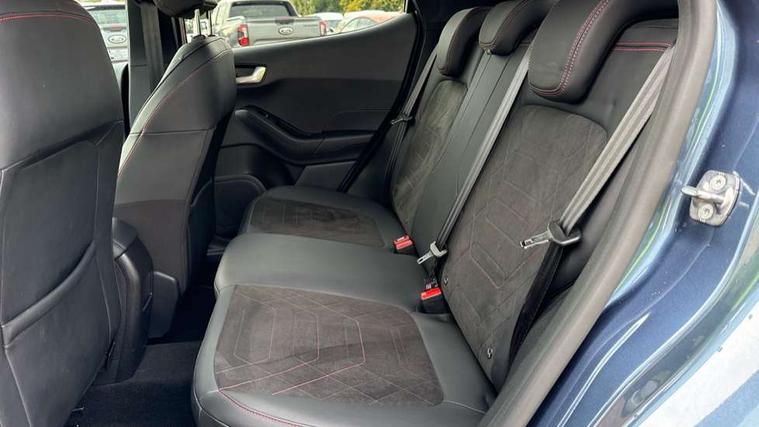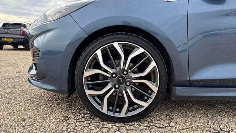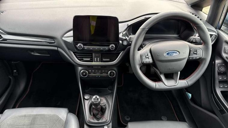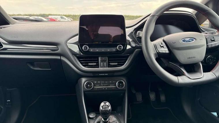 4.2" TFT instrument cluster screen, Bluetooth system, Electric power steering, Ford easy fuel, Rear parking distance sensors, Selectable drive modes (Normal, Sport, Track), Traffic sign recognition, Trip computer, Sports suspension, 2 USB ports, Auxiliary input socket, B&O Premium audio system with 8" touchscreen, 10 speakers, 360 degree sound system, Ford SYNC 3 navigation system and Ford pass connect, DAB Digital radio, Steering wheel mounted controls, Auto high beam, Body colour bumpers, Body colour door handles, Body colour large rear spoiler, Body coloured electrically operated and heated door mirrors with side indicators, Cornering front fog lights, Electric front windows/one touch facility, Electric rear windows, LED Night signature to rear lights, Power foldable door mirrors with puddle lights, Quickclear heated windscreen, Rain sensing wipers and auto dimming rear view mirror, Rear privacy glass, Rear wiper, Unique ST-Line upper grille & full bodystyling kit with ST-Line wing badges, 3 spoke flat bottomed leather steering wheel, 60/40 split folding rear seat, Adjustable head restraints, Black headlining, Boot carpet, Centre console with opening armrest, 2x cupholders, 12v and USB, Chrome inner door handles, Drivers and Passenger lumbar support, EATC - Electronic Auto Temperature control, Footwell illumination, Front floor mats in velour, Front map reading lights, Front seat and rear pockets, Height adjustable passenger seat, Illuminated glovebox, Leather gaiter, LED ambient lighting, Load area light, Manual 4-way driver seat adjust, Overhead console with sunglasses holder, Pollen filter, Rake/reach adjustable steering wheel, Sensico wrapped steering wheel, Sports front seats, NCAP Pack - Fiesta, ST-Line X Trim Pack - Fiesta, 3 point seatbelts on all rear seats, ABS+EBA, Curtain airbags, Driver and passenger airbags, Drivers knee airbag, Electronic stability control with hill start assist, Front passenger airbag deactivation, Front side airbags, Seatbelt warning, Two tone horn, Tyre pressure monitoring system, Ford keyfree system with Keyless entry and keyless start, MyKey system, Remote central locking & engine immobiliser, Thatcham Cat.1 alarm, 18" 5 spoke alloy wheels with rock metallic machined finish,