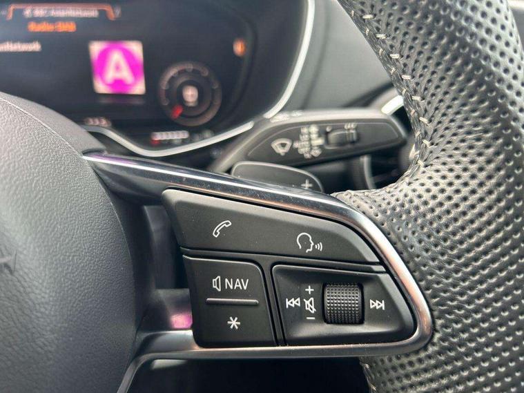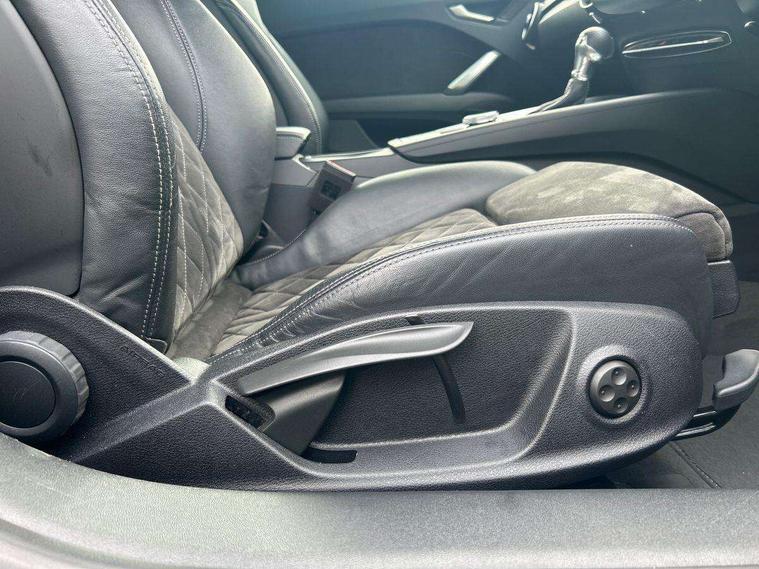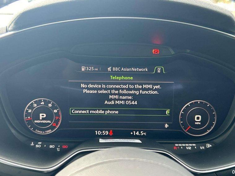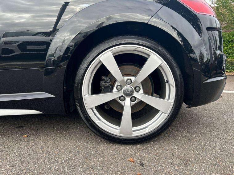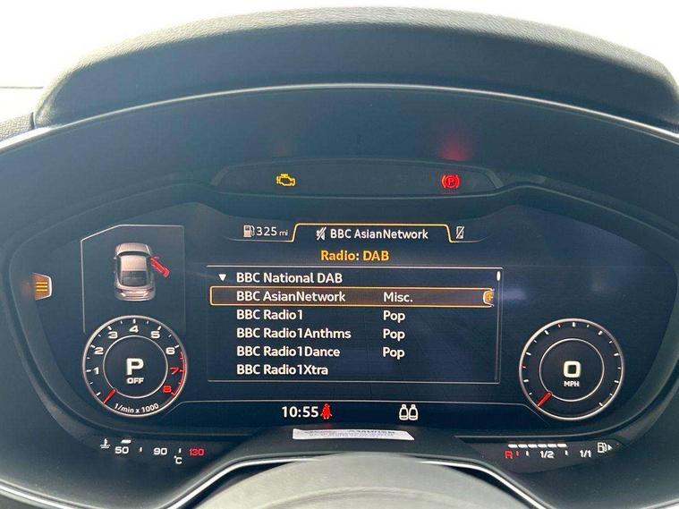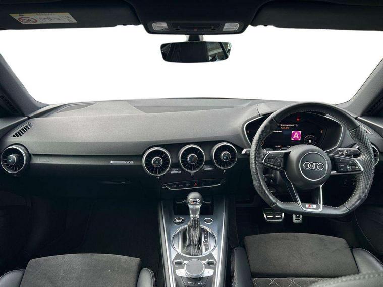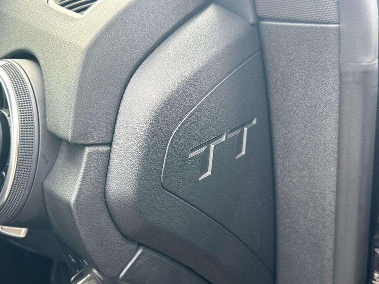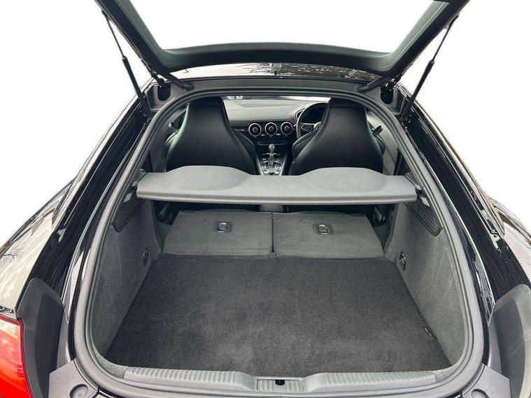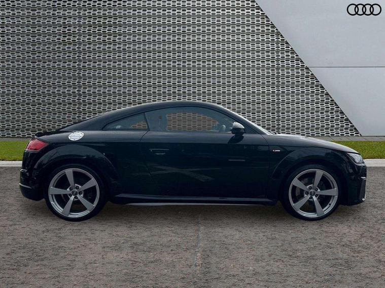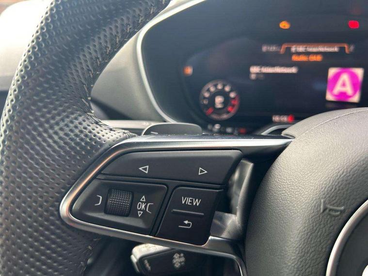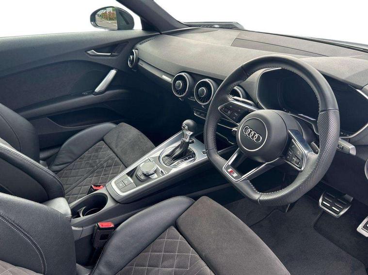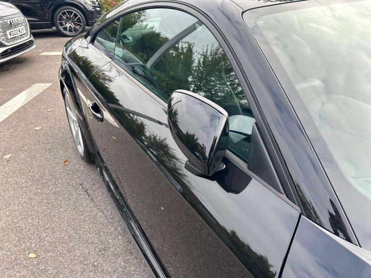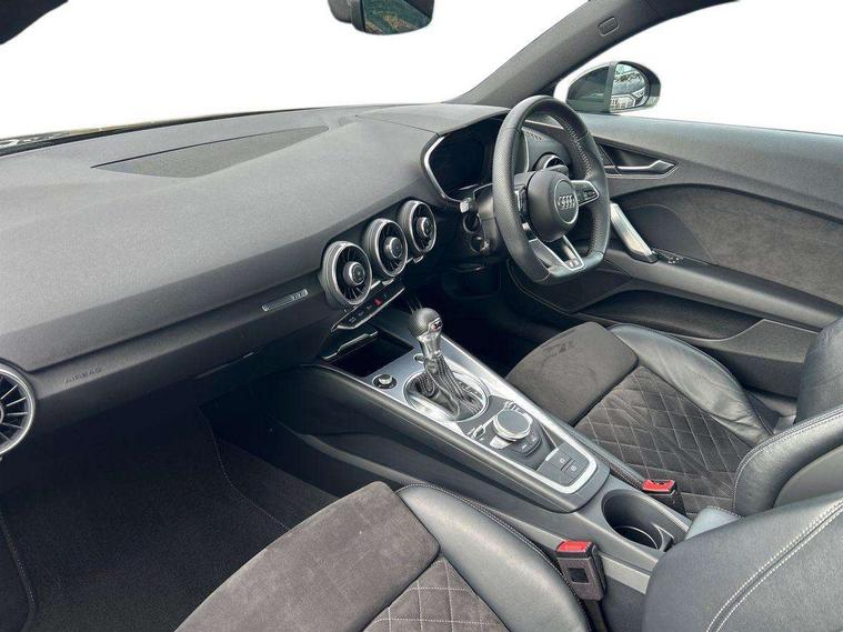 Matt brushed aluminium inlays, Non smoking pack - TT/TT RS, Tyre repair kit, Anti theft alarm, Anti theft wheel bolts, Immobiliser, Keyless Go, Remote central locking, AM/FM radio, Audi music interface, Bluetooth audio streaming, DAB Digital radio, MMI Radio with CD player and SD/XC card slot, 3 point front seat belts, ABS, ASR traction control, Brake energy regeneration, Curtain airbags, Driver and front passenger airbag with front passenger airbag deactivation, EDL traction control, Electromechanical parking brake, ESP, First aid kit, Front side airbags, Head airbags, Hill hold assist, Seatbelt warning, Tyre pressure warning, Warning triangle, Auto dimming rear view mirror, Auto headlight range control, Body colour bumpers, Body colour electrically adjustable and heated door mirrors with built in LED side indicators, Dynamic rear indicators, Electric folding door mirrors, Electric front windows, Front fog lights, Green tinted heat insulating glass, Headlight wash system, High gloss black radiator grille, LED daytime running lights, LED headlights with LED rear lights + dynamic rear indicators, Light and rain sensors, Retractable rear spoiler, S line badges on front wings, S Line body styling, S Line front and rear bumpers, S line rear diffuser with platinum grey insert, S line sill plates, Sunband for windscreen, 12V socket, 3 spoke flat bottomed high multi-function leather sport steering wheel with gearshift paddles, 4 way electric lumbar support for driver and front passenger, Air conditioning, Black headlining, Door sill trims with S line logo, Extended aluminium look with stainless steel pedals, Front centre armrest, Front super sports seats, Heated front seats, Height adjustable driver's seat, Height adjustable front head restraints, Height/reach adjust steering wheel, ISOFIX child seat mounting for front passenger seat with airbag deactivation, Perforated leather gearknob, Rear head restraints, Rear top tether child seat ISOFIX attachment, S Line badge on steering wheel, Split folding rear seat, Tool kit, Top tether anchor plate for isofix child seat, Audi drive select with 4 Pre configured modes, Audi virtual cockpit - 12.3" high-resolution LCD display with fully customisable instrument cluster, Cruise control + speed limiter, MMI touch panel, Mobile phone preparation with bluetooth interface, Progressive power assisted steering, Service interval indicator, Start/Stop system with energy recuperation, TP memo, S line sports suspension,