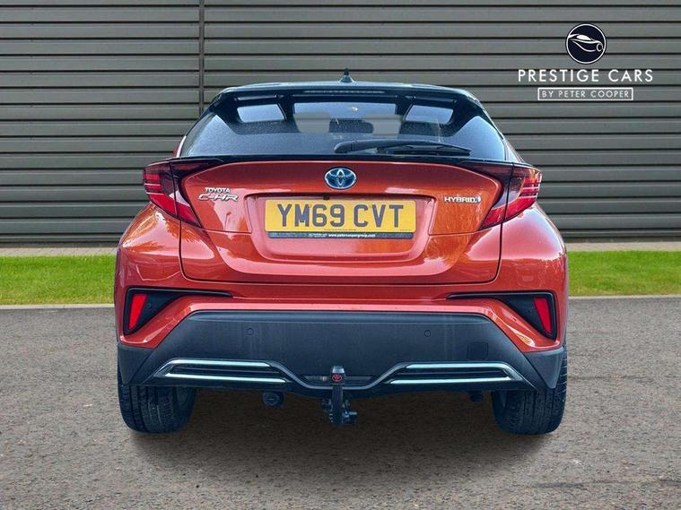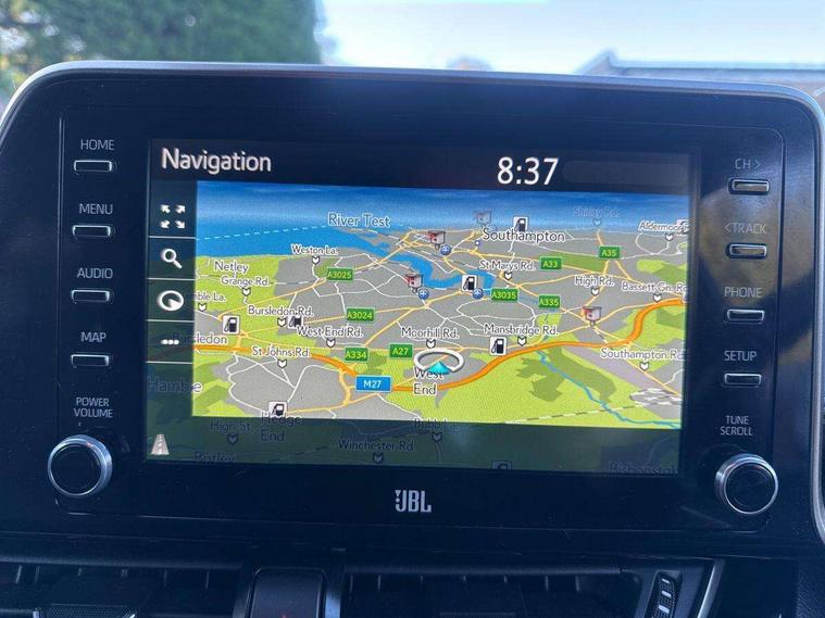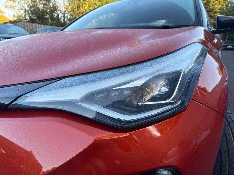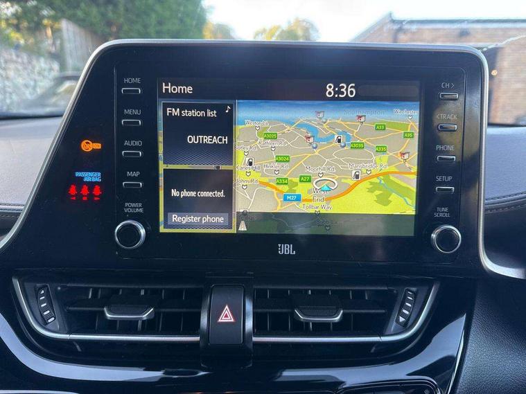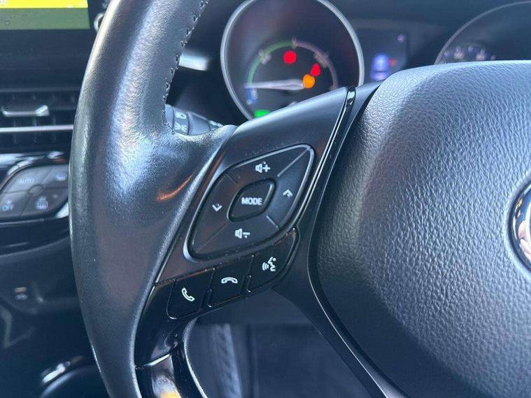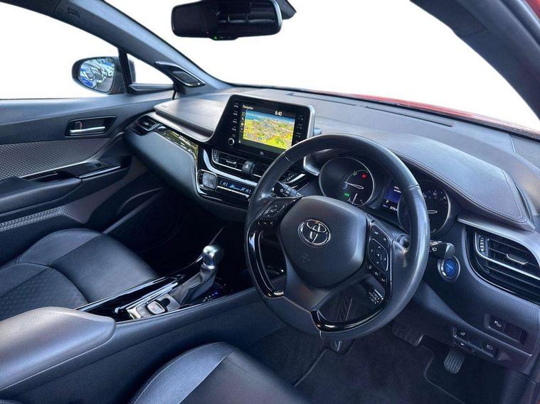 4.2" coloured TFT screen for multi-information display, Adaptive cruise control, Bluetooth connectivity, Electric power steering, Hybrid system indicator, Lane departure alert with steering control, Remote boot door release in cabin, Remote boot door release in key, Reversing camera, Road sign assist - RSA, Simple Intelligent parking assist, Touch 2 Go navigation system, Trip computer, Voice recognition, Vehicle Stability Control (VSC), Aux connectors + 12V front outlet, DAB Radio (Digital Audio Broadcasting), JBL premium sound system with 9 speakers, Toyota touch 2 multimedia system with 8" display, USB connector integrated with radio and CD player, Wi-fi connectivity, Adaptive front light system, Adaptive LED Headlights, Anti-jam protection on power windows, Auto high beam, Auto up and down function on all power windows, Automatic headlight levelling, Automatic headlights, Automatic headlights cut-off, Automatic wipers with heated folding mirrors, Bi-tone black roof, Black and body coloured rear bumper, Black front bumper, Black upper front grille, Body colour door handles, Body colour door mirrors, Boot door release with push button, Electric heated door mirrors, Follow me home headlights, Front and rear power windows, Front spoiler, Hard tonneau cover, Honeycomb lower front grille, LED daytime running lights, LED fog lights, LED front light guide, LED High mounted stop light, LED rear brake lights, LED rear combination lights, Metallic paint, Noise reduction layer on front windows and windscreen, Power adjustable door mirrors, Privacy glass, Rear spoiler, Rear tailgate, Rear window defogger, Rear window wiper, Shark fin antenna, UV-filter on driver and passenger windows, UV-filter on rear windows, 12v power outlet - front, 3 rear headrests, 3 spoke leather steering wheel, 60/40 split folding rear seat, Adjustable rear headrests, Adjustable speed limiter switch on steering wheel, Assist grips front and centre pillar, Audio and telephone switches on steering wheel, Black front door assist grips, Blue ambient lighting on front cup holders, Blue ambient lighting on front doors, Boot light, Chrome interior door handles, Driver and front passenger personal light, Driver and front passenger Whiplash Injury Lessening seats, Driver and passenger seatback pockets, Dual zone automatic air conditioning, Floor mats, Front cupholders, Front head restraints, Front sports seats, Glovebox with internal light, Heated driver and front passenger seats, Heated steering wheel, Hooks for luggage holding net, Humidifying Nanoe air purifier, Illuminated entry system, Isofix attachments on rear seats, Leather gearshift, Leather upholstery, Light on driver sun visor, Light on passenger sun visor, Manual telescopic steering wheel, Manual tilt steering wheel, Manually height adjustable front passenger seat, Manually reclining front passenger seat, Manually sliding front passenger seat, Microphone on front personal light, Mirror on driver sun visor, Mirror on passenger sun visor, Multimedia switches on steering wheel, Pollen filter, Power adjustable lumbar support on driver seat, Power height adjustable driver seat, Power reclining driver seat, Power sliding driver seat, Power tilting cushion on driver seat, Shopping bag hooks, Slow opening on lower glovebox, Voice recognition switch on steering wheel, Leather pack - C-HR, Parking sensor pack - C-HR, Tech pack - C-HR, 16 Disk front wheel brake, 3x3 point rear seatbelts, ABS+EBD+Brake assist, Electronic parking brake, ESP + traction control, Front and rear seatbelt reminder, Front passenger airbag on/off switch, Hill start assist control (HAC), Pre collision system with pedestrian detection, Pre-tensioners and force limiters, Rear door child safety locks, SRS Airbags - Driver + Front passenger, front side, front and rear curtain and driver's knee airbags, Toyota safety sense, Tyre pressure monitoring system, Glass-breaking alarm sensors, Immobiliser, Intrusion alarm, Intrusion sensor, Motion sensor alarm, Power door locks, Power passenger window lock, Remote central locking, Remote door lock, Black lower dashboard, Black lower driver dashboard, Dark brown upper dashboard, Piano black console, Silver deco line on upper dashboard, 18" Matt black alloy wheels with matt black centre cap, Tyre repair kit,