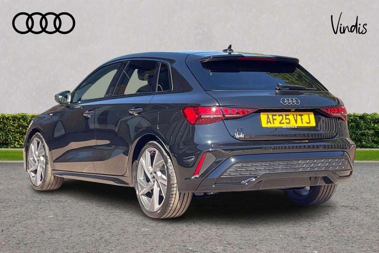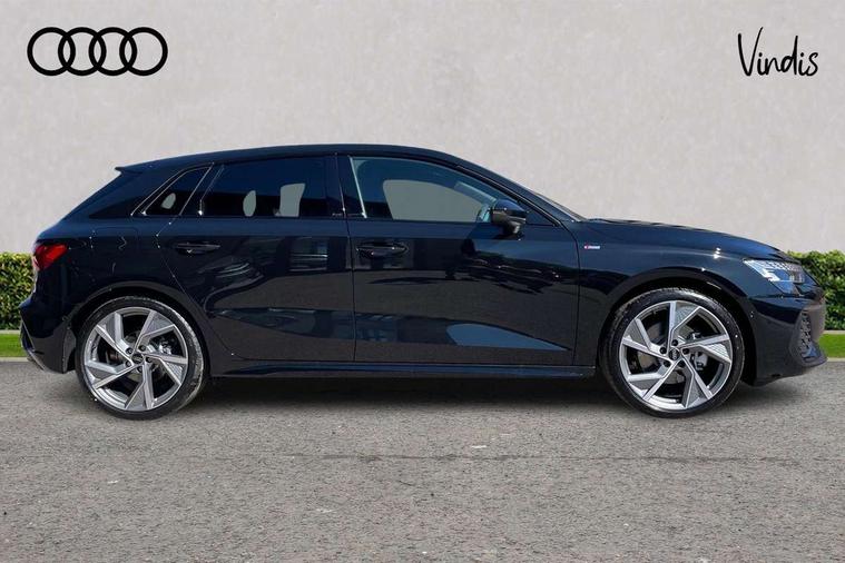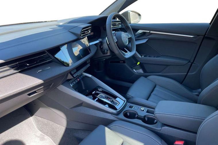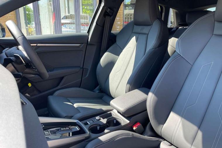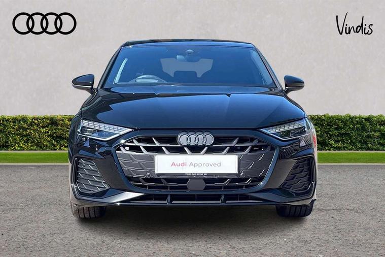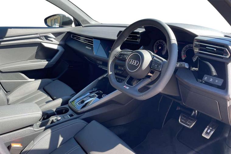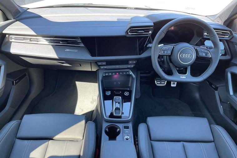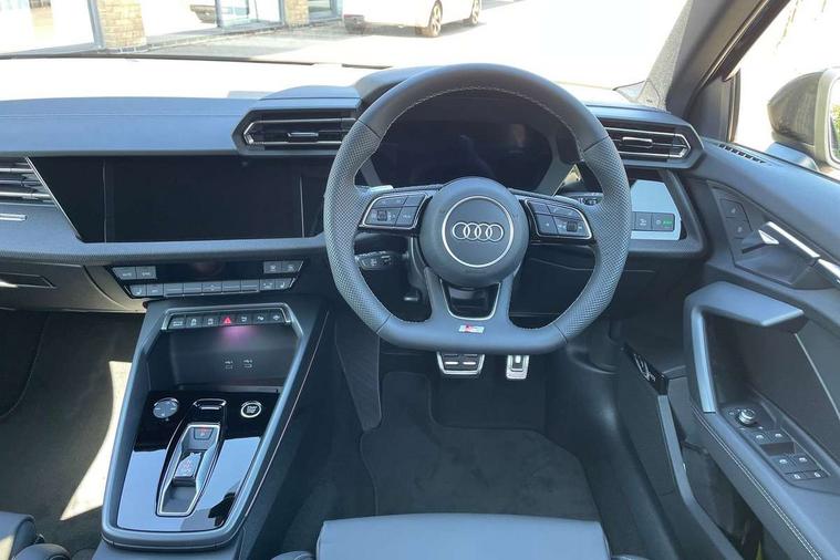 Adjustable speed limiter, Audi drive select, Audi smartphone interface with app store includes wireless Apple carplay, Android auto and Amazon alexa integration, Audi virtual cockpit plus - 12.3" full HD resolution dynamic digital instrument cluster, Automatic start/stop system with recuperation, Bluetooth interface, Camera based traffic sign recognition, Collision avoidance assistant, Cruise control, Distraction and Fatigue warning, e-Call (emergency call), Electromechanical power speed sensitive steering, Emergency assist, Lane departure warning system, MMI Navigation Plus with high resolution 10.1" colour touch screen display, Park Assist with parking system Plus, Service indicator, Tailgate, Trip computer, Voice control system with natural language interaction, Sports suspension, Audi Phonebox light with wireless charging, Audi sound system - 10 loudspeakers including centre loudspeaker and subwoofer, DAB Digital radio, USB ports with charging function in the rear, Acoustic glass windscreen, All weather light, Anthracite grey Audi rings (front and rear), Audi beam uses LEDs to project the Audi logo onto the ground as you exit your A3, Auto dimming frameless rear view mirror, Automatic dynamic range control, Black accents front and rear bumpers, Black accents in the area of the Audi single frame grille, Black accents window trims strips, Dipped beam, main beam, position light and turning light, Electrically adjustable/heated/folding/dimming door mirrors with kerb view includes integrated LED indications + kerb view function for passenger side, Exterior model badging, Front and rear side air inlets in grained matt black with dark liquid chrome frame, Front electric windows, Heat insulating glass windscreen, Illuminated door sills with aluminium inserts at the front with S logo, Intersection light, LED 3rd brake light, LED brake lights, LED daytime running x3, LED headlights with LED rear lights and dynamic rear indicators, LED rear number plate lights, LED reverse light, LED tail lights, Light and rain sensors, Manoeuvring light, Motorway light, Privacy glass - dark tinted rear window, rear door and side windows, Rear diffuser and grill in grained matt black with inlay in dark liquid chrome, Rear electric windows, Rear side wing doors, Rear wiper, S roof spoiler, Static Cornering lights, 12V socket and storage compartment in front centre console, 3 seat bench in 2nd row, 3 spoke flat bottomed leather multifunction sport steering wheel with gear shift paddles, 3-zone deluxe automatic air conditioning, 4 way electrically adjustable lumbar support for driver and front passenger, 40/20/40 split folding rear seat bench, Black cloth headlining, Black front and rear floor mats, Front and rear centre armrest in artificial leather with contrasting stitching on armrests and instrument panel, Front and rear headrests, Heated front seats, Height and reach adjustable steering wheel, Manual boot compartment lid, Manually adjustable front seats, Rear centre armrest with cupholder, S badging on the steering wheel, Seat side bolsters, Single front passenger seat, Stainless steel pedals and front footrest in black, Twin leather upholstery with front sports seats S embossed logo, Aluminium interior elements pack - A3, 3x3 point rear seat belts, Driver and front passenger airbag with passenger airbag deactivation, Electronic Stabilisation Control (ESC) including ABS, ASR and EDL, First aid kit with warning triangle and 2 safety vests, Front side airbags with head airbags and interaction airbag, Hill hold assist, Pre-sense front with pedestrian and cyclist detection, Seatbelt monitoring, Tyre pressure loss indicator, Anti theft alarm, Anti-theft wheel bolts, Electronically operated child locks, Immobiliser, Remote central locking with safelock, Black dashboard,