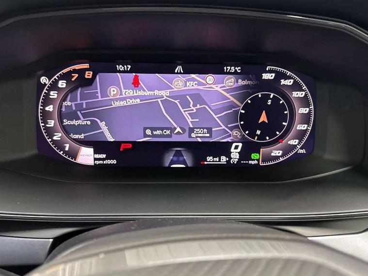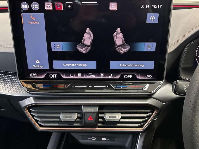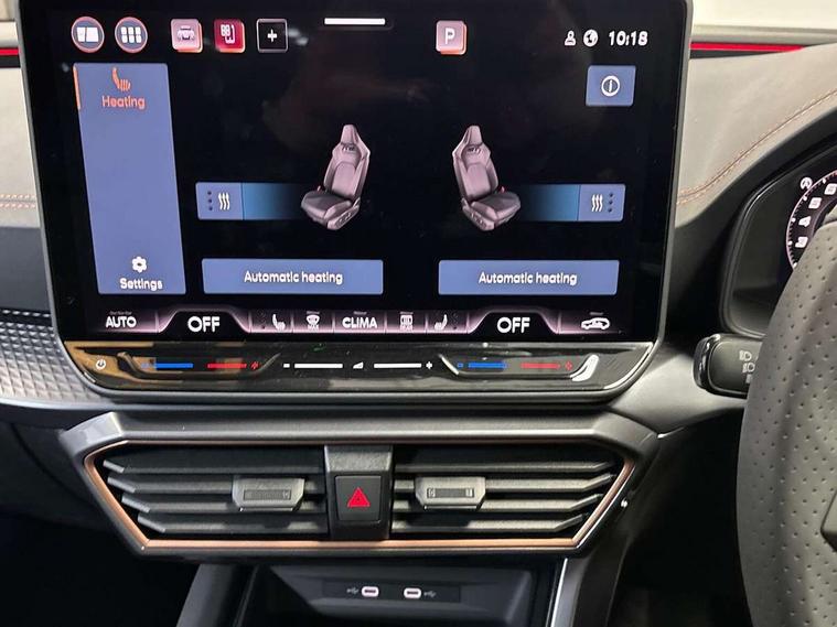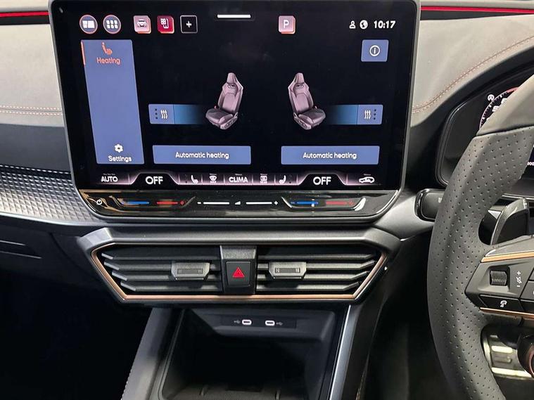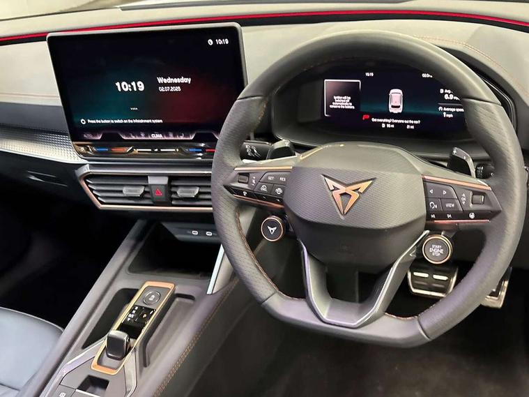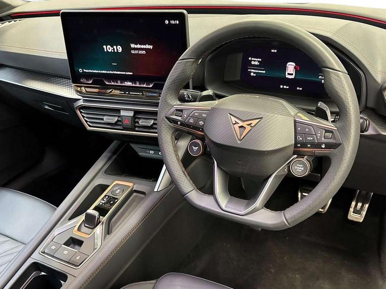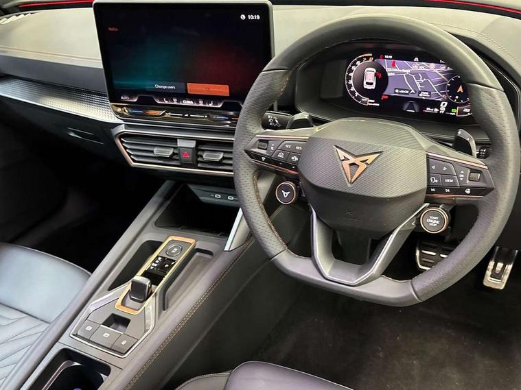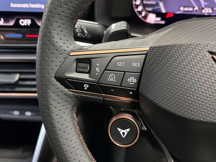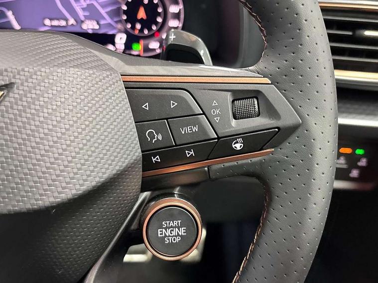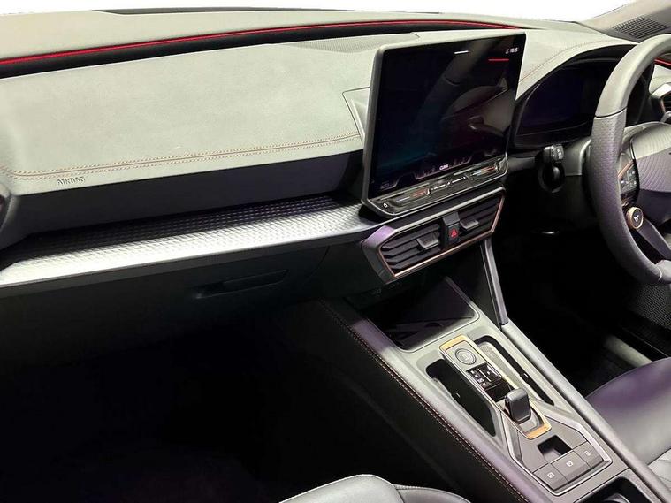 Adaptive cruise control with follow-to-stop and speed limiter, CUPRA drive profile selection with (Comfort/Sport/Individual), throttle response and gearshift mode, Digital cockpit, Dynamic road sign display, E-call, Four x USB Type C ports (2 in front and 2 in rear), Front and rear parking sensors, Front assist with forward collision warning braking reaction to vehicles, pedestrians and cyclists, Full link smartphone integration with Mirror Link, wireless Apple CarPlay and wired Google Android Auto, Intelligent park assist, Lane change assist with emergency assist, Lockable tailgate, Rear view camera, RPM, trip computer, outside temp gauge, instrument light brightness, low fuel warning light, lights on reminder, gearshift indicator, Service interval indicator, Side and exit assist, Start/stop system with regenerative braking, Virtual pedal with electric tailgate, Wireless phone charger, Auxiliary input socket, Auto dimming rear view mirror, Body colour door handles, Body coloured bumpers, Cupra sports bumpers, Dark tinted rear windows, Electric front/rear windows, Electrically adjustable, heated and folding door mirrors, Gloss black roof rails, High beam assist, LED front fog lamps with cornering function, LED headlights with dynamic turn signals, tail lights, rear fog lights with rear coast to coast lighting, LED rear fog lamp, Rain sensing wipers, Rear side wing doors, Rear wash/wipe, Separate daytime running light with automatic headlight control and coming home feature, Third brake light, Welcome light with logo projector in door mirrors, 12v power supply in centre console, 3 seat bench in 2nd row, 5 headrests, 60/40 split rear bench seat with armrest, Ambient lighting (glovebox, footwell, ambient lighting multicoloured), Black headlining, Cupra sports pedals, CUPRA Supersports, heated steering wheel with satellite buttons, Electrically adjustable driver seat and lumbar support with memory function + manually adjustable passenger seat, Front and rear reading lights X 4, Front centre armrest, Heated front seats, Height/reach adjust steering wheel, Illuminated interior front door sills, Interior wraparound lighting, ISOFIX points in outer rear seats with top tether anchorage points, Leather upholstery, Single front passenger seat, Sliding boot cover, Storage pockets on rear of front seats, Sunvisors with illuminated mirror, Three zone climate control, Dynamic and comfort pack - Leon Cupra, Media system plus with 12.9" display + navigation pack - Leon Cupra, 3 point seatbelts on all rear seats, ABS, Brake control system - ESC and brake booster, Child proof door locks, Cupra black brake calipers, Driver and front passenger airbags with front passenger airbag de-activation, front side and curtain airbags, Electronic parking brake, Hill hold control, Pre-crash front and rear seat belt tensioner, window closure and hazard lights, Rear disc brakes, Seat belt reminder for front and rear seats, Tiredness recognition system, Tyre pressure monitoring system, Anti theft alarm system with interior monitoring in cab, backup horn and towing protection, KESSY Advanced - Keyless start, keyless entry, Locking wheel bolts, Chrome and copper interior detailing, Tool kit,