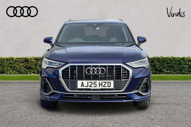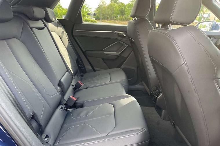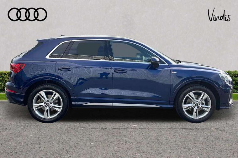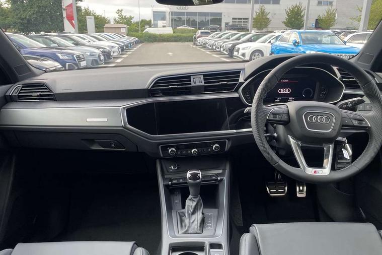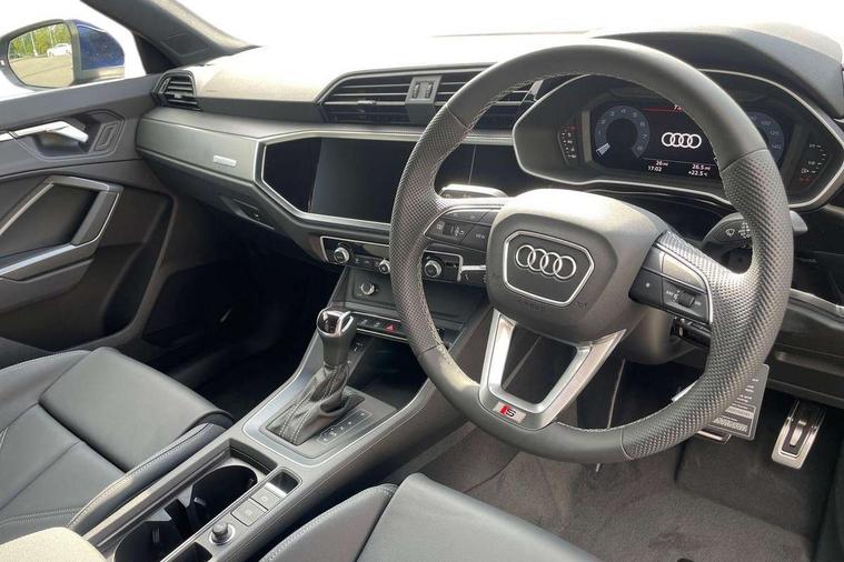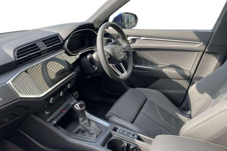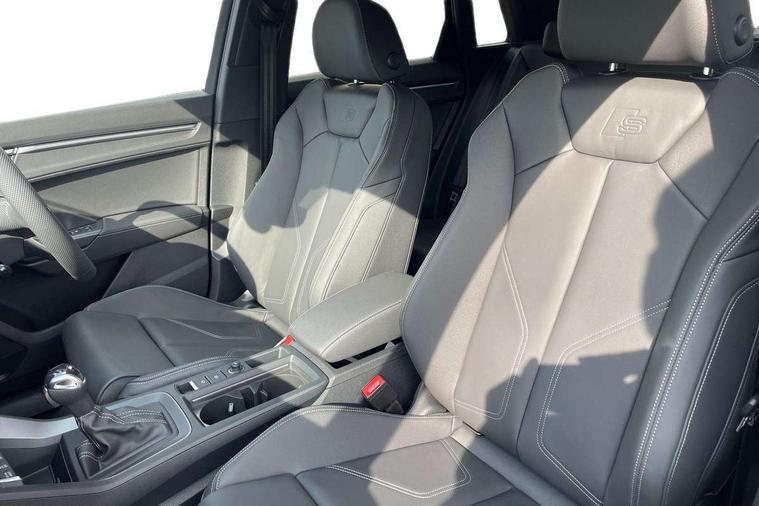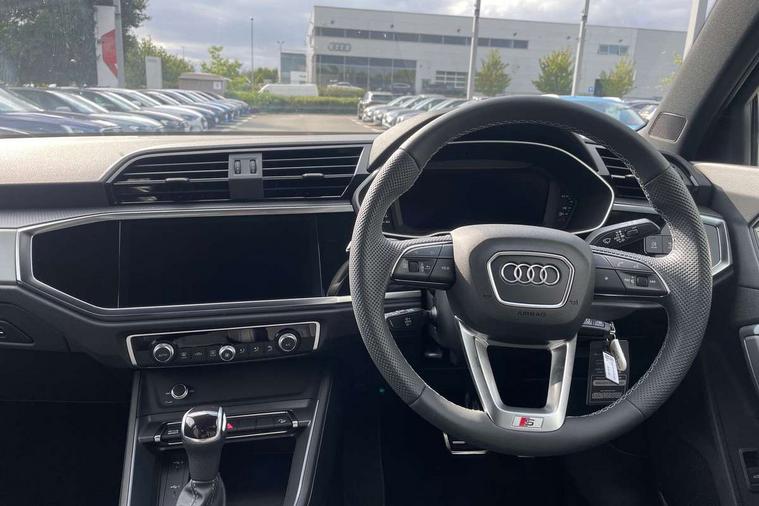 Amazon alexa Integration, Audi connect safety and service, Audi drive select, Audi lane departure warning, Audi Virtual Cockpit - 10.25" display, Bluetooth interface, Camera based traffic sign recognition, Distraction and Fatigue warning, Legal emergency call, MMI Navigation Plus with high resolution 10.1 inch touchscreen colour display, Power operated tailgate, Progressive steering, Service interval indicator, Smartphone interface includes wireless Apple carplay/Android Auto, Start stop system with recuperation, Voice control system with natural language interaction, Sports suspension, 2 USB-C ports with charge and data functions, 6 passive loudspeakers, DAB digital radio module, Acoustic windscreen, Aluminium roof rails, Aluminium window trim, Anthracite black radiator grille, Auto dimming door mirrors, Auto dimming frameless rear view mirror, Body colour front spoiler blade, Electrically folding, adjustable and heated door mirrors with integrated LED side indicators and kerb view function for passenger side, Front and rear electric windows, Front fog lights, Front side air inlets in matt platinum grey, Grille vertical bars in aluminium silver/Matt, High gloss black finish B and C pillars, LED Dynamic rear indicators, LED headlights with LED daytime running lights, LED rear lights, LED third brake light, Privacy glass dark tinted rear and rear-side windows (from B-pillar backwards), Rain and light sensors, Rear diffuser grille in grained matt black, Rear diffuser strip in matt anthracite black, Rear side wing doors, Rear wiper, S line badges on front wings, S Line front and rear bumpers and side skirts, Side skirt insert in matt Platinium grey, Variable front intermittent wipers, 12V socket in rear centre console, 3 seat bench in 2nd row, 3 spoke leather multifunction steering wheel features S badging and grips in perforated leather with contrast stitching, 40:20:40 folding with manual adjustment for 60:40 forwards/backwards position and backrest angle, Adjustable rear seat bench/backrest with centre armrest and cupholder, Black carpet mats, Black cloth headlining, Dual zone electronic climate control, Electric lumbar support, Front and rear black floor mats with contrast stitching in rock grey, Front and rear headrests, Front centre armrest, Height and reach adjustable steering wheel, Horizontal trim strip in matt platinum grey, Illuminated door sill trims with S logo, ISOFIX child seat mounting for front passenger with airbag deactivation and outer rear seat including top tether attachment point for outer rear seats, Luggage compartment sill protection in stainless steel, Manual front seats with height adjustment, Perforated leather gearknob, Single front passenger seat, Stainless steel pedals, Twin leather upholstery with front sport seats + S embossing, Non smoking pack - Q3, 3x3 point rear seatbelts, 6 airbags - Driver, front passenger, curtain and side windows, Audi pre-sense front with pedestrain and cyclist recognition, Electrically operated child locks on rear doors, Electromechanical parking brake, Electronic stabilisation control including ABS, ASR and EDL, Front seatbelt reminder, Hill descent control, Hill hold assist, Pre sense basic, Seatbelt monitoring, Tyre pressure warning, Warning triangle and first aid kit, Anti theft wheel bolts, Immobiliser, Remote central locking, Thatcham approved category 1 anti theft alarm, Aluminium look interior elements, Dark matt brushed aluminium inlay, Detail dashboard around MMI touch colour display in glass look, black with surround in aluminium look, Leatherette door armrest,