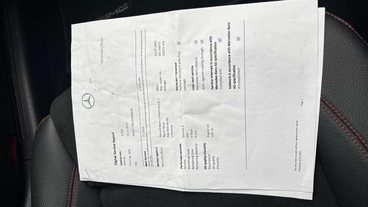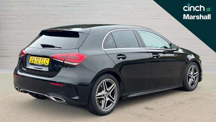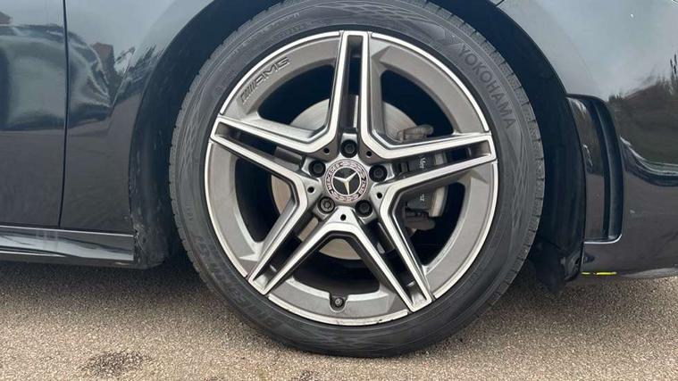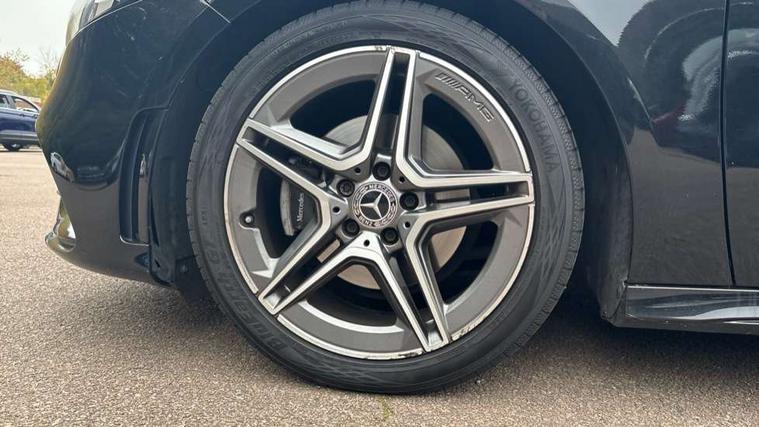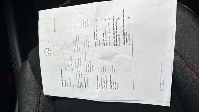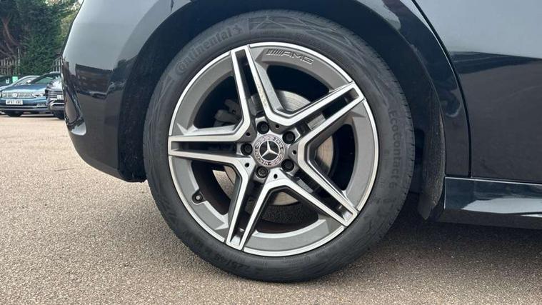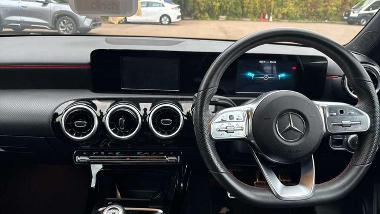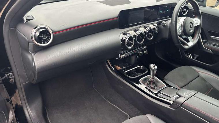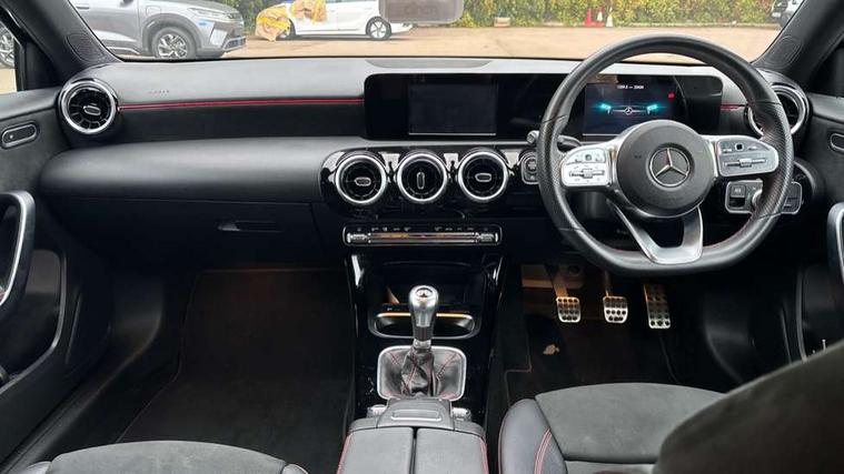 180 degree rear view camera with parking guidelines, 7" colour screen in instrument panel, 7" touchscreen media display, Active lane keep assist, Attention assist, Brake pad wear indicator warning light, Car wash mode, Cruise control + speed limiter, Direct steering, Dual bluetooth interfaces, DYNAMIC SELECT with a choice of driving modes (ECO, Comfort, Sport and Individual), ECO start/stop function, Fluid level warning indicator for fuel, oil, coolant and washer fluid, Hard-disk navigation, Hey Mercedes Voice activation, Lamp failure indicator, Mercedes me connect including emergency call system, accident recovery, breakdown and maintenance management, Outside temperature gauge, Owners manual in English, Pre-installation for private car sharing, Pre-installation for Vehicle Monitoring, Pre-installation for Vehicle Setup, Preinstallation for Mercedes Benz link, Service indicator (ASSYST), Speed sensitive power steering, Trip computer, Lowered comfort suspension, Rear axle torsion beam, 2 USB ports (type C) in rear stowage compartment and one in front of center console, 6 speakers, DAB Digital radio, MBUX multimedia system with DAB digital radio and touchpad including satellite navigation, Mercedes-Benz sound system - 100W, 4 Electric Front and Rear windows, Adaptive brake lights, AMG bodystyling - Front apron with splitter in chrome, rear apron with chrome trim and chrome visible trim elements in tailpipe, Black weather strip, Body colour bumpers, Body colour door handles, Body colour side skirt, Body coloured door mirrors, Chrome beltline trim, Diamond radiator grille with chrome pins and silver louvre + chrome insert, Electric adjustable and heated door mirrors with integrated LED side indicators, Exhaust system - Twin visible tailpipes in polished stainless steel, Headlamp assist automatic headlamp activation, Heated glass rear windscreen + timer control, LED high performance headlamps with integrated LED daytime running lights, LED tail lamp, LED third brake light, Privacy glass, Radio aerial, Rain sensing windscreen wipers with two sensitivity settings, Rear fog lights, Rear wiper, Window line trim strip in chrome, 3 Spoke flat bottom leather multi function steering wheel with perforated leather in grip area, 40:20:40 split folding rear seats, Artico man-made leather/Microfibre Dinamica upholstery with red contrast stitching, Auto Mercedes-Benz child seat recognition sensor, Black air vents with surround in silver chrome, Black roof lining, Brushed stainless steel sports pedals with rubber studs, Controller on centre console with chrome surround, Floor mats with stitched edging and AMG lettering, Front centre armrest with storage compartment, Front door sills with Mercedes Benz lettering, Front seat backs luggage nets, Front seat cushion length adjustment, Heated front seats, Height/reach adjustable steering column, Interior mirror with reading lamps in black and frameless, Manual height adjustable front seats, Rear head restraints, Seat occupancy sensor for front passenger seat, Sports seats with integrated headrests, Sunvisors with illuminated vanity mirrors, Touchpad on center console, Twin front cupholders, Two zone thermotronic luxury automatic climate control, Light and sight pack - A Class, Seat comfort pack - A Class, 3 rear 3 point seatbelts, ABS with Brake Assist, Active bonnet, Active brake assist includes forward collision warning system with autonomous braking, Adaptive brake assist with hold function and hill start assist, Black seatbelts, Childproof locks manually operated for rear doors and electrically operated for rear power windows, Crash responsive emergency lighting, Driver and passenger head and side airbags, Drivers knee airbag, Dual stage driver/passenger airbags, Electronic parking brake, ESP curve dynamic assist, ESP with ASR, Front and rear seatbelt reminder, Front brake callipers with Mercedes Benz lettering, ISOFIX and top tether child seat fixing points in two outer rear seats, Tyre pressure monitoring system, Warning triangle and first aid kit, Window airbags, Alarm system/interior protection/immobiliser, Keyless Go, Remote central locking and crash sensor with emergency opening function, Urban guard vehicle protection system with immobiliser and interior protection, Dinamica microfibre trim in black, 18" AMG 5 twin spoke light alloy wheels in titanium grey with highsheen finish, Summer tyres, Tirefit sealant kit,