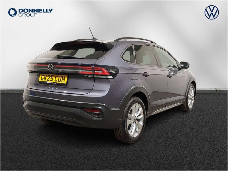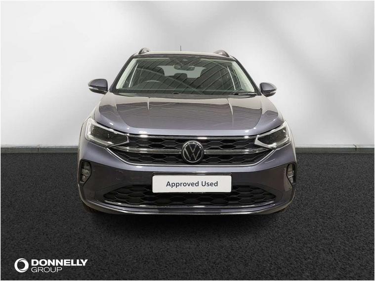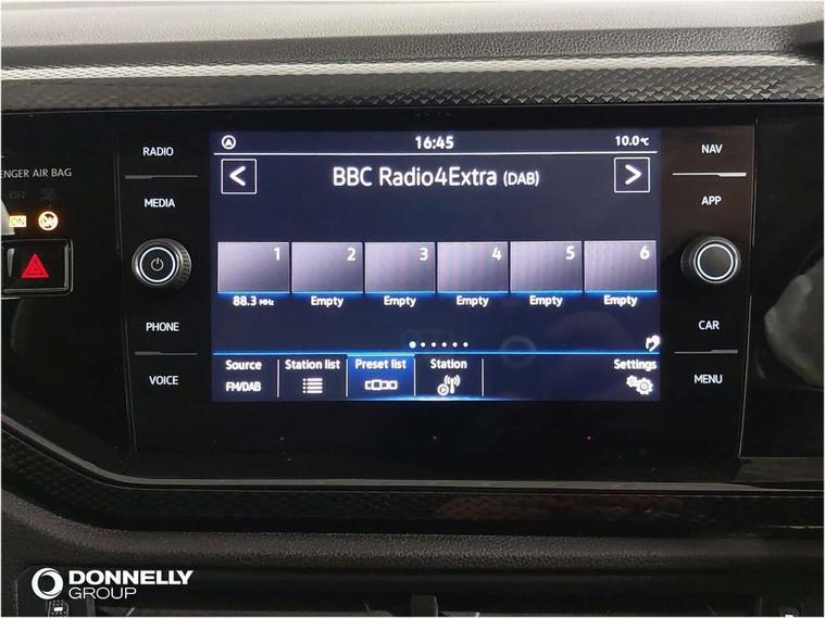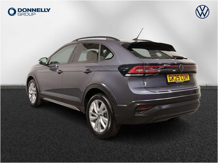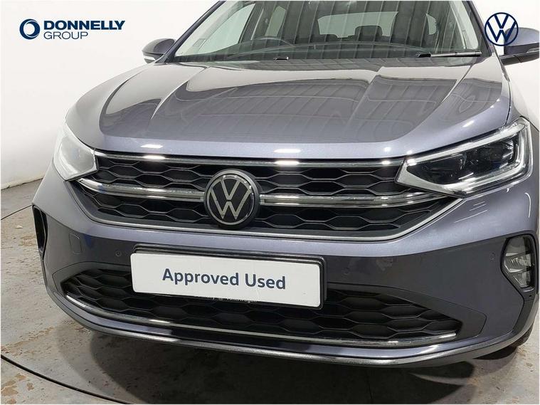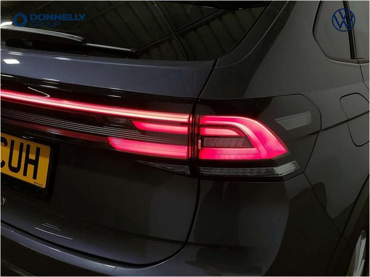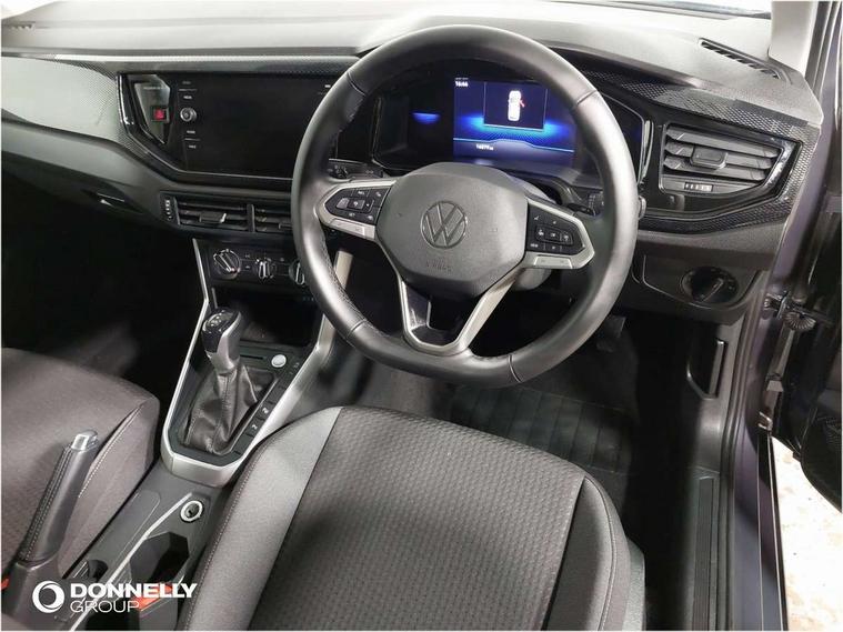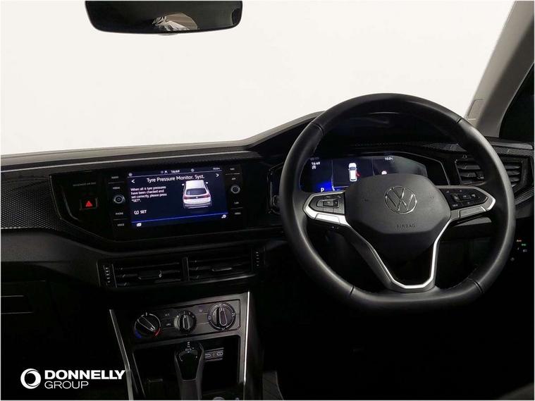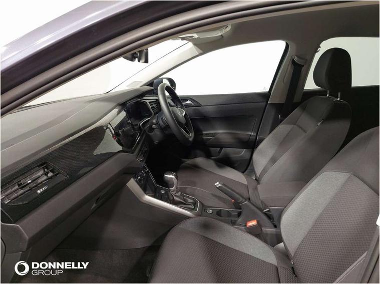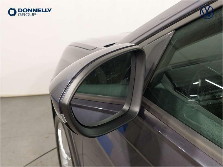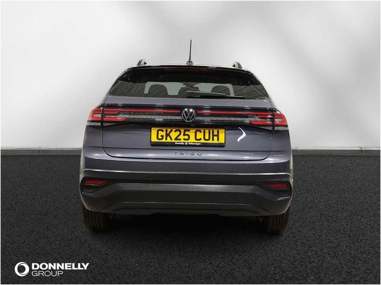Adaptive cruise control, Advanced driver attention and drowsiness monitor, Dynamic road sign display, e-Call (emergency call), Power Steering, Rear view camera, Travel assist including emergency assist, Washer fluid level indicator, Wireless Charging including Bluetooth, Start-stop system with battery regeneration (recuperation - energy recovery during braking), WeConnect plus, Ambient lighting with logo projection, Aspherical driver's exterior mirror, Body coloured bumpers, Body coloured exterior mirror housings and door handles, Electric windows, External USB type C socket and charging sockets, Heat insulating glass windscreen, LED rear combination lamp, LED third brake light, Left convex exterior mirror, Power folding adjustable/heated exterior mirrors and front passenger exterior mirror lowering function, Rear fog light on one side, reversing light on both sides, Rear side wing doors, Rear wash/wipe with intermittent wipe setting, Side windows in heat-insulating glass, from B-pillar and rear window dark tinted, 'Slash/ Austin' Cloth upholstery, 12V socket in centre console, 2 front reading lights, 3 rear head restraints, 3 seat bench in 2nd row, Black carpets, Ceramique headliner, Child seat anchor for child seat system i-Size, 2x top tether and child seat anchor in front on front passenger side, Door and side trim panels in titan black, Driver and front passenger seat height adjustment, Front centre armrest, Handbrake lever handle in leather, Height and reach adjustable steering wheel, Leather trimmed gear knob, Leather wrapped multifunction steering wheel with paddle shift, Luggage compartment floor, Luggage compartment light, Lumbar support for driver's and front passengers seat, Seat covers in titanium black, Single front passenger seat, Split folding backrest with centre armrest and unsplit rear seat bench, Storage compartment under front seats, Sun visors with illuminated vanity mirrors, Titanium black instrument panel, Chrome Package - Taigo, Drivers assistance package - Taigo, Light and sight pack - Taigo, 2 x 3-point seatbelts/outer rear seats with ECE label, 3-point seat belts in front with pretensioner and height adjustment, 3-point seatbelt for centre rear seat, Driver and front passenger airbag with front passenger airbag deactivation, Driver and front passenger safety-optimised head restraints, Electronic stability control, Extended and predictive pedestrian/ cyclist protection, Front and rear disc brakes, Front curtain and side airbags with center airbag, Hill start assist, Manual rear child locks, Single tone horn, Tyre pressure loss indicator, Anti-theft alarm system with interior monitoring, backup horn, and towing protection, Keyless locking and starting system keyless access with safelock, Black (slush) Dashboard, Lava stone black gloss/matt decorative inserts in dash and front door panels, Low rolling resistance tyres,
