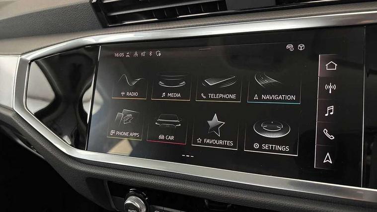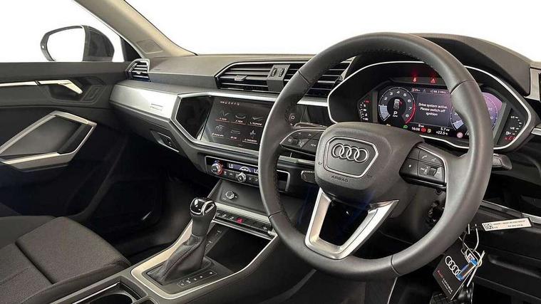 Amazon alexa Integration, Audi connect safety and service, Audi drive select, Audi lane departure warning, Audi Virtual Cockpit - 10.25" display, Bluetooth interface, Camera based traffic sign recognition, Distraction and Fatigue warning, Legal emergency call, MMI Navigation Plus with high resolution 10.1 inch touchscreen colour display, Power operated tailgate, Progressive steering, Service interval indicator, Smartphone interface includes wireless Apple carplay/Android Auto, Start stop system with recuperation, Voice control system with natural language interaction, Standard suspension, 2 USB-C ports with charge and data functions, 6 passive loudspeakers, DAB digital radio module, Acoustic windscreen, Aluminium roof rails, Aluminium window trim, Anthracite black radiator grille, Auto dimming door mirrors, Auto dimming frameless rear view mirror, Electrically folding, adjustable and heated door mirrors with integrated LED side indicators and kerb view function for passenger side, Front and rear bumpers, wheel arch trims and side sill trims in contrasting Manhattan grey paint finish, Front and rear electric windows, Front fog lights, Front side air inlets in matt selenite silver, Front spoiler in matt selenite silver, Grille vertical bars in aluminium silver/Matt, High gloss black finish B and C pillars, LED headlights with LED daytime running lights, LED third brake light, Rain and light sensors, Rear diffuser strip in matt selenite silver, Rear side wing doors, Rear wiper, Variable front intermittent wipers, 12V socket in rear centre console, 3 seat bench in 2nd row, 3 spoke multi-function leather steering wheel, 40:20:40 folding with manual adjustment for 60:40 forwards/backwards position and backrest angle, Black carpet mats, Door sill trims with aluminium inlay, Dual zone electronic climate control, Electric lumbar support, Front and rear floor mats, Front and rear headrests, Front centre armrest, Height and reach adjustable steering wheel, ISOFIX child seat mounting for front passenger with airbag deactivation and outer rear seat including top tether attachment point for outer rear seats, Luggage compartment sill protection in stainless steel, Lunar silver cloth headlining, Manual front seats with height adjustment, Single front passenger seat, Non smoking pack - Q3, 3x3 point rear seatbelts, 6 airbags - Driver, front passenger, curtain and side windows, Audi pre-sense front with pedestrain and cyclist recognition, Electrically operated child locks on rear doors, Electromechanical parking brake, Electronic stabilisation control including ABS, ASR and EDL, Front seatbelt reminder, Hill descent control, Hill hold assist, Pre sense basic, Seatbelt monitoring, Tyre pressure warning, Warning triangle and first aid kit, Anti theft wheel bolts, Immobiliser, Remote central locking, Thatcham approved category 1 anti theft alarm, Aluminium look interior elements, Detail dashboard around MMI touch colour display in glass look, black with surround in aluminium look, Micrometallic silver inlay,