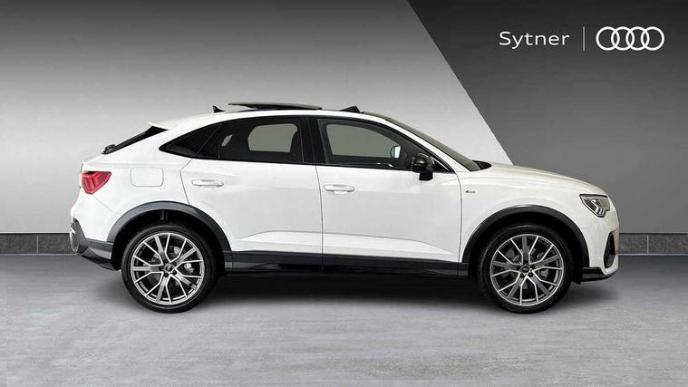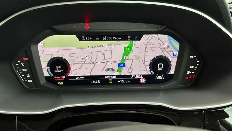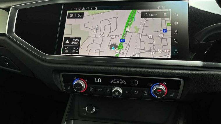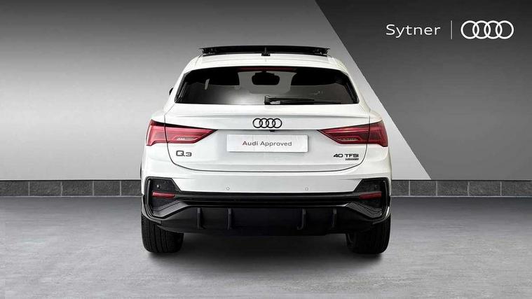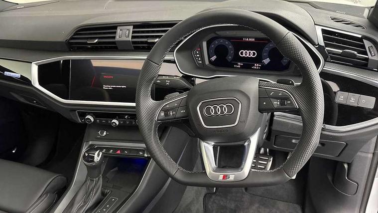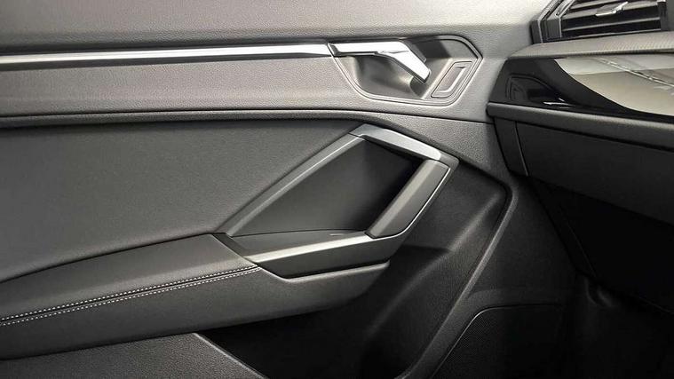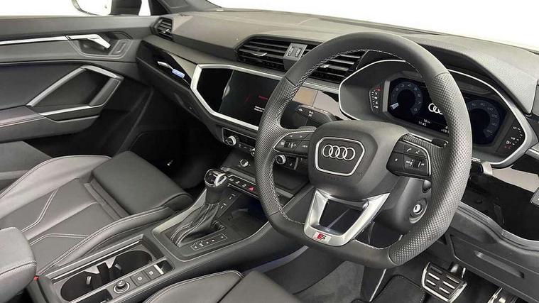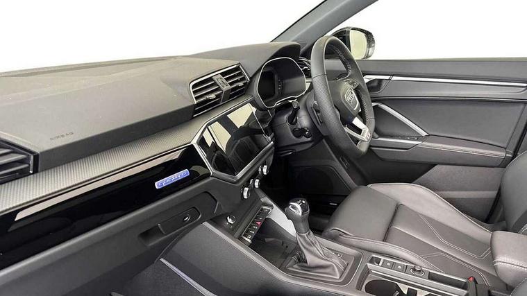 Audi connect safety and service, Audi drive select, Audi lane departure warning, Audi Virtual Cockpit - 10.25" display, Bluetooth interface, Camera based traffic sign recognition, Distraction and Fatigue warning, Legal emergency call, MMI Navigation Plus with high resolution 10.1 inch touchscreen colour display, Power operated tailgate, Progressive steering, Service interval indicator, Smartphone interface includes wireless Apple carplay/Android Auto, Start stop system with recuperation, Voice control system with natural language interaction, Sports suspension, 2 USB-C ports with charge and data functions, 6 passive loudspeakers, DAB digital radio module, Acoustic windscreen, Audi Beam uses LEDs to project the Audi logo onto the ground as you exit your Q3, Auto dimming door mirrors, Auto dimming frameless rear view mirror, Electrically folding, adjustable and heated door mirrors with integrated LED side indicators and kerb view function for passenger side, Front and rear electric windows, Front fog lights, Front underbody protection in manhattan grey paint finish, High gloss black finish B and C pillars, Honeycomb design radiator grille in matt anthracite black, LED Dynamic rear indicators, LED headlights with LED daytime running lights, LED rear lights, LED third brake light, Privacy glass dark tinted rear and rear-side windows (from B-pillar backwards), Rain and light sensors, Rear diffuser grille in grained matt black, Rear diffuser strip in matt anthracite black, Rear side wing doors, Rear underbody protection in matt black, Rear wiper, S line front and rear bumpers and side skirts in contrasting Manhattan grey paint finish, Variable front intermittent wipers, 12V socket in rear centre console, 3 seat bench in 2nd row, 40:20:40 folding with manual adjustment for 60:40 forwards/backwards position and backrest angle, Adjustable rear seat bench/backrest with centre armrest and cupholder, Black carpet mats, Black cloth headlining, Dual zone electronic climate control, Electric lumbar support, Front and rear black floor mats with contrast stitching in rock grey, Front and rear headrests, Front centre armrest, Height and reach adjustable steering wheel, Illuminated door sill trims with S logo, ISOFIX child seat mounting for front passenger with airbag deactivation and outer rear seat including top tether attachment point for outer rear seats, Luggage compartment sill protection in stainless steel, Manual front seats with height adjustment, Perforated leather gearknob, Single front passenger seat, Stainless steel pedals, Twin leather upholstery with front sport seats + S embossing, Black styling pack - Q3, Non smoking pack - Q3, 3x3 point rear seatbelts, 6 airbags - Driver, front passenger, curtain and side windows, Audi pre-sense front with pedestrain and cyclist recognition, Electrically operated child locks on rear doors, Electromechanical parking brake, Electronic stabilisation control including ABS, ASR and EDL, Front seatbelt reminder, Hill descent control, Hill hold assist, Pre sense basic, Seatbelt monitoring, Tyre pressure warning, Warning triangle and first aid kit, Anti theft wheel bolts, Immobiliser, Remote central locking, Thatcham approved category 1 anti theft alarm, Aluminium look interior elements, Detail dashboard around MMI touch colour display in glass look, black with surround in aluminium look, Leatherette door armrest, Piano black inlay,