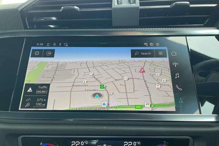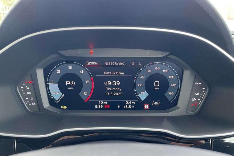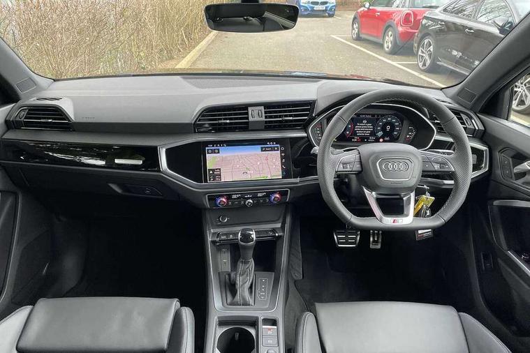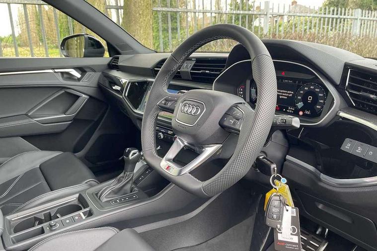 Amazon alexa Integration, Audi connect safety and service, Audi drive select, Audi lane departure warning, Audi Virtual Cockpit - 10.25" display, Bluetooth interface, Camera based traffic sign recognition, Distraction and Fatigue warning, Legal emergency call, MMI Navigation Plus with high resolution 10.1 inch touchscreen colour display, Power operated tailgate, Progressive steering, Service interval indicator, Smartphone interface includes wireless Apple carplay/Android Auto, Start stop system with recuperation, Voice control system with natural language interaction, Diesel particulate filter, Sports suspension, 2 USB-C ports with charge and data functions, 6 passive loudspeakers, DAB digital radio module, Acoustic windscreen, Audi Beam uses LEDs to project the Audi logo onto the ground as you exit your Q3, Auto dimming door mirrors, Auto dimming frameless rear view mirror, Black roof rails, Electrically folding, adjustable and heated door mirrors with integrated LED side indicators and kerb view function for passenger side, Front and rear electric windows, Front fog lights, Grille vertical bars in aluminium silver/Matt, High gloss black finish B and C pillars, LED Dynamic rear indicators, LED headlights with LED daytime running lights, LED rear lights, LED third brake light, Privacy glass dark tinted rear and rear-side windows (from B-pillar backwards), Rain and light sensors, Rear diffuser grille in grained matt black, Rear diffuser strip in matt anthracite black, Rear side wing doors, Rear wiper, S line bumpers in contrasting Manhattan grey, Variable front intermittent wipers, 12V socket in rear centre console, 3 seat bench in 2nd row, 40:20:40 folding with manual adjustment for 60:40 forwards/backwards position and backrest angle, Adjustable rear seat bench/backrest with centre armrest and cupholder, Black cloth headlining, Dual zone electronic climate control, Electric lumbar support, Front and rear black floor mats with contrast stitching in rock grey, Front and rear headrests, Front centre armrest, Height and reach adjustable steering wheel, Illuminated door sill trims with S logo, ISOFIX child seat mounting for front passenger with airbag deactivation and outer rear seat including top tether attachment point for outer rear seats, Manual front seats with height adjustment, Perforated leather gearknob, Single front passenger seat, Stainless steel luggage compartment sill finisher, Stainless steel pedals, Twin leather upholstery with front sport seats + S embossing, Black styling pack - Q3, Non smoking pack - Q3, 3x3 point rear seatbelts, 6 airbags - Driver, front passenger, curtain and side windows, Audi pre-sense front with pedestrain and cyclist recognition, Electrically operated child locks on rear doors, Electromechanical parking brake, Electronic stabilisation control including ABS, ASR and EDL, Front seatbelt reminder, Hill descent control, Hill hold assist, Pre sense basic, Seatbelt monitoring, Tyre pressure warning, Warning triangle and first aid kit, Anti theft alarm, Anti theft wheel bolts, Immobiliser, Remote central locking, Aluminium look interior elements, Detail dashboard around MMI touch colour display in glass look, black with surround in aluminium look, Leatherette door armrest, Piano black inlay,