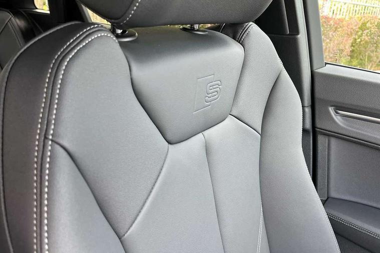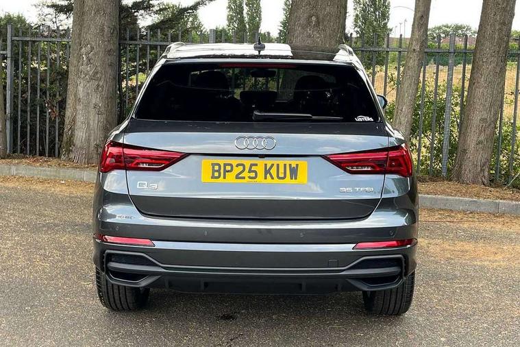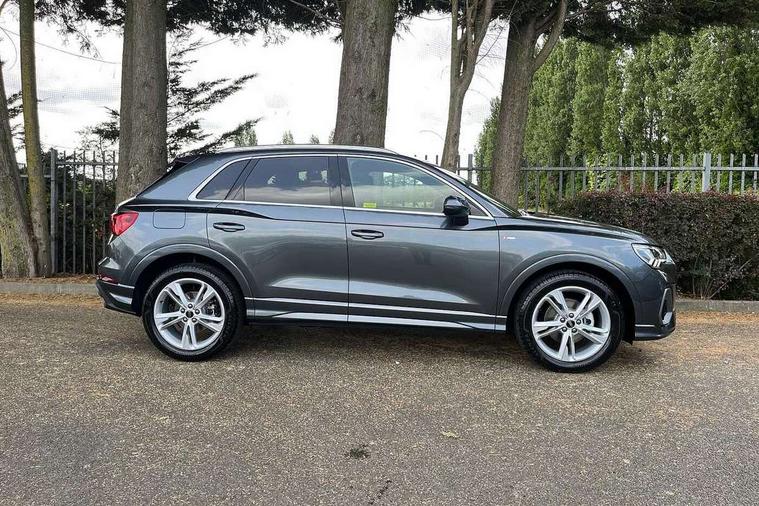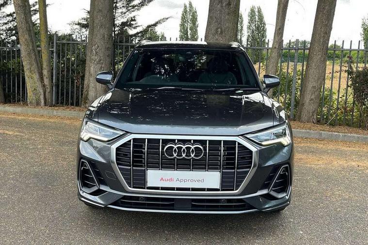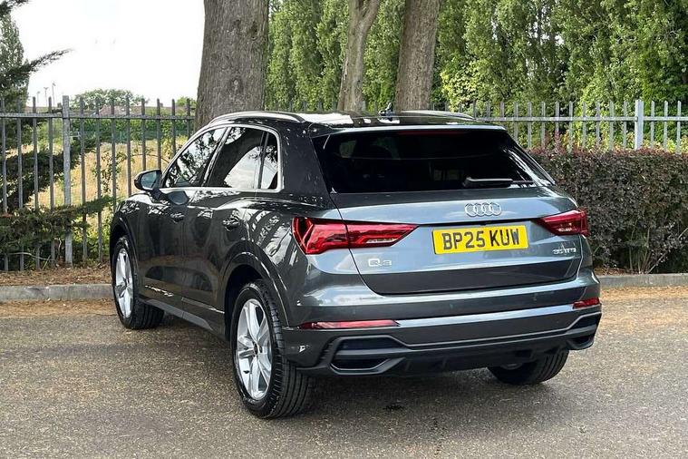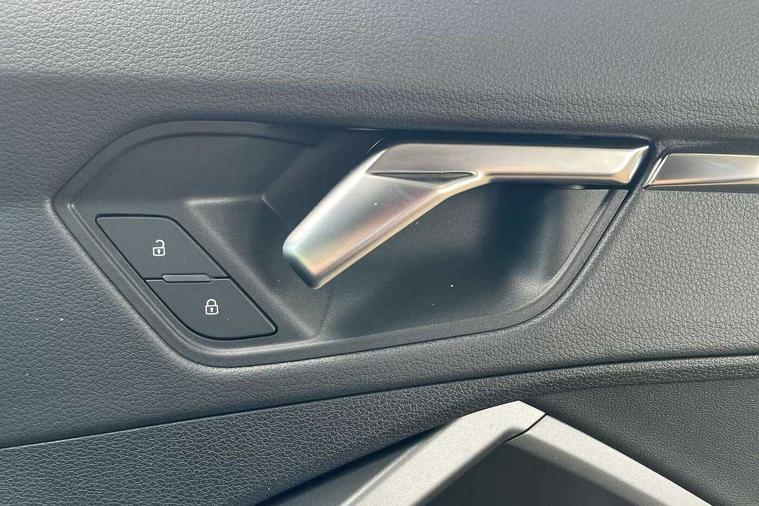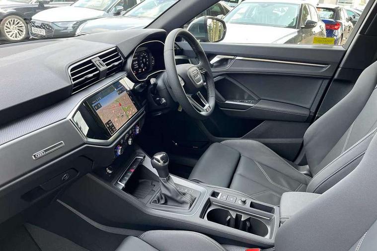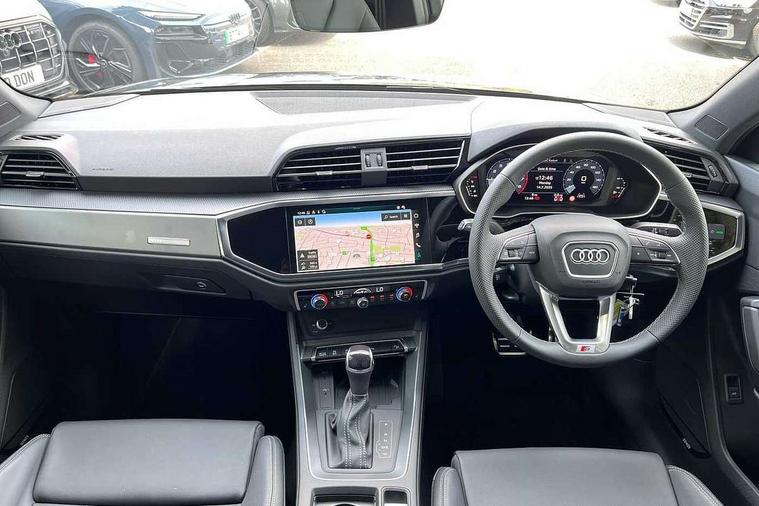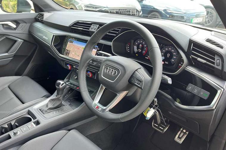 Amazon alexa Integration, Audi connect safety and service, Audi drive select, Audi lane departure warning, Audi smartphone interface includes wireless Apple carplay/Android Auto, Audi Virtual Cockpit - 10.25" display, Bluetooth interface, Camera based traffic sign recognition, Distraction and Fatigue warning, Legal emergency call, MMI Navigation Plus with high resolution 10.1 inch touchscreen colour display, Power operated tailgate, Progressive steering, Service interval indicator, Start stop system with recuperation, Voice control system with natural language interaction, Sports suspension, 2 USB-C ports with charge and data functions, 6 passive loudspeakers, DAB digital radio module, Acoustic windscreen, Aluminium roof rails, Aluminium window trim, Anthracite black radiator grille, Auto dimming door mirrors, Auto dimming frameless rear view mirror, Body colour front spoiler blade, Electrically folding, adjustable and heated door mirrors with integrated LED side indicators and kerb view function for passenger side, Front and rear electric windows, Front fog lights, Front side air inlets in matt platinum grey, Grille vertical bars in aluminium silver/Matt, High gloss black finish B and C pillars, LED Dynamic rear indicators, LED headlights with LED daytime running lights, LED rear lights, LED third brake light, Privacy glass dark tinted rear and rear-side windows (from B-pillar backwards), Rain and light sensors, Rear diffuser grille in grained matt black, Rear diffuser strip in matt anthracite black, Rear side wing doors, Rear wiper, S line badges on front wings, S Line front and rear bumpers and side skirts, Side skirt insert in matt Platinium grey, Variable front intermittent wipers, 12V socket in rear centre console, 3 seat bench in 2nd row, 3 spoke leather multifunction steering wheel features S badging and grips in perforated leather with contrast stitching, 40:20:40 folding with manual adjustment for 60:40 forwards/backwards position and backrest angle, Adjustable rear seat bench/backrest with centre armrest and cupholder, Black carpet mats, Black cloth headlining, Dual zone electronic climate control, Electric lumbar support, Front and rear black floor mats with contrast stitching in rock grey, Front and rear headrests, Front centre armrest, Height and reach adjustable steering wheel, Horizontal trim strip in matt platinum grey, Illuminated door sill trims with S logo, ISOFIX child seat mounting for front passenger with airbag deactivation and outer rear seat including top tether attachment point for outer rear seats, Luggage compartment sill protection in stainless steel, Manual front seats with height adjustment, Perforated leather gearknob, Single front passenger seat, Stainless steel pedals, Twin leather upholstery with front sport seats + S embossing, Non smoking pack - Q3, 3x3 point rear seatbelts, 6 airbags - Driver, front passenger, curtain and side windows, Audi pre-sense front with pedestrain and cyclist recognition, Electrically operated child locks on rear doors, Electromechanical parking brake, Electronic stabilisation control including ABS, ASR and EDL, Front seatbelt reminder, Hill descent control, Hill hold assist, Pre sense basic, Seatbelt monitoring, Tyre pressure warning, Warning triangle and first aid kit, Anti theft wheel bolts, Immobiliser, Remote central locking, Thatcham approved category 1 anti theft alarm, Aluminium look interior elements, Dark matt brushed aluminium inlay, Detail dashboard around MMI touch colour display in glass look, black with surround in aluminium look, Leatherette door armrest,