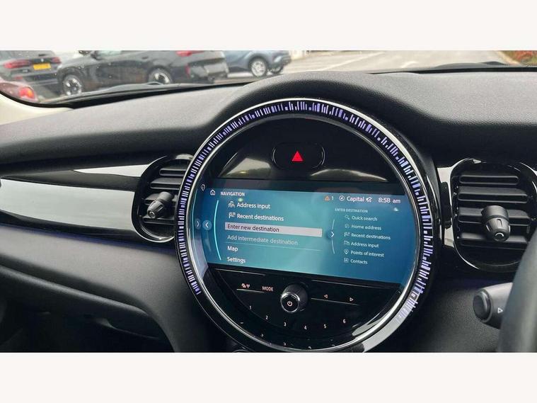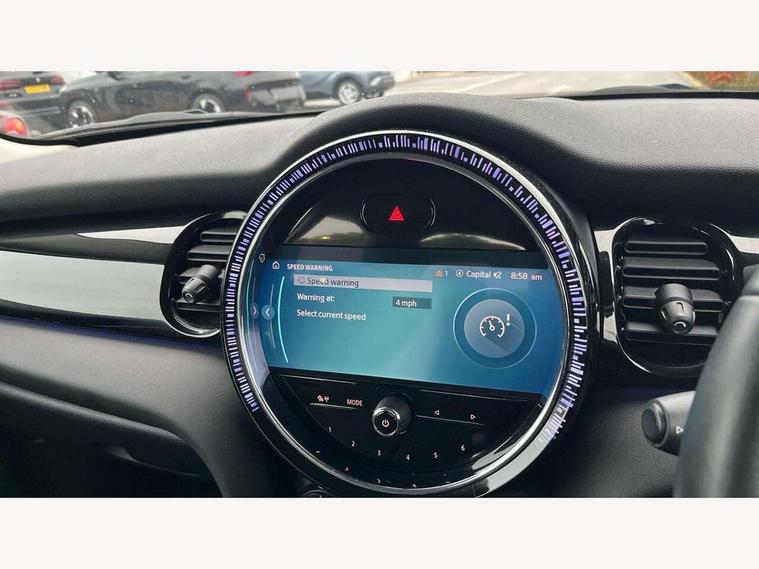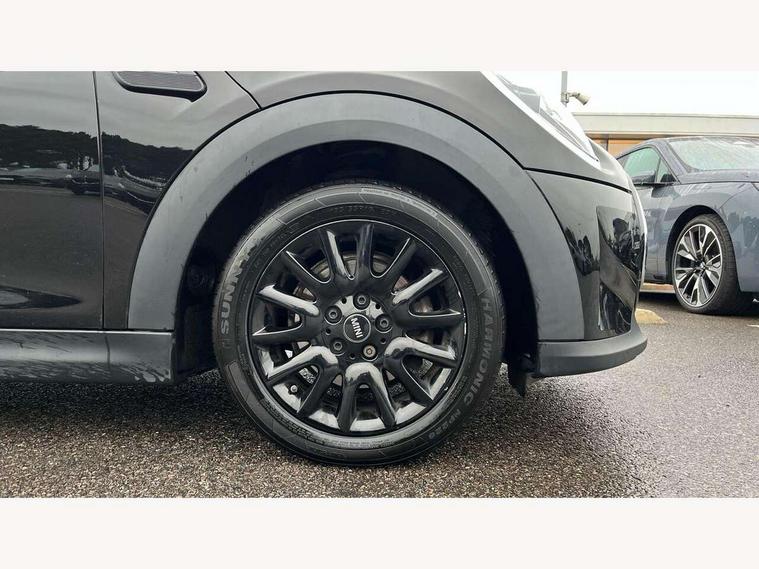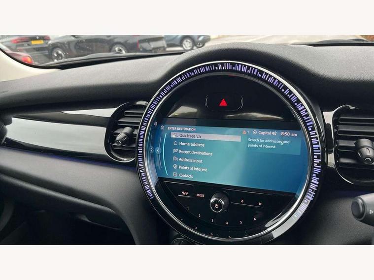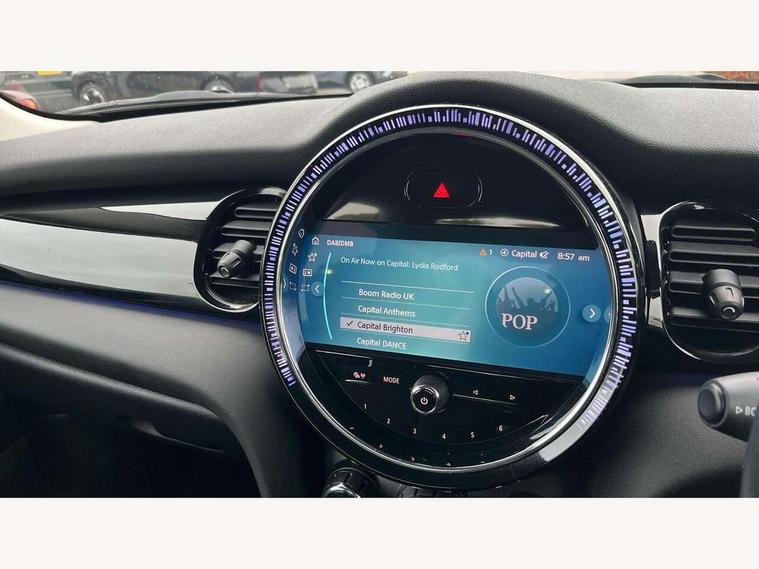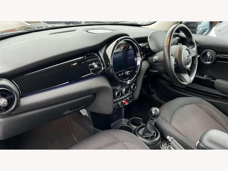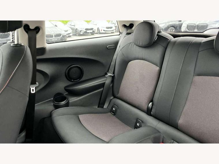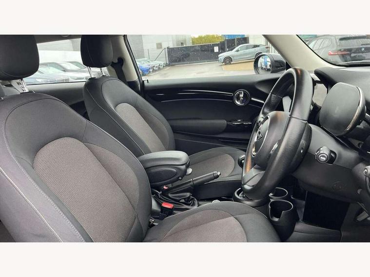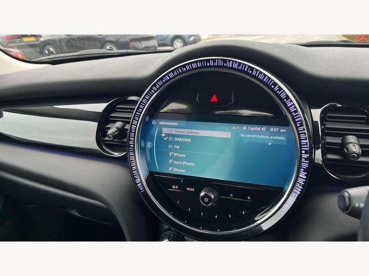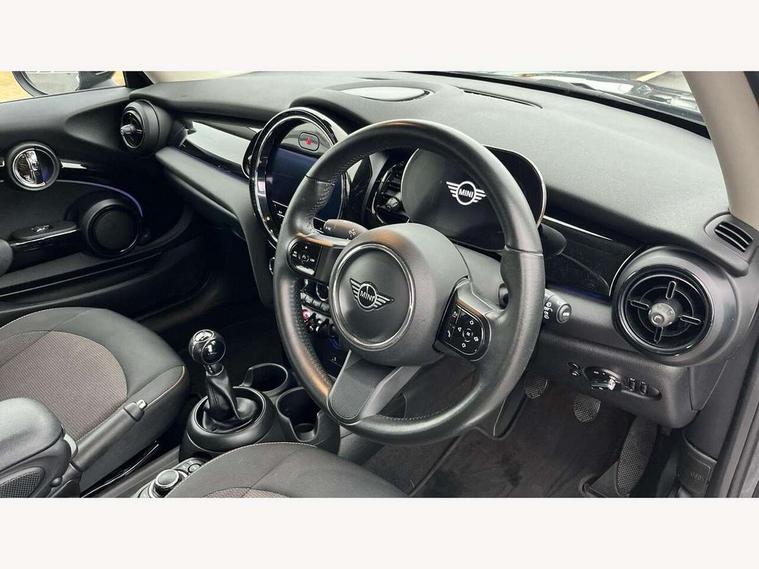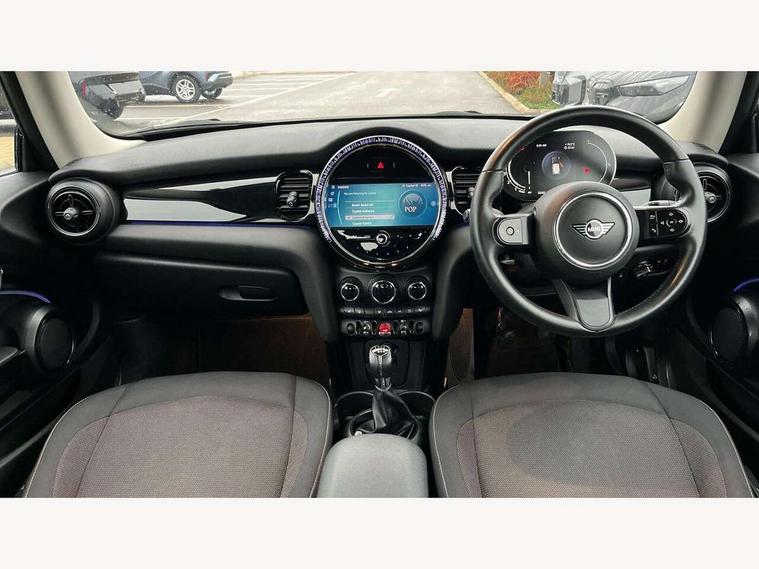 Automatic start/stop function with brake energy recuperation, Compatible mobile phone bluetooth with audio streaming, Cruise control with brake assist, Electro-mechanical speed dependant steering assistance, Flexible car sharing preparation, Instrument cluster, Mini E-call, MINI TeleServices, On board computer, Service interval indicator, 6 Speed manual transmission including gear change indicator display, Double Vanos system, Fully variable valve control, High precision injection, Performance Control, 4 speakers in front door trims and underneath front seats, 8.8" touchscreen with LED ring, FM tuner and DAB digital radio, Automatic headlight activation switch, Body colour fuel filler cap, Chrome border high gloss black slats radiator grille, Dynamic brake lights, Electric front windows, Exhaust tailpipe on left with chrome finisher, Heated rear window, Heated windscreen washer jets, LED headlight with closed ring and daytime driving lights, Metal door sill strips with MINI imprint, Model logo Cooper on right of tailgate, Rain sensor window wipers, Rear fog lights, Rear LED lights with union jack design, Rear window wiper, Side scuttle panel with integrated indicator, Sun/heat protection glass, White indicator lenses, 12V Accessory socket in centre console, 4 lashing eyes in luggage compartment, 60/40 split folding rear seat, Ambient lighting, Carbon black colour line - Knee roll and door armrest, Chrome interior highlights, Cupholders, Front and rear head restraints, Front and rear isofix with front passenger airbag deactivation, Glove compartment, Height and length steering column adjustment, Interior lighting with 12 different colours across the dashboard, underneath door bezel with illuminated laser-engraved design on central display, Leatherette gearshift lever and handbrake gaiters, LED reading lights, vanity mirror lights, front foot well light and spotlight on front seats, Manual air conditioning, Mechanical seat adjustment - forward/back & backrest for front seats and driver seat height adjust, Multifunction steering wheel, Passenger seat height adjuster, Satellite grey headlining including grab handles and clothes hooks, Sport leather steering wheel with speed limiter and audio/communication controls, Storage compartments in doors, Sunvisors with vanity mirrors, Velour floor mats, 3 point seatbelts on all four seats, 6 Airbags - front, side, head and seat belt tensioners, Anti-lock braking system (ABS), DSC - Dynamic Stability Control, Front and rear disc brakes, Single tone fanfare horn, Tyre pressure monitoring system, Alarm system with tilt sensor, monitoring doors, bonnet interior and tailgate, Electronic vehicle immobiliser, Start/stop toggle with keyless go, Piano black interior trim, Tool kit, Tyre repair kit,