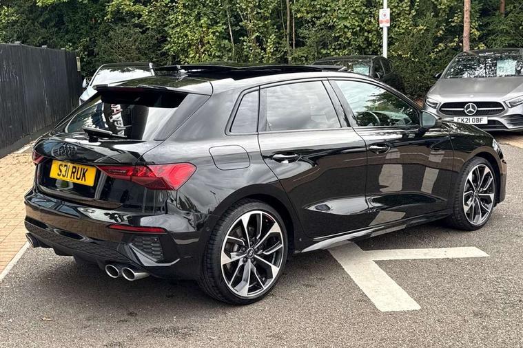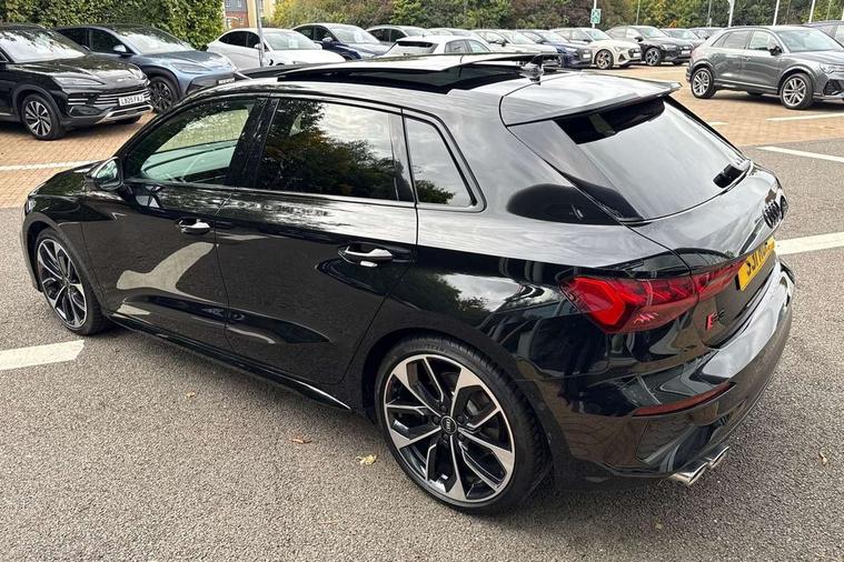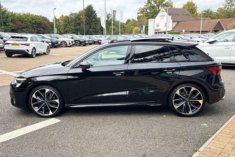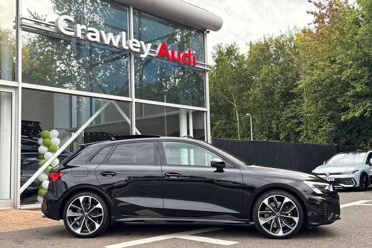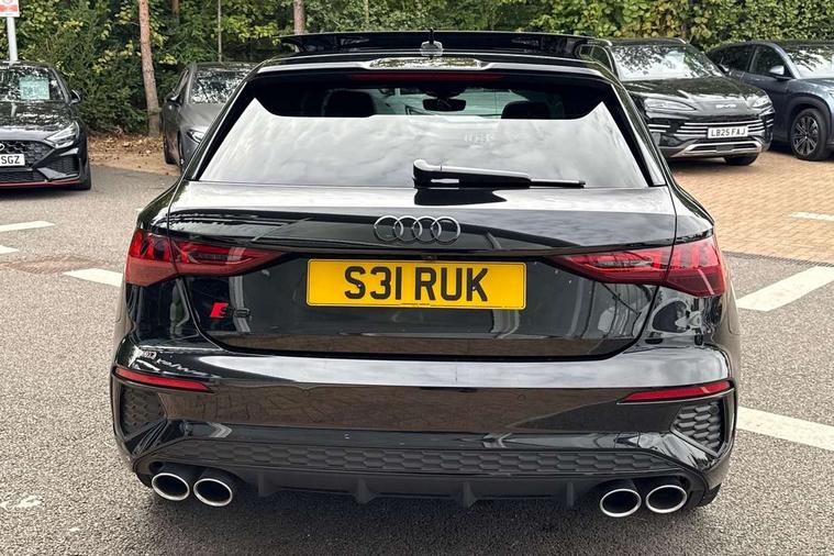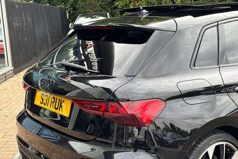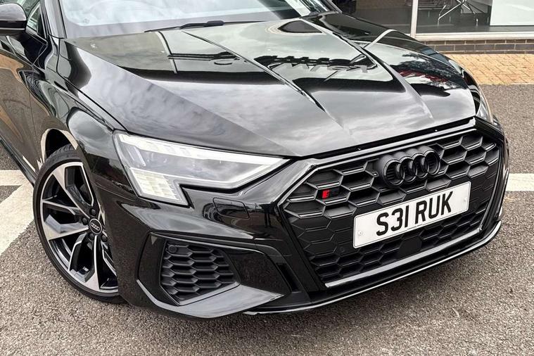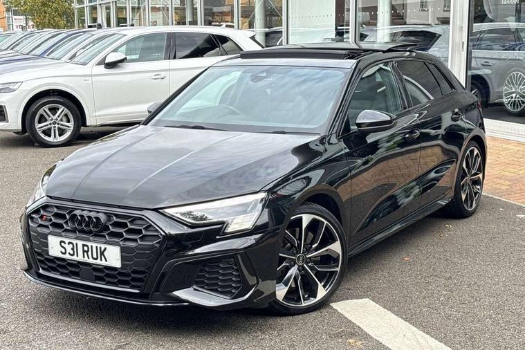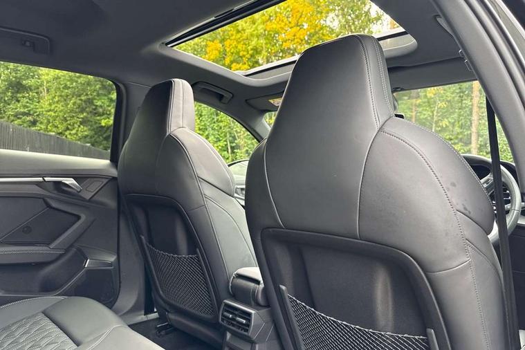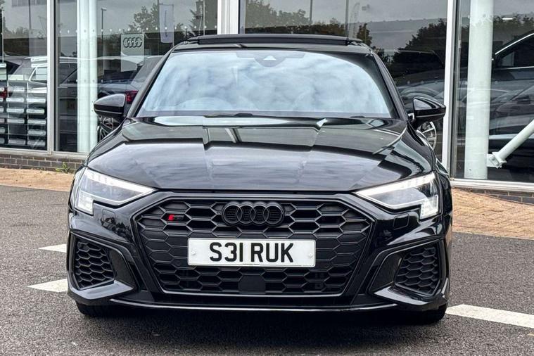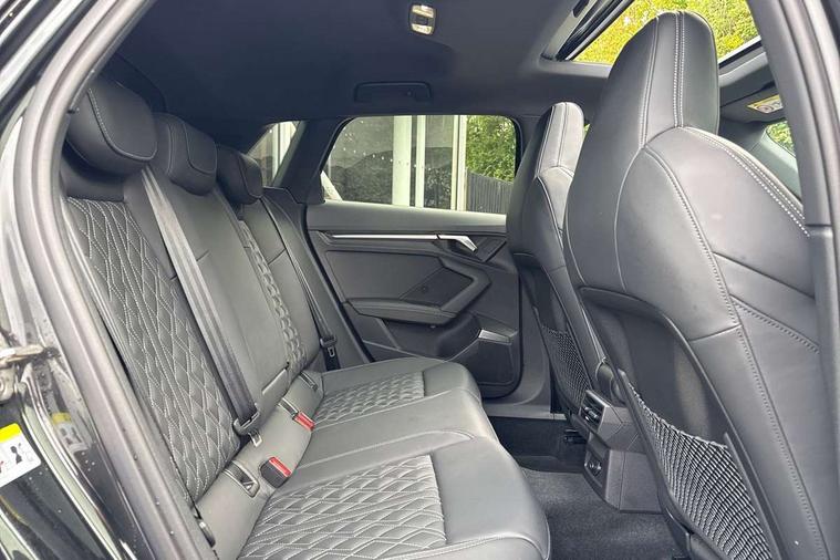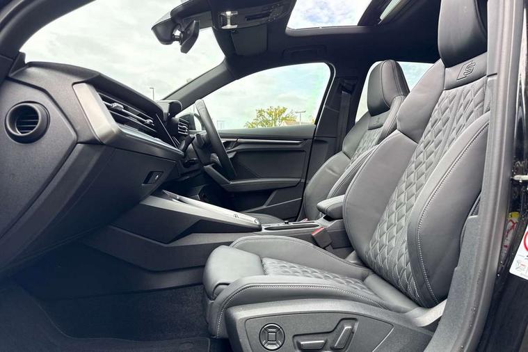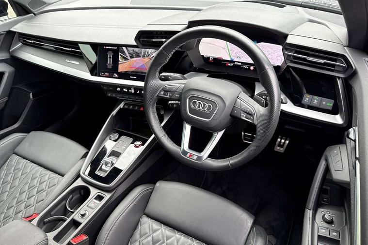 Adaptive cruise assist, Audi drive select (Auto, Comfort, Dynamic, Efficiency and Individual), Audi smartphone interface, Audi virtual cockpit plus - 12.3" full HD resolution dynamic digital instrument cluster, Automatic start/stop system with recuperation, Bluetooth interface, Collision avoidance assistant, e-Call (emergency call), Head up Display, Lane change assistant with exit warning system and rear cross traffic alert, Lane departure warning system, MMI Navigation Plus with high resolution 10.1" colour touch screen display, Power operated tailgate - Luggage compartment lid opens/closes electrically, Progressive steering, Service indicator, Trip computer, Voice control system with natural language interaction, Quattro permanent all wheel drive, S suspension with damper control, 2xUSB-C connection with data and charging functions, DAB Digital radio, 3rd brake light, Acoustic glass windscreen, Audi Beam uses LEDs to project Vorsprung onto the ground as you exit your S3, Auto dimming frameless rear view mirror, Carbon door mirror housings, Dual branch oval twin tailpipes in chrome plated finish, Electrically adj heated/folding + automatically dimming exterior mirrors with memory + automatic kerb side function for passenger side exterior mirror, Front electric windows, Headlight washers, Heat insulating glass windscreen, Illuminated door sills with aluminium inserts at the front with S logo, Integrated LED indicators in door mirrors, LED daytime running lights, Light and rain sensors, Privacy glass - dark tinted rear window, rear door and side windows, Rear electric windows, Rear side air outlets in grained matt black, Rear side wing doors, Rear wiper, 12V socket and storage compartment in front centre console, 3 seat bench in 2nd row, 3 spoke leather multifunction steering wheel with gear shift paddles, 4 way electrically adjustable lumbar support for driver and front passenger, 60/40 split folding rear seat bench, Black cloth headlining, Dual zone electronic climate control, Fine Nappa leather upholstery with front sports seats S embossed logo, Front and rear centre armrest in artificial leather, Front and rear headrests, Front/rear floor mats, Height and reach adjustable steering wheel, Interior lighting - glove compartment light and right hand side, Luggage compartment floor covering, Seat side bolsters, Single front passenger seat, Stainless steel pedals and front footrest in black, Aluminium interior elements pack - A3 Sportback, Black styling pack - A3 Sportback/S3, Body styling design pack - S3, Extended ambient lighting pack - A3 Sportback, Storage pack - A3 Sportback, Technology pack pro with 360 camera - A3 Sportback/Voursprung, 3x3 point rear seat belts, Driver and front passenger airbag with passenger airbag deactivation, Electronic Stabilisation Control (ESC) including ABS, ASR and EDL, First aid kit with warning triangle and 2 safety vests, Front side airbags with head airbags and interaction airbag, Pre-sense front with pedestrian and cyclist detection, Seatbelt monitoring, Tyre pressure loss indicator, Anti theft alarm, Anti-theft wheel bolts, Electronically operated child locks, Immobiliser, Remote control central locking, Carbon inlays, accent surfaces in the dashboard and centre console in platinum grey silk effect paint finish,