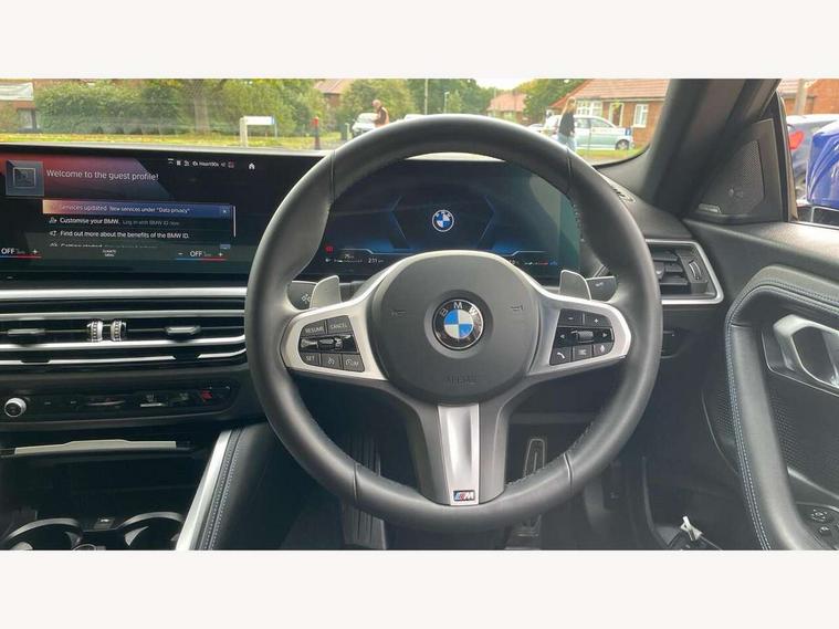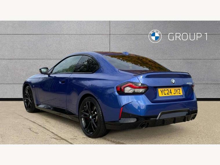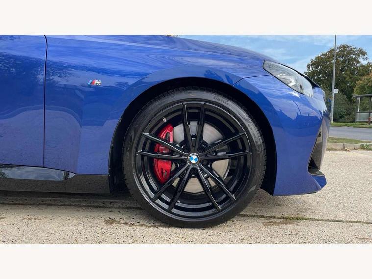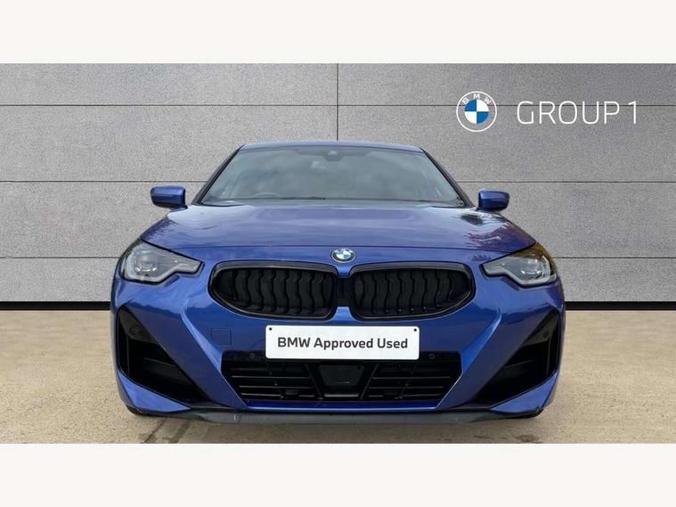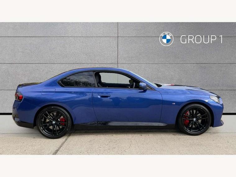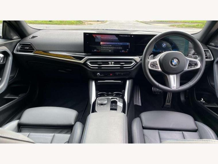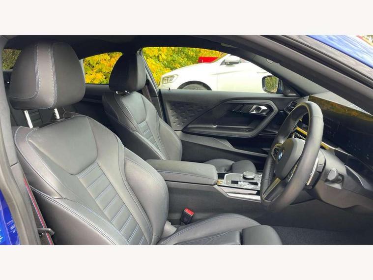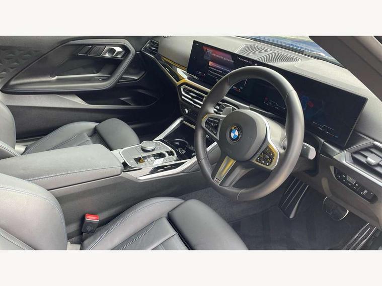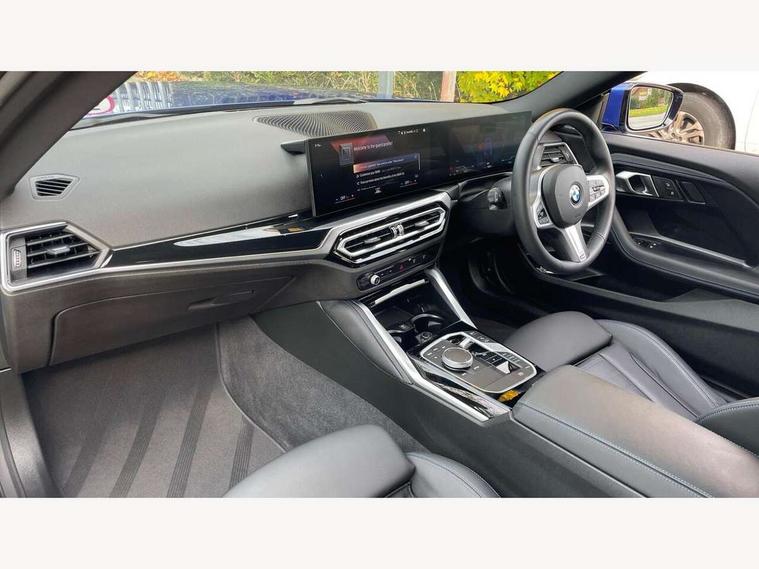 2 USB connections for charging and transferring data, 4G LTE connectivity with hard wired 4G network sim card, Attentiveness assist, Bluetooth with USB, BMW ConnectedDrive online services, BMW Intelligent Personal Assistant, BMW operating system 8 with variable, configurable widgets display information in real time, BMW Teleservices, Check Control warning system for monitoring of lights and door/luggage compartment open warning, Direct selection buttons, Drive off assistant, Eco pro mode, Electric power steering, Front and rear parking sensors, Front/rear Parking distance control, iDrive controller with turn and press function, Integrated owners handbook, Intelligent functions, Live cockpit plus with nav function 12.3" instrument cluster and 14.9" centre display, Oil sensor for level and grade, Optimum shift indicator, Personal Profile, Touch operation on control display, Variable sport steering, Widescreen multi-media display, WiFi interface for wireless connection of mobile terminal devices, Aluminium lightweight construction, Balancer shaft, BMW TwinPower Turbo four-cylinder petrol engine, Double VANOS, Drive performance control with ECO PRO comfort + sport mode, Electronic differential lock, High precision injection, M sport suspension, Petrol Particulate Filter, Sport automatic steptronic transmission with gearshift paddles, manual gearshift time display, launch control, coasting idle ECO PRO/COMFORT modes, Twin scroll turbocharger with Valvetronic, DAB tuner, Acoustic windscreen wipers for reduced driving noise, Adaptive LED Headlights, Automatic windscreen wipers and automatic headlight, Automatically dimming rear view mirror, Body colour door handles flush with door surface, Body colour door mirrors, Body colour front and rear bumpers, Daytime running lights, Electric windows - front and rear, with open/close fingertip control and trap release, Exhaust tailpipes x2 - 90mm in left and right, Fading support, Front and rear bumper system with replaceable deformation elements, Front door sill finishers in black plastic with BMW designation, Front windscreen wipers with integrated washer jets, Green tinted heat protection glazing, High beam assistant, High gloss black sill, bumper trim sides and diffuser insert, High gloss shadowline exterior trim in mirror triangle cover, mirror cover panel, mirror bezel and window border, High level third brake light, Indicators integrated int mirror housing, LED registration plate light, LED technology rear tail lights, brake lights and turn indicators, Lightweight engineering, Model designation on right side of tailgate, One piece kidney grille with hight gloss chrome surround, Rear boot, Rear fog lights, Reversing light in rear light cluster, Shark fin antenna, Single part LED rear lights with smoked glass components, Trailer stabilisation logic, Visible VIN plate, 12V power socket in front centre console with blanking plug, 2 cupholders in front centre console, 2 zone automatic air conditioning, Ambient lighting, Compartment in front of cupholder, Conditioned based service, Driver seat backrest width adjustment, Front and rear side armrests integrated into door trim, Front armrest, Front door pockets, Front head restraints, Front sport seats, Heated front seats, Illuminated glove compartment with separate small compartment, M headliner Anthracite, M sport leather steering wheel, Manually adjustment steering wheel column, Rear seat backrest with manual 40:20:40 split folding, Rear seat centre foldable armrest with integrated cup holder, Single front passenger seat, Storage compartment between rear seats, Storage tray and compartment with cover in centre console, Sun visors with vanity mirrors and insert tab, Through loading system with 40/20/40 split folding 2 rear seat in 2nd row, Two folding rear seat headrests, Velour floor mats, Additional storage compartment pack without USB - 2 Series Coupe, Connected pack professional - 2 Series Coupe, Interior and exterior mirror pack - 2 Series Coupe, M Sport exterior styling aerodynamics pack - 2 Series Coupe, 2 tone horn, Anti lock braking system (ABS) with cornering brake control, Automatic Stability Control (ASC), BMW emergency call, Brake drying, Child seat ISOFIX attachment for the two outer rear seats, Crash sensor activating of airbags, Unlocking doors, hazard warning lights, fuel cut off, interior lighting+activation of safety battery terminal clamp, Deactivation of fuel pump in the event of a crash, Driver and front passenger airbags, Driver and front passenger side airbags, integrated in the door side seat backrest bolsters for all seat variants, Dynamic brake control, Dynamic stability control + (DSC+), Dynamic Traction Control - DTC, Electrically operated hand brake including automatic hold function and automatic release when driving off, Front and rear disc brakes, Head airbags for all 4 outer seats, Manual deactivation of front passenger airbag, Seat belt security check for driver and front passenger, Seatbelt warning, Side impact protection, Three point seat belts on 4 seats including front belt stopper, pyrotechnic belt tensioners and belt force limiters, Tyre pressure sensor, Warning triangle and first aid kit, Alarm system (Thatcham 1) with remote control and electronic engine immobiliser, Central locking switch for all doors, fuel filler cap and luggage compartment, Deadlocking function system to all doors, Drive away locking system on all doors and luggage compartment, Locking wheel bolts, Start/Stop button (illuminated) in centre console with keyless engine start and Auto Start-Stop deactivation button, Two remote control key with integrated key - one button for open and close doors/fuel flap/tailgate and separate button for unlock luggage compartment, BMW mobility tyre sealing system, Electrically powered 12V compressor, Reduced rolling resistance tyres,