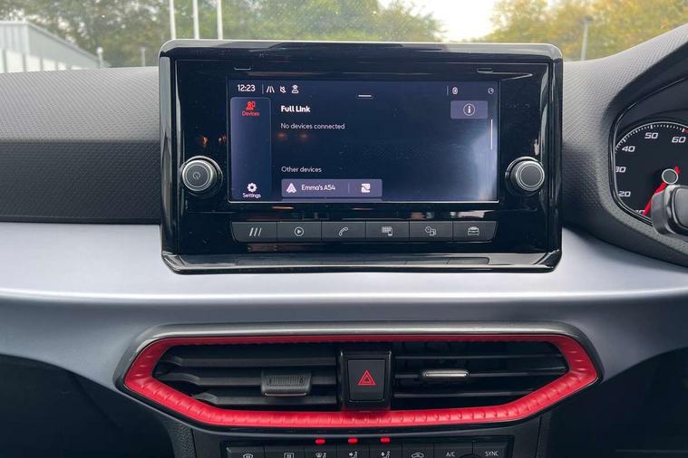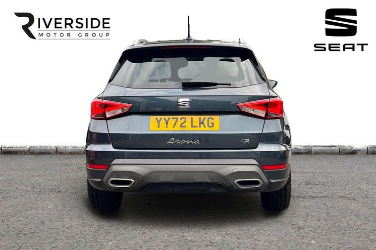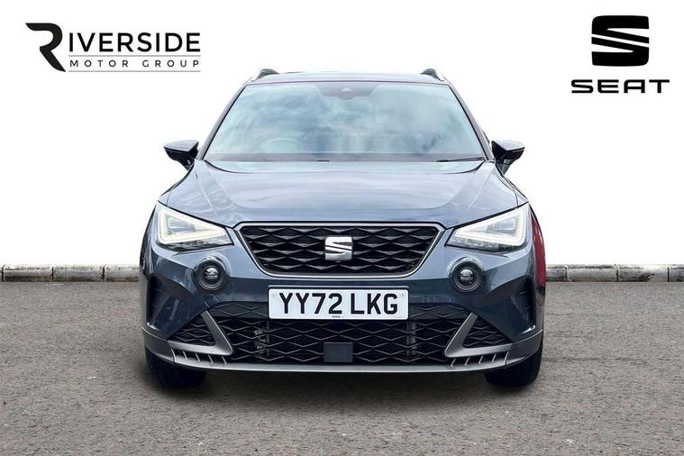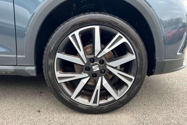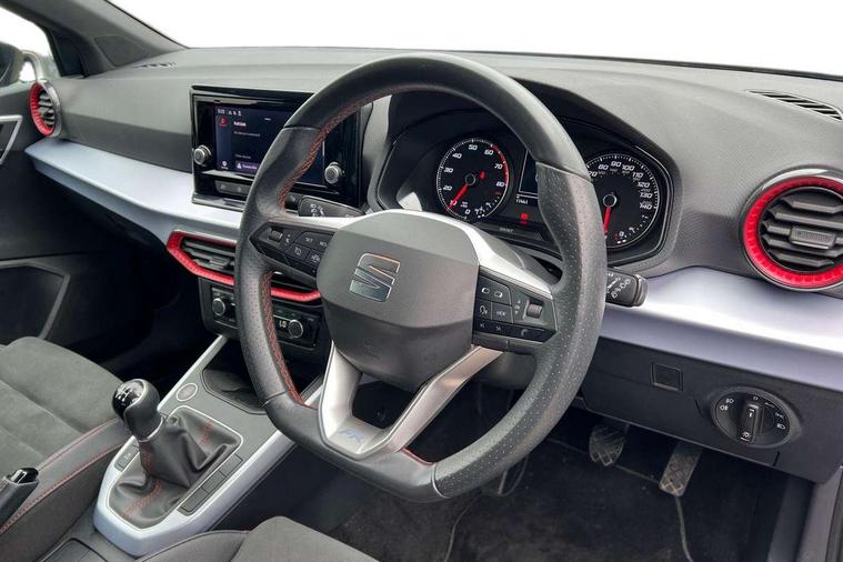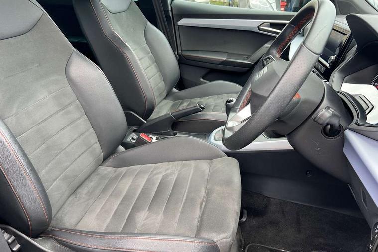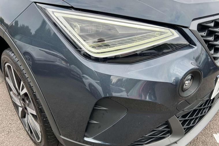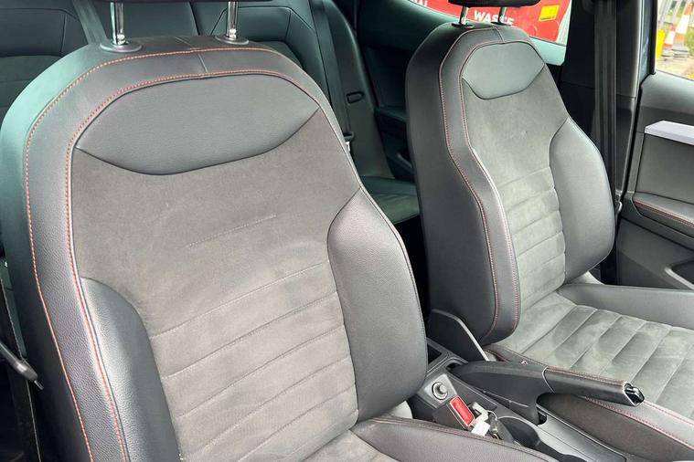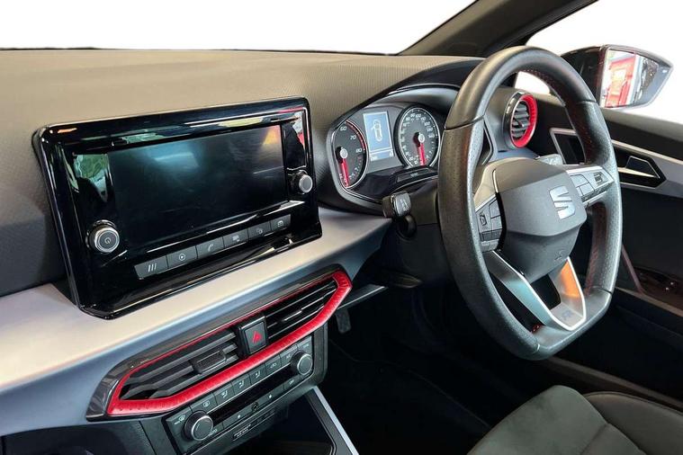 'Lights On' Reminder warning buzzer, Analogue cockpit with physical dials, Digital clock, E-call, Electric speed sensitive power steering, Full Link Smartphone Integration with Mirror Link, Apple Car Play, Google Android Auto with USB Type C cable for Apple and Android compatibility, Lane keeping system, Low fuel warning light, Outside temperature display, Rear parking sensor, RPM counter, Seat connect with safety, service and remote, SEAT Drive profile - Four different models normal-sport-eco-individual, steering response, throttle response, Trip computer, Wireless phone charger, Bluetooth interface for hands free and audio streaming, DAB digital radio and AM/FM radio, Media system with 8.25" colour touchscreen with USB port (type c), Steering wheel mounted audio controls, Anti theft roof antenna, Automatic activation of hazard warning lights, Body coloured bumpers, Body coloured door handle inserts, Chrome roof rails and window surrounds, Dark tinted rear windows, Dimming rear view mirror, Electric front/rear windows, Electrically adjustable and heated door mirrors, Front fog lights with cornering function and rear fog light, FULL LED automatic headlights with dynamic headlight range control, coming and leaving home, LED daytime running lights, LED rear tail lights and licence plate lights, Protective side mouldings, Rear side wing doors, Rear spoiler, Rear window wash/wipe, Roof colour door mirrors, Third brake light, Twin exhaust pipe styling hidden exhaust pipe, Visible VIN plate, Windshield wiper with intermittent control and potentiometer, 2 cupholders, 3 seat bench in 2nd row, 60/40 split folding rear seat, Aircare filter, Black interior roof, Double boot floor, Driver sunvisor with covered mirror + card holder, Dual zone climate control, Front comfort seats, Front courtesy light with 2x front and 2x rear reading lights, Gear shift indicator, Height adjustable front seats, Height/reach adjustable steering column, Illuminated boot, Instrument lighting with brightness control, Interior ambient lighting, Interior light in footwell, central console and door panel, ISOFIX points in outer rear seats with top tether anchorage points, Microsuede cloth upholstery, Passenger sunvisor with vanity mirror, Perforated flat bottomed leather steering wheel/gear knob/handbrake with red stitching and FR logo, Single front passenger seat, Two front and three rear height adjustable headrests, Interior chrome pack - Arona, 3 point seatbelts on all rear seats, ABS, Active front headrests, Child locks on rear doors, Driver and front passenger airbags with front passenger airbag de activation, front side and curtain airbags, Electronic stability control, Emergency Brake Assist (EBA) and front assist, Front and rear seatbelt reminder, Hill hold control, Multi-Collision braking, Tiredness recognition system, Traction control, Tyre pressure monitoring system, Alarm with back-up horn, Electronic engine immobiliser, KESSY Keyless entry and go, Locking wheel bolts, Remote central locking + deadlocks, Tow away protection, Titan black dashboard,