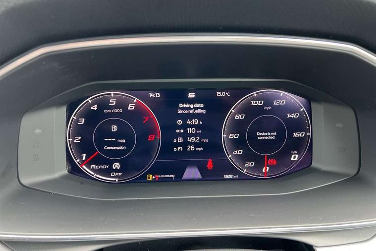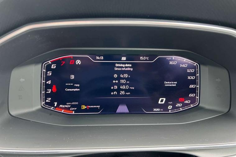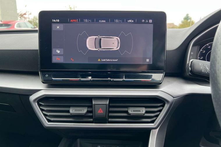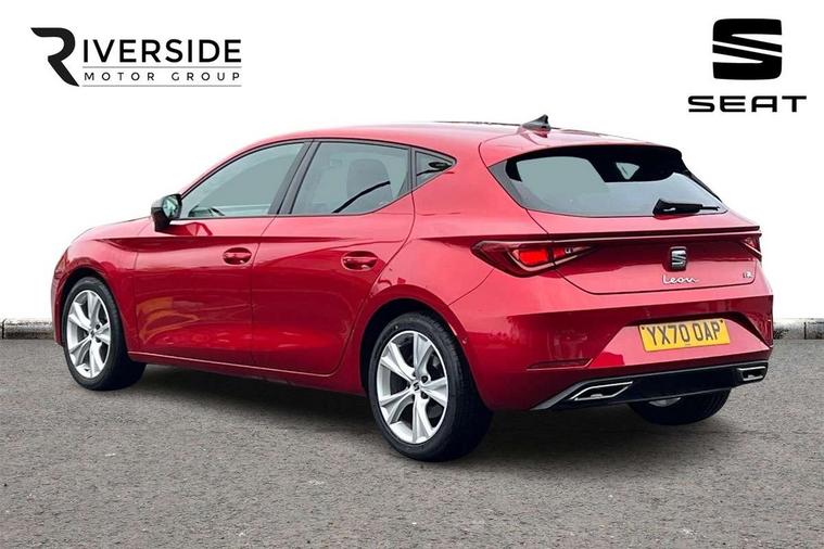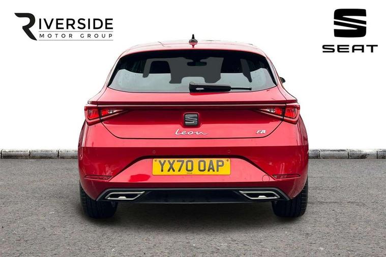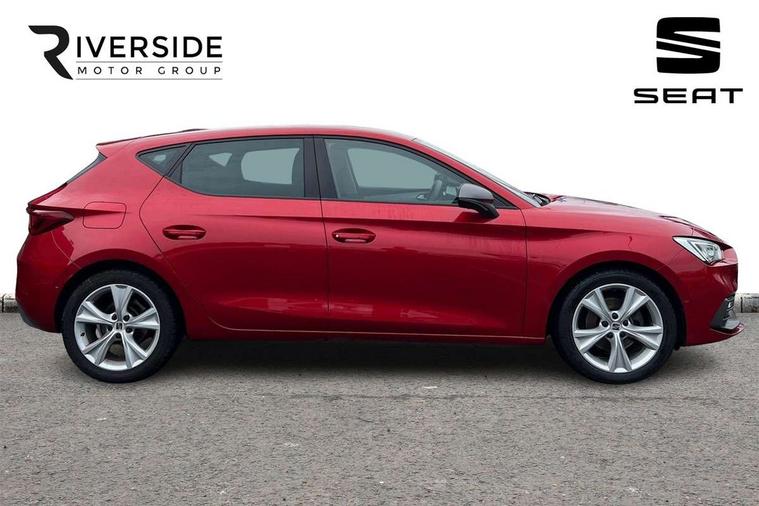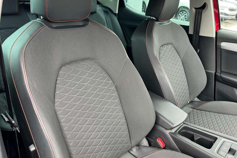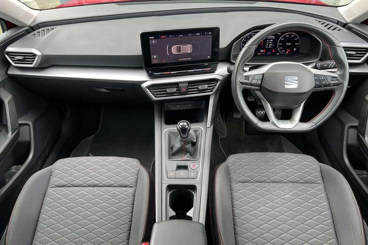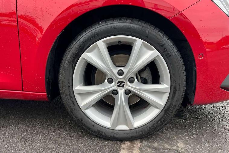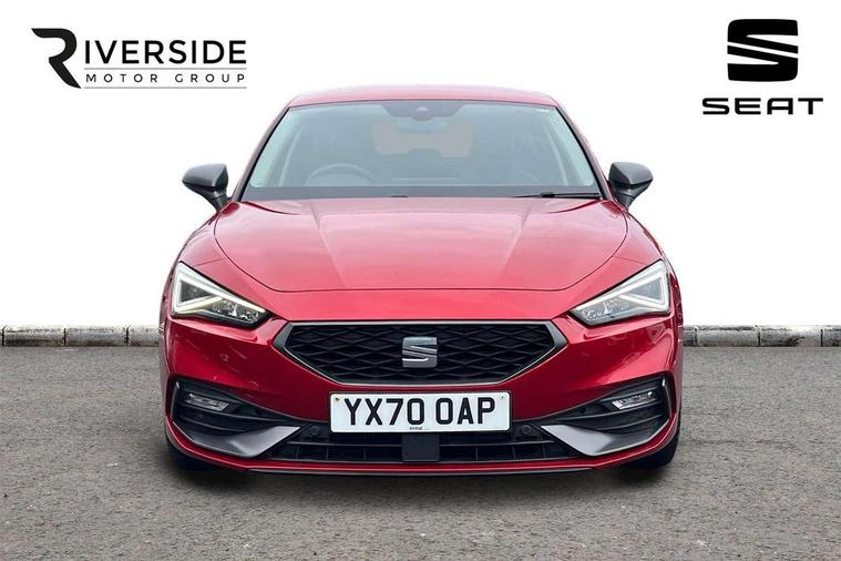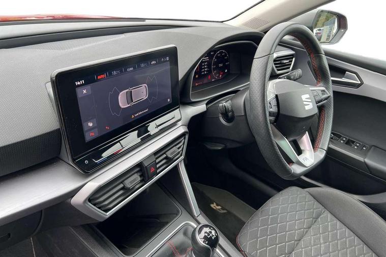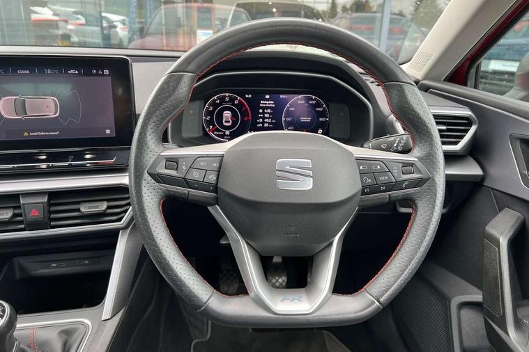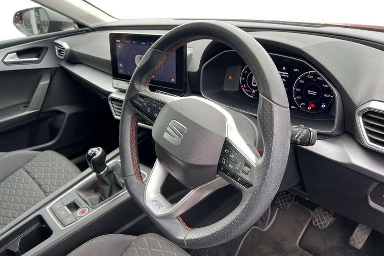 Chrome interior detailing, Media system plus with navigation - Leon, 17" Dynamic Bi-spoke alloy wheels with 91W tyres, Anti theft alarm system with interior monitoring in cab, backup horn and towing protection, KESSY Go (Keyless start), Lockable tailgate, Locking wheel bolts, Wireless phone charging, Auxiliary input socket, 3 point seatbelts on all rear seats, ABS, Brake control system - ESC and brake booster, Child proof door locks, Driver and front passenger airbags with front passenger airbag de-activation, front side and curtain airbags, Electronic parking brake, Extended safety system - seat belt tensioner, window closure and hazard lights, Hill hold control, Rear disc brakes, Seat belt reminder for front and rear seats, Tiredness recognition system, driver alert system, Tyre pressure monitoring system, Auto dimming rear view mirror, Body colour door handles, Body coloured bumpers, Cosmo grey exterior mirrors with integrated LED indicators, Dark tinted rear windows, Electric front/rear windows, Electrically adjustable, heated and folding door mirrors, FR sports bumper, Illuminated front door sill, LED front fog lamps with cornering function, LED headlights and tail lights with dynamic turn signals, welcome light silhouette from exterior mirrors and dynamic headlight range control, LED rear fog lamp, Rain sensing wipers, Rear wash/wipe, Separate daytime running light with automatic headlight control and coming home feature, 12v power point in centre console, 60/40 split rear bench seat with armrest, Ambient lighting in door trim, Cloth upholstery, Driver/passenger manual seat height adjustment, Dust/pollen filter, Flat bottomed perforated leather steering wheel with red stitching and FR logo and leather gear stick, Folding boot cover, Front and rear height adjustable headrests, Front and rear reading lights X 4, Front centre armrest, Front seatback storage pockets, Height/reach adjust steering wheel, Interior lighting with LED lighting in sunvisor, glovebox and rear headlining, ISOFIX points in outer rear seats with top tether anchorage points, Luggage tie-down hooks, Lumbar adjustment for front seats, Sunvisors with covered illuminated mirror, Three zone climate control, Tool kit, Digital cockpit, Front assist with forward collision warning braking reaction to vehicles, pedestrians and cyclists, Full link smartphone integration with Mirror Link, wireless Apple CarPlay and wired Google Android Auto, Lane keeping system, Park assist (inc front/rear parking sensors), Power assisted speed sensitive electro-mechanical steering, RPM, trip computer, outside temp gauge, instrument light brightness, low fuel warning light, lights on reminder, gearshift indicator, SEAT drive profile with 4 modes (Eco/Normal/Sport/Individual), throttle response, Service interval indicator, Start/stop system with regenerative braking, Sports suspension, XDS electronic differential lock and dynamic traction support,