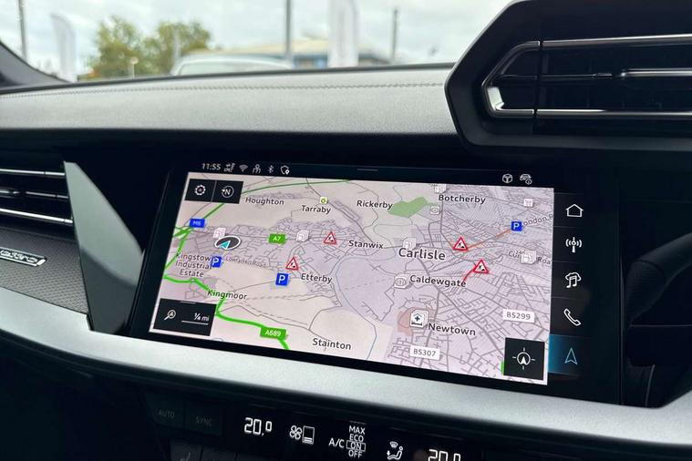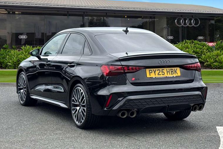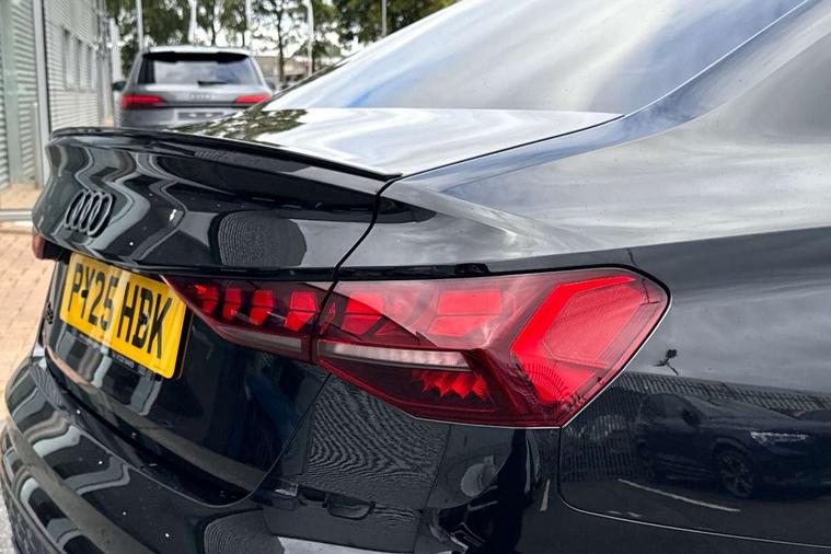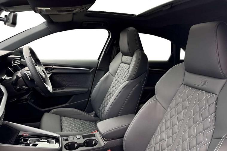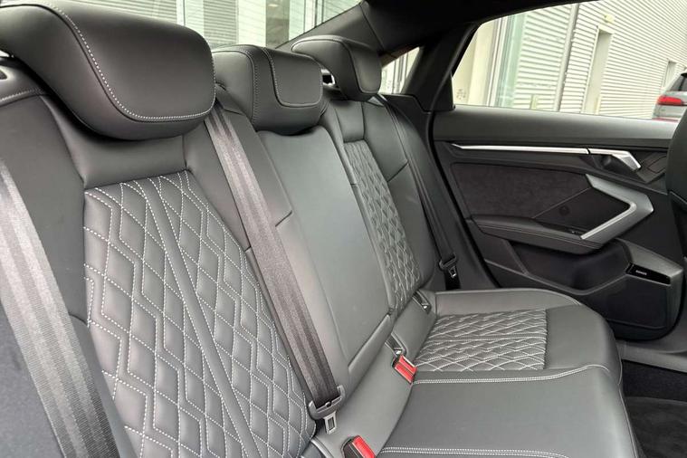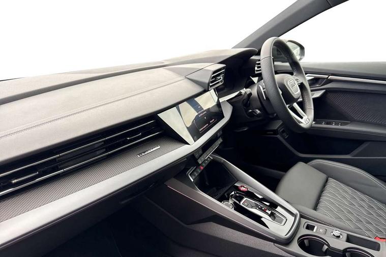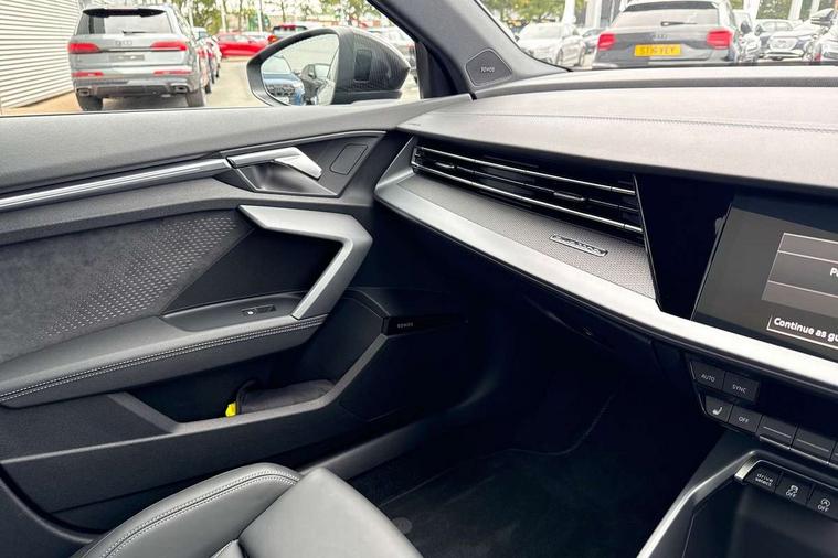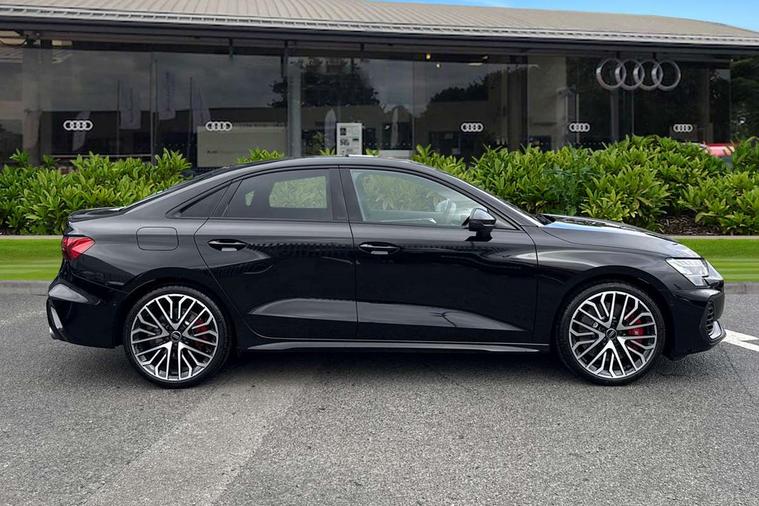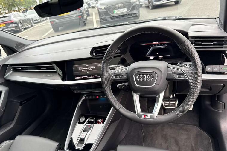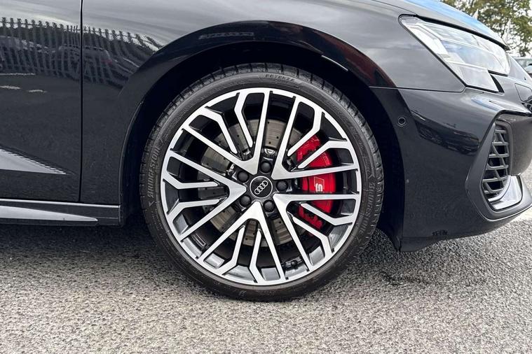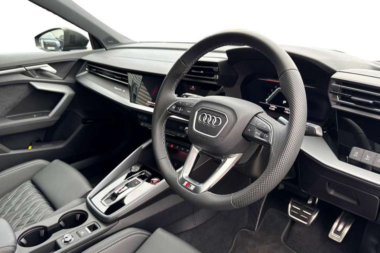 Adjustable speed limiter, Audi drive select, Audi smartphone interface with app store includes wireless Apple carplay, Android auto and Amazon alexa integration, Audi virtual cockpit plus - 12.3" full HD resolution dynamic digital instrument cluster, Automatic start/stop system with recuperation, Bluetooth interface, Camera based traffic sign recognition, Collision avoidance assistant, Distraction and Fatigue warning, e-Call (emergency call), Lane departure warning system, MMI Navigation Plus with high resolution 10.1" colour touch screen display, Park Assist with parking system Plus, Progressive steering, Service indicator, Trip computer, Voice control system with natural language interaction, quattro permanent all-wheel drive with torque splitter, S suspension with damper control, Audi Phonebox light with wireless charging, DAB Digital radio, USB ports with charging function in the rear, Anthracite grey Audi rings (front and rear), Audi Beam uses LEDs to project Vorsprung onto the ground as you exit your S3, Auto dimming frameless rear view mirror, Black accents front and rear bumpers including air inlets, Black accents in front grille and frame, Black accents in window trims, Carbon door mirror housings, Dipped beam, main beam, position light and turning light, Electrically adjustable/heated/folding/auto dimming door mirrors with integrated LED indications + kerb view function for passenger side, Exterior model badging, Front electric windows, Heat insulating glass windscreen, Illuminated door sills with aluminium inserts at the front with S logo, LED 3rd brake light, LED daytime running x3, Light and rain sensors, Privacy glass - dark tinted rear window, rear door and side windows, Rear boot, Rear diffuser and grill in grained matt black with inlay in dark liquid chrome, Rear electric windows, Rear side wing doors, S grille, S3 front bumper with S specific air intake grilles, 12V socket and storage compartment in front centre console, 3 seat bench in 2nd row, 3 spoke leather multifunction steering wheel with gear shift paddles, 3-zone deluxe automatic air conditioning, 4 way electrically adjustable lumbar support for driver and front passenger, 40/20/40 split folding rear seat bench, Black cloth headlining, Black front and rear floor mats, Fine Nappa leather upholstery with front sports seats S embossed logo, Front and rear centre armrest in artificial leather with contrasting stitching on armrests and instrument panel, Front and rear headrests, Heated front seats, Height and reach adjustable steering wheel, Manual boot compartment lid, Rear centre armrest with cupholder, S badging on the steering wheel, Seat side bolsters, Single front passenger seat, Stainless steel pedals and front footrest in black, Aluminium interior elements pack - A3, Extended ambient lighting package Pro with Multi-coloured contour lighting of instrument panel - S3, Storage package - A3 Saloon, Technology package pro - A3 S Tronic, 3x3 point rear seat belts, Driver and front passenger airbag with passenger airbag deactivation, Electronic Stabilisation Control (ESC) including ABS, ASR and EDL, First aid kit with warning triangle and 2 safety vests, Front side airbags with head airbags and interaction airbag, Hill hold assist, Pre-sense front with pedestrian and cyclist detection, Seatbelt monitoring, Tyre pressure loss indicator, Anti theft alarm, Anti-theft wheel bolts, Electronically operated child locks, Immobiliser, Black dashboard, Inlays in carbon atlas structure, Tyre repair kit,