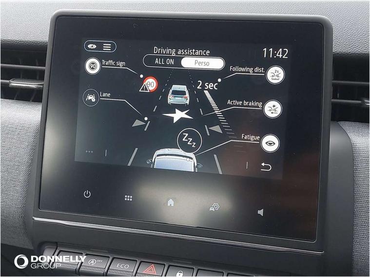 7" digital driver display, Apple car play/Android Auto, Cruise control + speed limiter, Driver attention warning, Easy link 7" touchscreen with built in navigation + Wifi smartphone integration plus, Eco mode driving function, Emergency call system, Lane departure warning system, Lane keep assist, Over speed prevention, PAS, Rear park assist, Rear parking sensors, Saftey shield [button for personalisation configuration of key ADAS features], Start/stop system, Traffic sign recognition, 2 USB ports, Arkamys speakers - x6 inc. 2 boomer, 2 tweeter and 2 bicone, Bluetooth, 1x jack, 1x aux socket, DAB/FM Radio, Automatic headlights, Automatic windscreen wipers, Black auto folding wing mirrors with defrosting and temperature gauge and LED indicator, Body colour bumpers, Body colour door handles, Electric rear windows, Electrically adjustable door mirrors, Exhaust pipe, Exterior rear hidden door handles, Front fog lights, Front LED roof light x 2, Full LED front and rear headlamps integrating daytime running lights at the front and rear, Heated rear windscreen, LED rear signature lighting, LED third brake light, Manually adjustable rear view mirror, One touch electric front windows, Rear brake light, Rear side wing doors, Rear wiper, 3 rear height adjustable headrests, 3 seat bench in 2nd row, 60/40 split and fixed base rear seat bench, Automatic air conditioning, Black armrests in door panel, Fabric upholstery, Height adjustable front headrests, Isofix system on outer rear seats, Power supply jack, Single front passenger seat, Standard driver and passenger seat, Sun visor without light, Synthetic leather steering wheel, 3 point seatbelts on all rear seats, ABS, Active emergency braking system - Urban and pedestrian/cyclist, Automatic emergency braking system with emergency brake assist, Child locks on rear doors, Curtain airbags, Distance warning alert, Driver and passenger airbags, Electronic brake force distribution, ESC (Electronic Stability Control), Front passenger airbag deactivation, Front side airbags, Height adjustable passenger seatbelt, Hill start assist, Manual parking brake, Seatbelt reminder, Tyre pressure monitor, 2x Black keys, Hands free key card with push button, start and stop function, RAID (Renault Anti-Intruder Device) automatic door locking, Superlocking, Grey interior roof trim, 16" Boa vista diamond cut alloy wheels, Tyre repair kit,