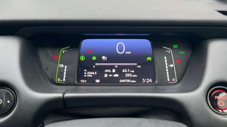 Adaptive cruise control, Adjustable speed limiter, Agile handling assist, Bluetooth hands free telephone connection, Econ mode, Electric power steering wheel with variable gear ratio steering, Emergency stop signalling system, Forward collision warning, Front and rear parking sensors, Honda CONNECT with 9" touchscreen, AM/FM/DAB/Apple Carplay and android auto, Idle stop, Intelligent speed limiter, Lane departure warning system, Lane keep assist system, Low speed following, Multi-information display, Road departure mitigation, Traffic sign recognition, Vehicle stability assist, 'Shark fin' mobile antenna, 2x USB Front socket (1 data & 1 charge), 4 speakers, Remote audio controls on steering wheel, Aspheric door mirrors, Auto wipers, Automatic headlights with on/off timer, Coming/leaving home function, Body colour door handles, Body colour door mirrors, Body coloured bumpers, eHEV emblem, Electric adjustable door mirrors, Electric front windows, Electrically folding door mirrors, Heated door mirrors, High beam assist, LED daytime running lights, LED Headlights, LED rear lights, Single exhaust tailpipe, 60/40 split rear bench seat, Cargo net hooks, Climate control air conditioning, Driver and front passenger seat armrests, Driver and passenger front seat pockets, Driver's seat height adjustment, Fabric/leather upholstery, Front accessory power socket, Front head restraints, Front map lights, Front/rear courtesy lights, Isofix child seat restraint mechanism, Isofix points, Magic seat flexibility system, Plating interior door handles, Rear head restraints, Rear parcel shelf, Sunvisors with vanity mirrors, Tilt/telescopic adjustable steering wheel, Tonneau cover, Trunk light, 3x3 point rear seatbelts, Anti-lock braking system (ABS), Brake assist function, Brake hold function, Collision mitigation braking system, Deflation warning system, Driver knee airbag, Driver SRS airbag (single stage inflation), Driver/Front Passenger airbags, Electric parking brake, Front and rear side curtain airbag, Front side airbags, Hill start assist, Passenger SRS airbag cut-off device, Rear side airbags, Whiplash lessening front headrests, Front seat belt with emergency locking retractor, Honda super locks, Immobiliser, Mirrors key fob operation, Remote central locking with 2 remote folding keys, Security alarm, Soft pad leather interior panels, 15" Multi apperance alloy wheels in mat berlina black, Tyre repair kit,