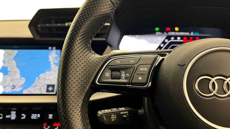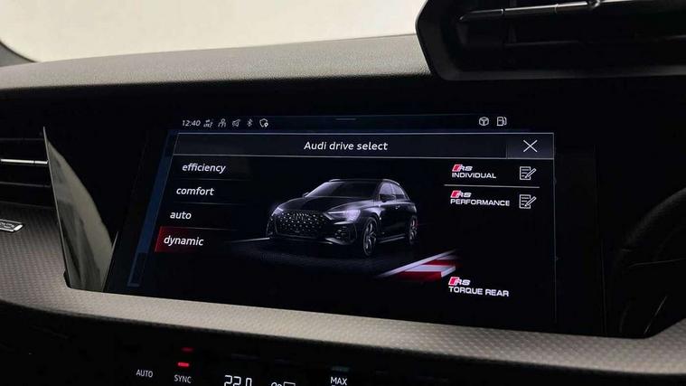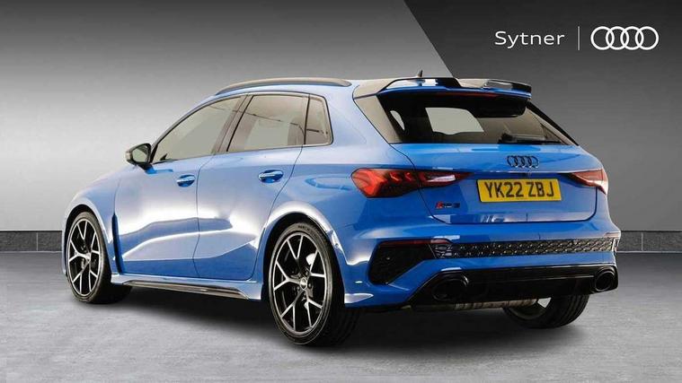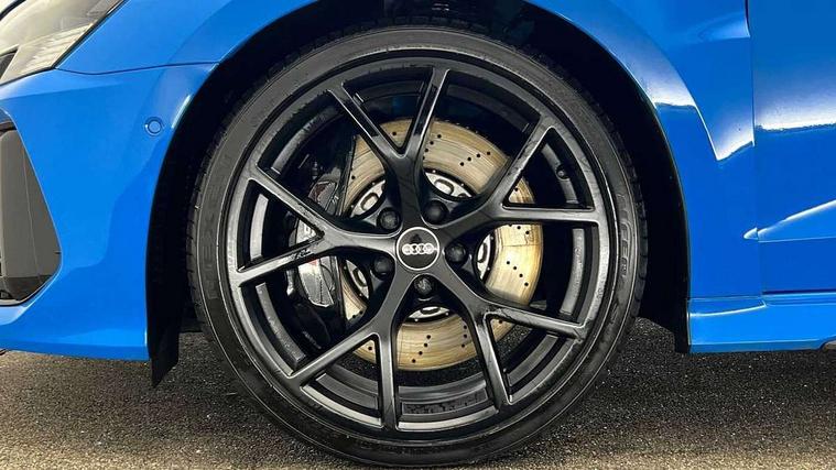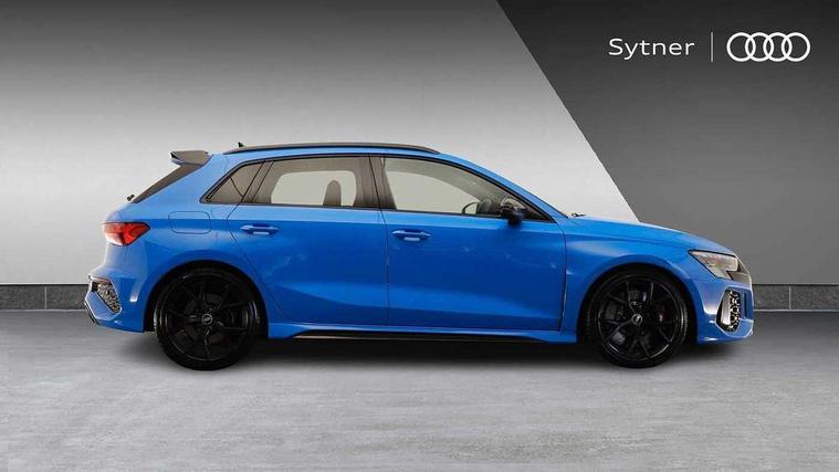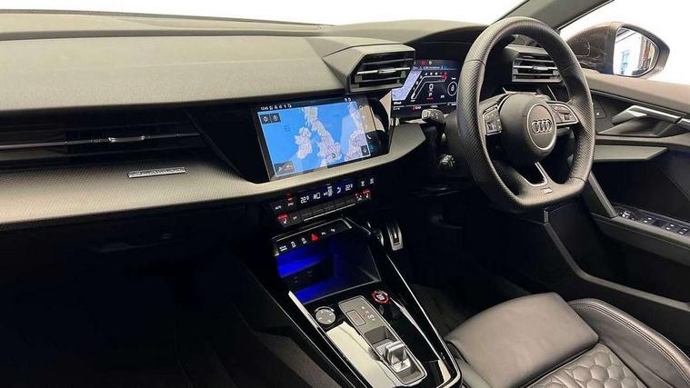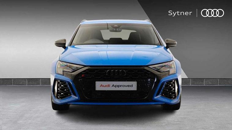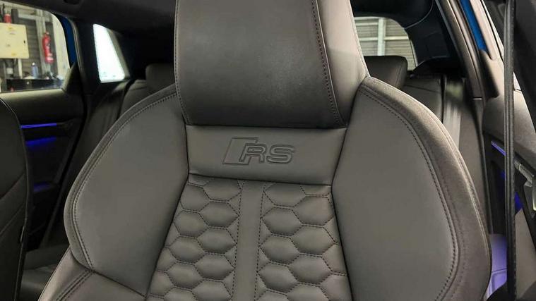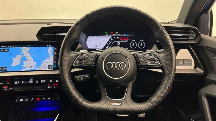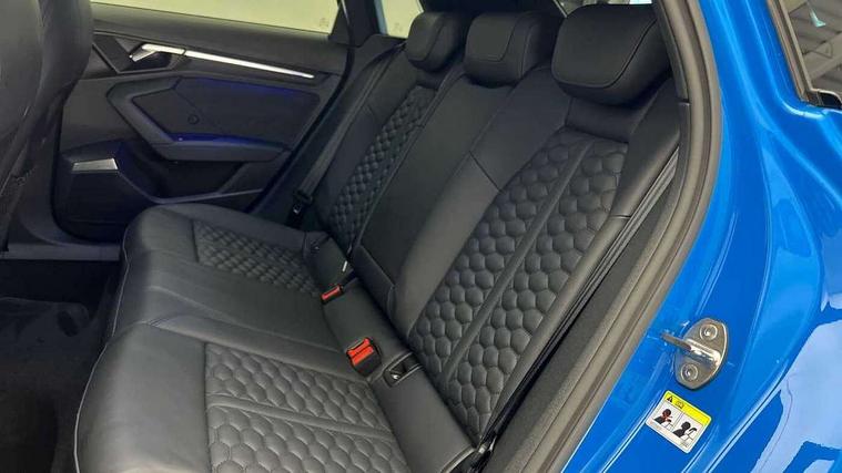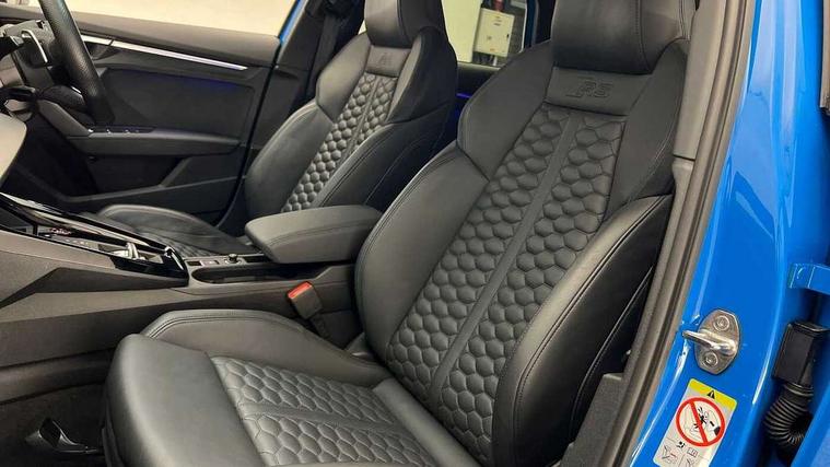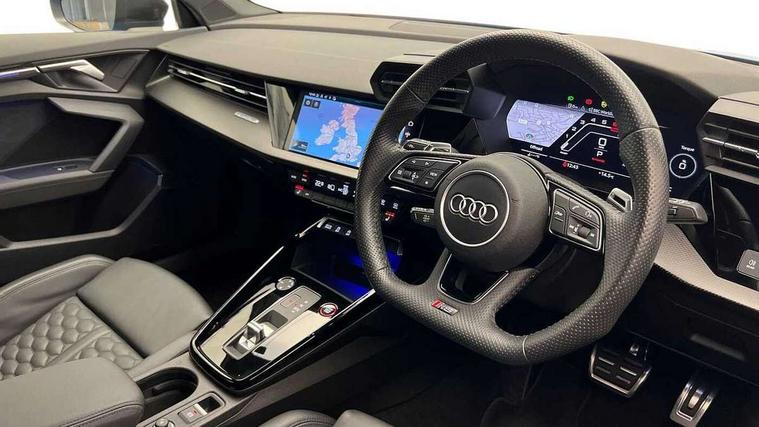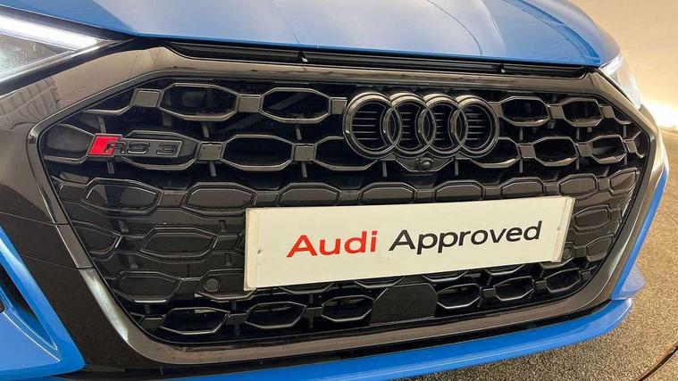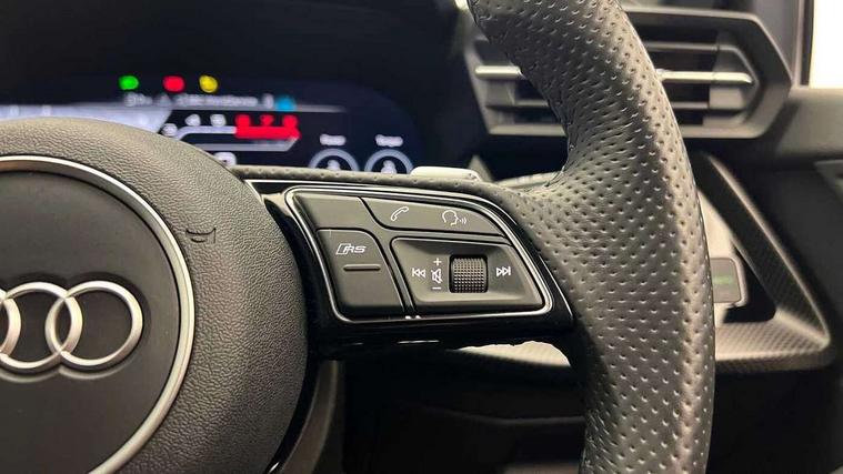 Audi connect emergency call and service, Audi smartphone interface, Audi virtual cockpit with RS specific display 12.3" full colour digital instrument cluster, Automatic start/stop system with recuperation, Bluetooth interface, Collision avoidance assistant, Lane departure warning system, Legal emergency call, Manual boot opening, Parking assist with parking system plus, Progressive power assisted steering, Quattro permanent four wheel drive, Rear suspension, DAB Digital radio, 3rd brake light, Acoustic glass windscreen, Audi beam uses LEDs to project the Audi sport logo onto the ground as you exit your RS 3, Audi matrix LED headlights, LED rear lights, dynamic front and rear indicators and headlight cleaning system, Auto dimming rear view mirror, Body colour roof, Carbon exterior door mirror, Carbon fibre engine cover, Carbon roof spoiler, Door mirrors - electrically adjustable, heated, folding and auto dimming on both sides, Headlight washers, Light and rain sensors, Privacy glass - dark tinted rear and rear side windows from B-pillar backwards, Rear window wiper and washer system, RS exterior features in gloss black, RS sports exhaust system, Side skirt in carbon inlay, 40/20/40 split folding rear seat bench, Black cloth headlining, Dual zone electronic climate control, Front and rear headrests, Front centre armrest, Front sports seats RS embossed logo, Front/rear floor mats, Heated front seats, Honeycomb stitching and RS embossing, Illuminated door sill trims inlays in aluminium with RS 3 logo, Manually adjustable front seats, RS emblems, Stainless steel pedals and front footrest in black, Aluminium interior elements pack - RS3, Ambient lighting pack - RS3, MMI navigation plus with MMI touch - RS3, RS bodystyling - RS3, Storage Pack - RS3, 3x3 point rear seat belts, ABS/EBD, ASR, Audi pre sense front, Driver/Front Passenger airbags, EDL, ESC - Electronic Stability Control + traction control, Front passenger airbag deactivation, Front side airbags with head airbags and interaction airbag, Hill hold assist, Seat belt reminder with passenger presence detection in rear, Tyre pressure loss indicator, Warning triangle and first aid kit, Anti theft alarm, Anti-theft wheel bolts, Electronically operated child lock, Remote control central locking, Carbon inlays, accent surfaces in the dashboard and centre console in platinum grey silk effect paint finish, Full decorative carbon trim, 19" 5 Y spoke matt black alloy wheels, Tool kit, Tyre repair kit,