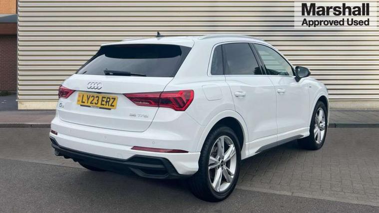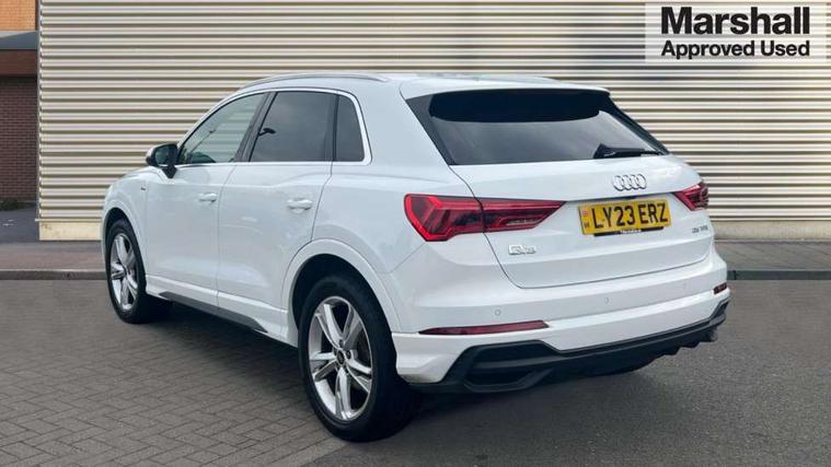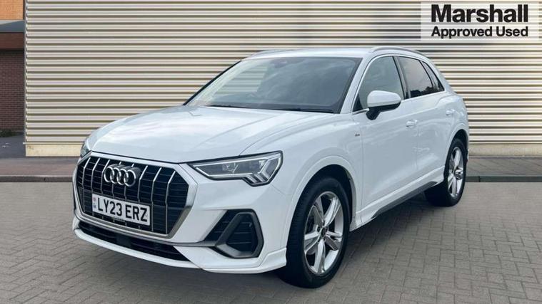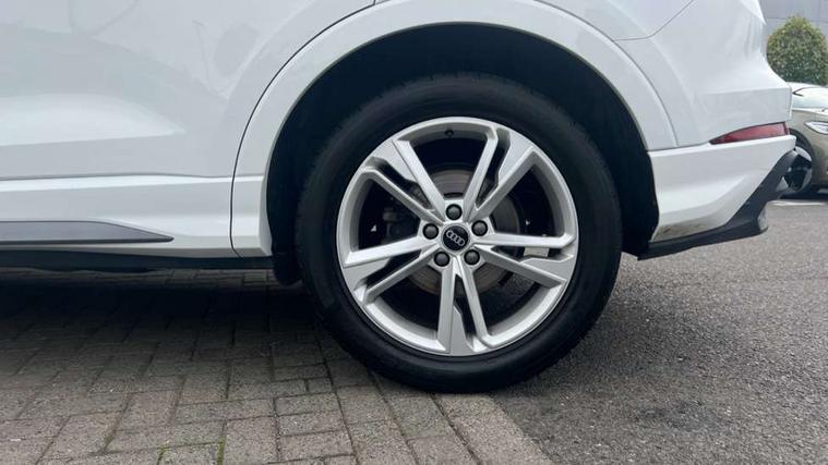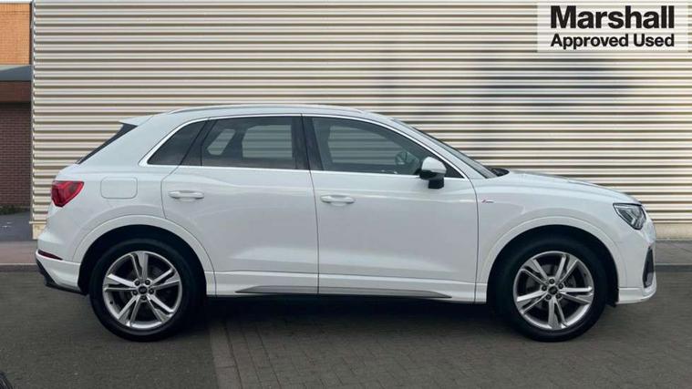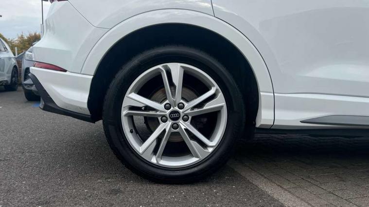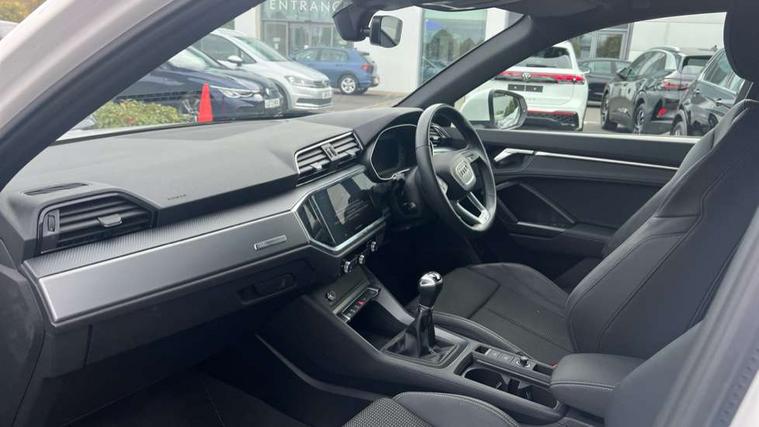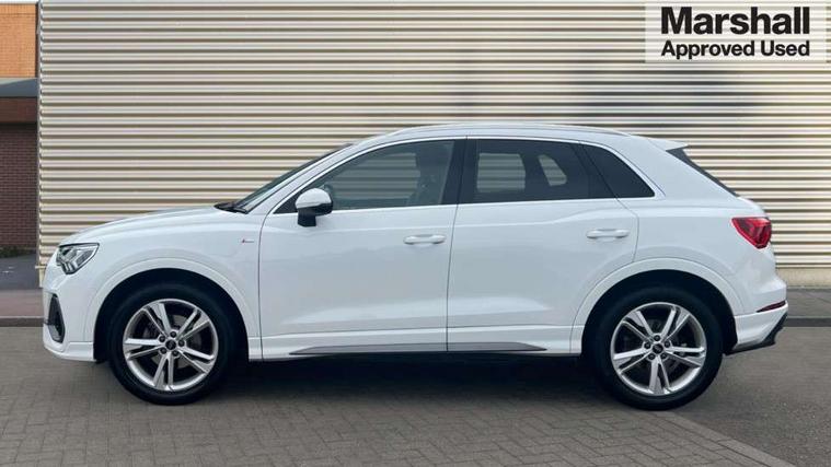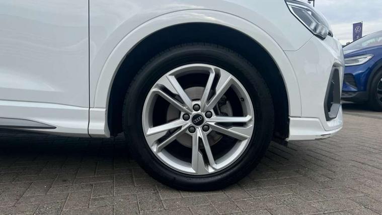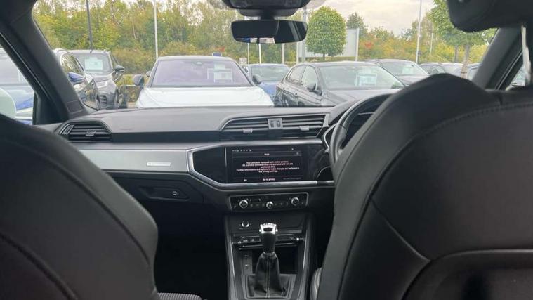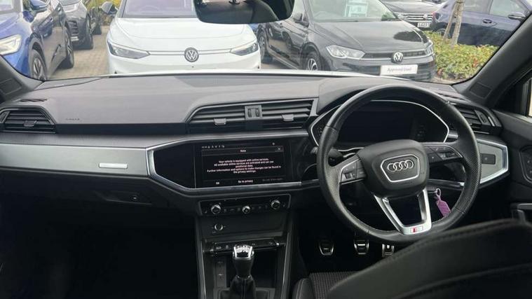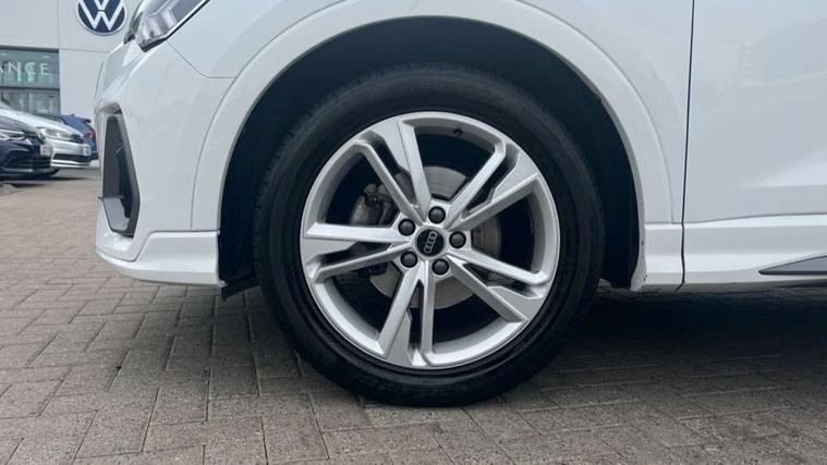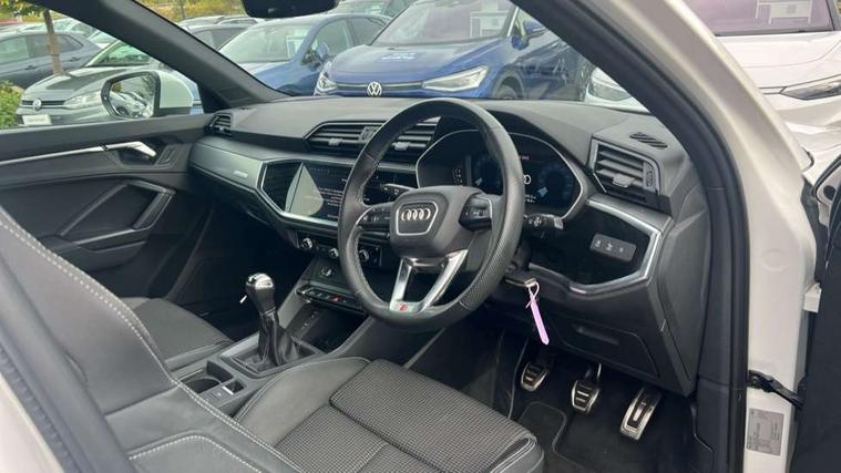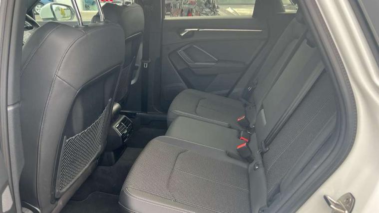 Amazon alexa Integration, Audi drive select, Audi lane departure warning, Audi Virtual Cockpit - 10.25" display, Bluetooth interface, Camera based traffic sign recognition, Cruise control + speed limiter, Legal emergency call, MMI Navigation Plus with high resolution 10.1 inch touchscreen colour display, Power operated tailgate, Progressive steering, Rear parking sensors, Service interval indicator, Smartphone interface includes wireless Apple carplay/Android Auto, Start stop system with recuperation, Voice control system with natural language interaction, Sports suspension, 2 USB-C ports with charge and data functions, 6 passive loudspeakers, DAB digital radio module, Acoustic windscreen, Aluminium roof rails, Aluminium window trim, Anthracite black radiator grille, Auto dimming frameless rear view mirror, Body colour front spoiler blade, Body coloured bumpers, Electrically folding, adjustable and heated door mirrors with integrated LED side indicators and kerb view function for passenger side, Front and rear electric windows, Front fog lights, Front side air inlets in matt platinum grey, Grille vertical bars in aluminium silver/Matt, High gloss black finish B and C pillars, LED Dynamic rear indicators, LED headlights with LED daytime running lights, LED rear lights, LED third brake light, Privacy glass dark tinted rear and rear-side windows (from B-pillar backwards), Rain and light sensors, Rear diffuser grille in grained matt black, Rear diffuser strip in matt anthracite black, Rear side wing doors, Rear wiper, S line badges on front wings, S Line front and rear bumpers, Side skirt insert in matt Platinium grey, Variable front intermittent wipers, 12V socket in rear centre console, 3 seat bench in 2nd row, 3 spoke leather multifunction steering wheel features S badging and grips in perforated leather with contrast stitching, 40:20:40 folding with manual adjustment for 60:40 forwards/backwards position and backrest angle, Adjustable rear seat bench/backrest with centre armrest and cupholder, Black cloth headlining, Dual zone electronic climate control, Front and rear black floor mats with contrast stitching in rock grey, Front and rear headrests, Front and rear roof module including reading lights, Front centre armrest, Glove compartment lighting, Height and reach adjustable steering wheel, Illuminated door sill trims with S logo, ISOFIX child seat mounting for front passenger with airbag deactivation and outer rear seat including top tether attachment point for outer rear seats, Luggage compartment light, Manual front seats with height adjustment, Perforated leather gearknob, Single front passenger seat, Stainless steel luggage compartment sill finisher, Stainless steel pedals, Ambient lighting pack - Q3, Non smoking pack - Q3, 3x3 point rear seatbelts, 6 airbags - Driver, front passenger, curtain and side windows, Audi pre-sense front with pedestrain and cyclist recognition, Electrically operated child locks on rear doors, Electromechanical parking brake, Electronic stabilisation control including ABS, ASR and EDL, Front seatbelt reminder, Hill descent control, Hill hold assist, Pre sense basic, Seatbelt monitoring, Tyre pressure warning, Warning triangle and first aid kit, Anti theft alarm, Anti theft wheel bolts, Immobiliser, Remote central locking, Aluminium look interior elements, Dark matt brushed aluminium inlay, Detail dashboard around MMI touch colour display in glass look, black with surround in aluminium look, Leatherette door armrest,