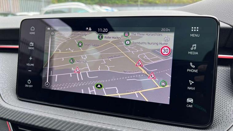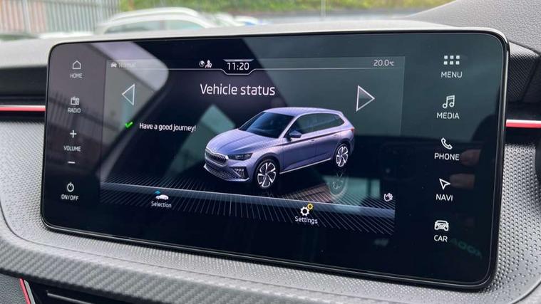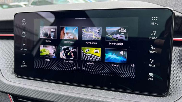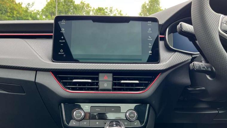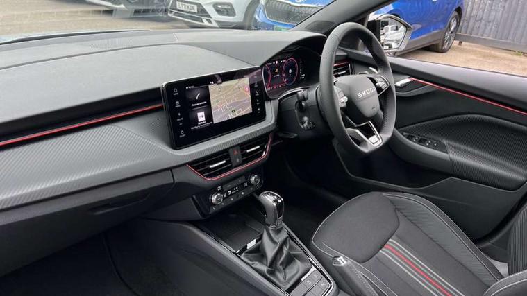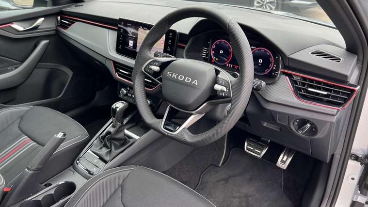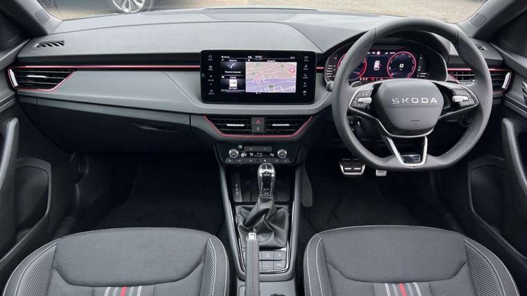 Advanced driver attention and drowsiness monitor, Bluetooth, e-Call (emergency call), Front assist system, PAS, Rear parking sensors, Rear view camera, Speed limiter, Tailgate, Traffic sign recognition, Virtual Cockpit - 10.25" digital display, Voice control system, Wireless smartlink, Drive mode select with Sport Chassis Control and ECO mode, 4 USB C ports, 8 Speakers, 9.2" Skoda navigation display, DAB radio, Auto dimming rear view mirror, Automatic headlight control with manual coming and leaving home feature, Automatic intermittent wipers, Black door mirrors, Black lettering on boot lid, Black radiator grille, Black rear diffuser, Black roof spoiler, Black window frames, Body colour bumpers, Body colour door handles, Extended tailgate glass, Front and rear electric windows, Heated rear window, LED 3rd brake light, LED daytime running lights, LED high beam, LED low beam, Light sensors, Monte carlo plaque, Panoramic glass roof, Privacy glass, Rear LED fog light, Rear side wing doors, Rear wiper, Tinted windows, Unique dark chrome design logo on alloy wheels, 12V socket in luggage compartment, 3 seat bench in 2nd row, Aluminium pedals, Ambient lighting in white/red, Black / White armrest stitching, Black roof headlining, Cargo elements, Chrome inner door handles, Door inserts in art.leather carbon, Driver and passenger sun visors with vanity mirror, Dual zone climate control, Front and rear roof lights, Front centre armrest, Front head restraints, Height adjustable driver seat, Height adjustable passenger seat, Ice scraper, Illuminated glove compartment, Inner circulation control with pollen filter, ISOFIX for front passenger seat, Isofix preparation for back seats, Leather gearknob and handbrake lever, Luggage net under rear parcel shelf, Manual lumbar support for front seats, Monte Carlo cloth upholstery, Net package and top tether hooks in boot space, Pocket on the back of both front seats, incl. mobile phone pockets, Rear centre armrest, Red hotstamping, Single front passenger seat, Skoda lettering on steering wheel, Sport seats, Textile floor mats, Third rear headrest, Ticket holder, Top tether for front passenger seat, Umbrella in driver's door, Light and view plus pack - Scala, 3x3 point rear seatbelts, ABS, Child locks, Curtain airbags and front side airbags, Disc brakes, Driver and front passenger airbags, ESP, Hill hold control, Manual leather parking brake, One tone horn, Passenger airbag switch off function, Seatbelt reminder for driver and front passenger, Tyre pressure monitoring system, Anti theft alarm system with interior monitoring, backup horn and towing protection, Anti-theft wheel bolts, Remote central locking with 2 remote folding keys, SAFE function for remote central locking, Carbon effect decorative inserts, 18" Ursa black diamond cut alloy wheels,