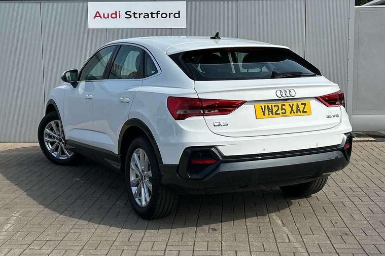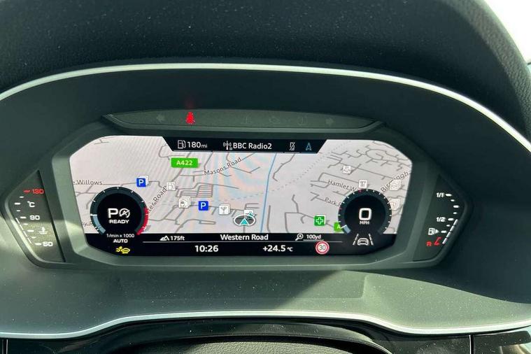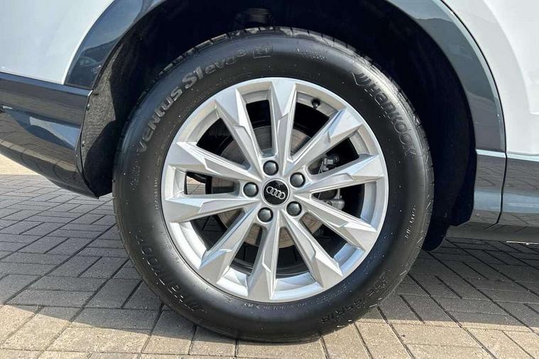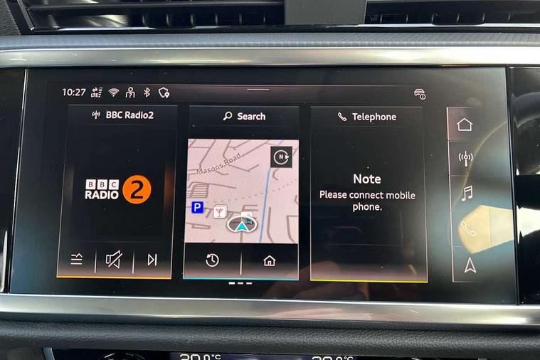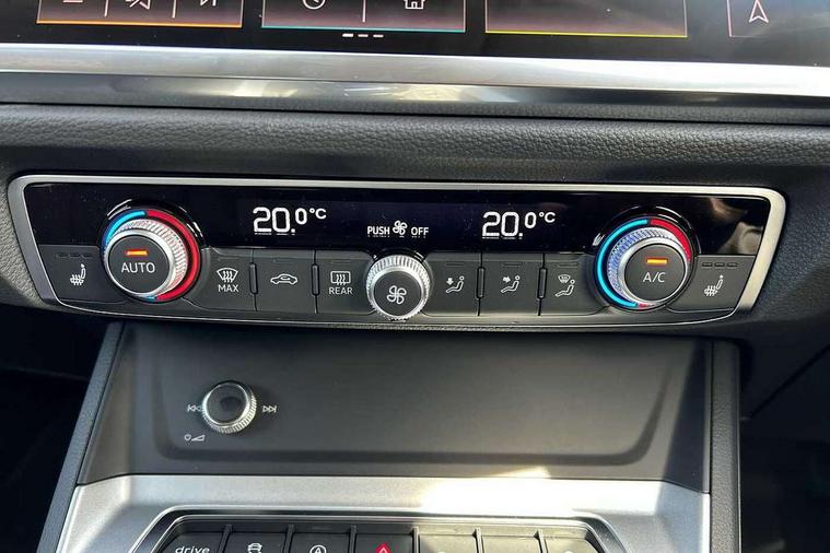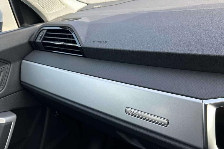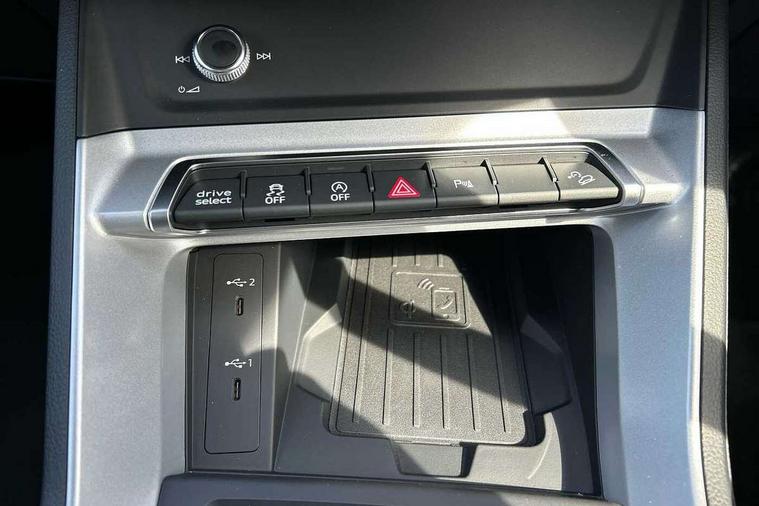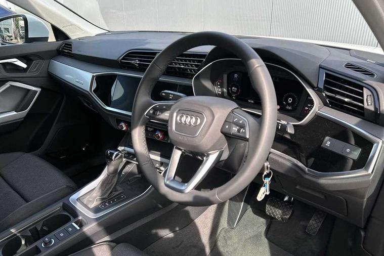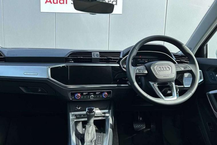 Audi connect safety and service, Audi drive select, Audi lane departure warning, Audi Virtual Cockpit - 10.25" display, Bluetooth interface, Camera based traffic sign recognition, Distraction and Fatigue warning, Legal emergency call, MMI Navigation Plus with high resolution 10.1 inch touchscreen colour display, Power operated tailgate, Progressive steering, Service interval indicator, Smartphone interface includes wireless Apple carplay/Android Auto, Start stop system with recuperation, Voice control system with natural language interaction, Standard suspension, 2 USB-C ports with charge and data functions, 6 passive loudspeakers, DAB digital radio module, Acoustic windscreen, Aluminium window trim, Auto dimming door mirrors, Auto dimming frameless rear view mirror, Bumpers and underbody protection in contrasting manhattan grey paint finish, Diffuser grille in grained matt black, Diffuser trim in manhattan grey metallic, Door sill trims with illuminated aluminium inlay, Electrically folding, adjustable and heated door mirrors with integrated LED side indicators and kerb view function for passenger side, Front and rear electric windows, Front fog lights, Front side air inlets in Manhattan grey metallic, Grille surround in aluminium silver matt, High gloss black finish B and C pillars, Honeycomb design radiator grille in matt anthracite black, LED headlights with LED daytime running lights, LED third brake light, Rain and light sensors, Rear side wing doors, Rear wiper, Variable front intermittent wipers, 12V socket in rear centre console, 3 seat bench in 2nd row, 3 spoke multi-function leather steering wheel, 40:20:40 folding with manual adjustment for 60:40 forwards/backwards position and backrest angle, Black carpet mats, Dual zone electronic climate control, Electric lumbar support, Front and rear floor mats, Front and rear headrests, Front centre armrest, Height and reach adjustable steering wheel, ISOFIX child seat mounting for front passenger with airbag deactivation and outer rear seat including top tether attachment point for outer rear seats, Luggage compartment sill protection in stainless steel, Lunar silver cloth headlining, Manual front seats with height adjustment, Single front passenger seat, Non smoking pack - Q3, 3x3 point rear seatbelts, 6 airbags - Driver, front passenger, curtain and side windows, Audi pre-sense front with pedestrain and cyclist recognition, Electrically operated child locks on rear doors, Electromechanical parking brake, Electronic stabilisation control including ABS, ASR and EDL, Front seatbelt reminder, Hill descent control, Hill hold assist, Pre sense basic, Seatbelt monitoring, Tyre pressure warning, Warning triangle and first aid kit, Anti theft wheel bolts, Immobiliser, Remote central locking, Thatcham approved category 1 anti theft alarm, Aluminium look interior elements, Detail dashboard around MMI touch colour display in glass look, black with surround in aluminium look, Micrometallic silver inlay,