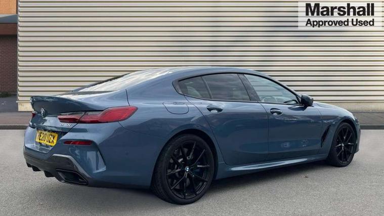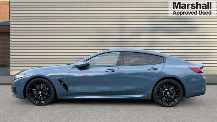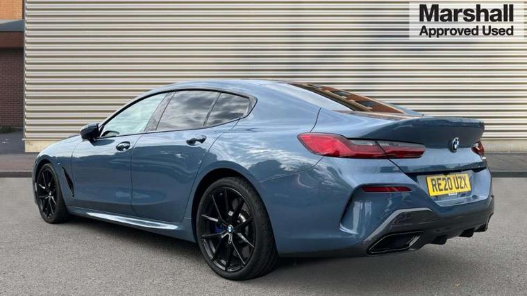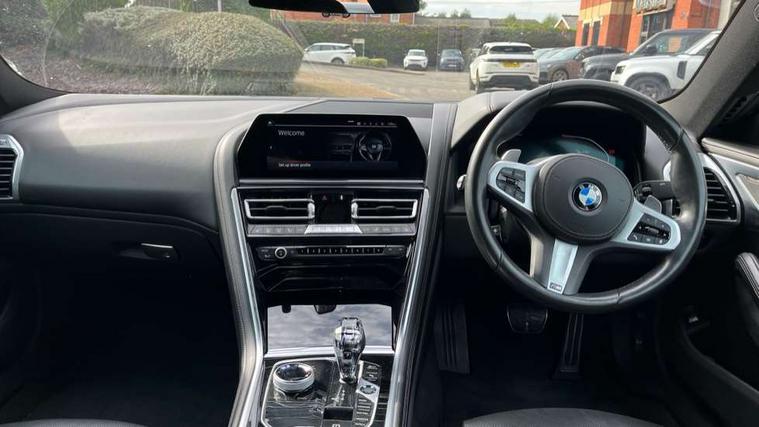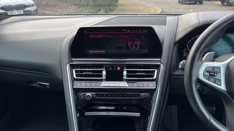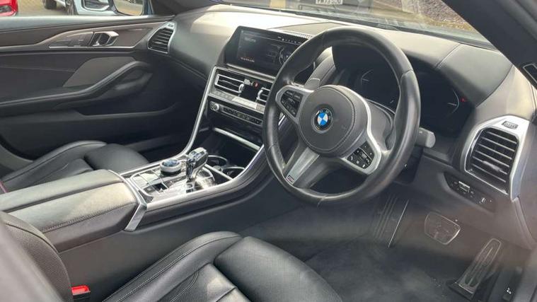 BMW legal emergency call, BMW Live Cockpit Professional sat nav system with intelligent personal assistant, voice control, gesture control, BMW Teleservices, Brake pad wear indicator, Check control system, Condition based service, Drive experience control with Sport, Comfort, Eco Pro and Adaptive modes, Enhanced bluetooth with wireless charging, Head up Display, iDrive touch controller with shortcut buttons, Instrument and upper door panel in walknappa leather, Integrated owners handbook, Oil sensor for level and grade, On board computer, Outside temperature display, Powered tailgate operation, Rear view camera, Run flat indicator, Service interval indicator, Wifi hotspot preparation, Double wishbone front axle, Dynamic Damper Control, Eight speed sport automatic transmission with gearshift paddle switches, M Sport differential, Petrol Particulate Filter, DAB Digital radio, Favourite buttons, USB/audio interface, Bright chrome kidney grille, Carbon core, Chrome M designation on front side panel, left and right, Climate comfort windscreen, Dynamic brake lights, Electrically adjustable, heated, folding exterior mirrors, Follow me home headlight function, Frameless interior mirror, Front and rear bumper system with replaceable deformation elements, Front electric windows, Heated windscreen washer jets, High beam assistant, Illuminated door handles, LED rear lights, Model logo on right tailgate, Rain sensor with automatic headlight activation, Rear apron trim insert in dark shadow metallic, Satinised aluminium kidney struts, Thermally insulated windscreen, Third brake light featuring LED technology, Welcome lights in interior and door handle area, 2 cup holders in front, 2 rear head restraints, 2 X front 12v power sockets, 4 zone control automatic air conditioning, 50/50 split folding rear seat, Dynamic ambient interior lighting, Electric front seat adjustment with driver memory, Front and rear seat heating, Front entry lights doors, Front reading lights, Front sun visors with ticket holder and illuminated mirror, Illuminated M door sill finishers, Lockable glove compartment with light, M Pedals, M sport leather steering wheel including multifunction controls, Microfilter and active carbon filter, Steering column with adjustable height and length and activation via control on the steering column, Velour floormats, Connected professional pack - 8 Series, M sport exterier styling aerodynamics pack - 8 Series, 3x3 point rear seatbelts, ABS/EBD, Active front seat headrests, Active protection, Airbags - Driver and front passenger airbag with seat occupancy detection, knee, side and front passenger seat airbag deactivation, Child seat ISOFIX attachment rear outer seats, Crash sensor activating central locking release, hazard warning lights, fuel cut off, interior lighting, safety battery terminal clamp and airbags, DSC - Dynamic Stability Control, Dynamic Traction Control - DTC, Electromechanical parking brake with automatic drive away release and auto hold function, Front and rear brake discs with interior ventilation, Front three point with pyrotechnical belt latch tensioner seat belts, belt force limiter and belt stopper, Rear three point with pyrotechnical belt latch tensioner seat belts and belt force limiter, Side impact protection, Two tone horn, Tyre pressure monitoring system (TPMS), Warning triangle and first aid kit, Alarm system (Thatcham 1) with electronic engine immobiliser, Centre lock switch, Closing system with central locking, Comfort access system, Keyless engine start, Locking wheel bolts, Vehicle key with exclusive M designation,