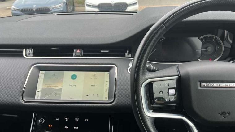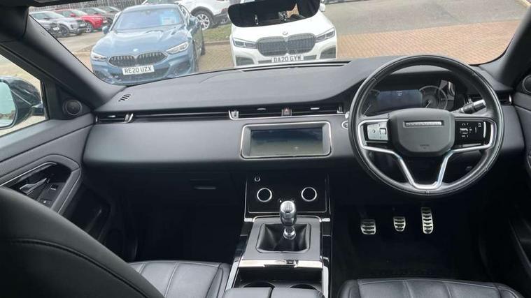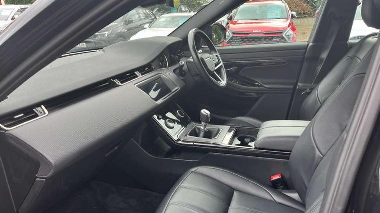 10" touch screen, Android Auto, Apple car play, Bluetooth connectivity, Brake pad wear indicator warning light, Cruise control + speed limiter, Driver condition monitor, eCall emergency system, Electronic power assisted steering (EPAS), Front and rear parking aid, InControl remote, Land Rover InControl apps, Lane keep assist, Pivi pro connected includes upgraded infotainment, connected navigation pro, Nuance speech licence, Push button starter, Traffic sign recognition with adaptive speed limiter, Voice control system, Passive suspension, Digital Audio Broadcast radio-DAB, Steering wheel mounted controls, Auto headlights, Daytime running lights, Electric windows with one touch open/close and anti trap, Evoque and R-Dynamic badge, Flush deployable exterior door handles, Heated rear window with timer, Heated washer jets, Heated windscreen, Power fold, auto-dimming, heated door mirrors with approach lights and auto dimming driver side, Rain sensing windscreen wipers, Rear fog lights, Rear side wing doors, Rear wiper, Tailgate spoiler, Third brake light, 40:20:40 split folding rear seats with centre headrest and armrest, Ambient interior lighting, Bright metal pedals, Isofix system on outer rear seats, Overhead lighting console, Overhead stowage for sunglasses, Passive front head restraints, Rear air vents, Rear centre headrest, Rear head restraints, Single passenger seat, Sunvisors with illuminated vanity mirrors, Twin sliding front centre armrest, 3 rear 3 point seatbelts, Anti-lock braking system (ABS), Customer configurable autolock, DSC - Dynamic Stability Control, Electronic brake force distribution, Electronic parking brake, Electronic traction control, Emergency braking, Front and rear seatbelt reminder, Hill launch assist, Power operated child locks, Roll stability control, Six airbags - Driver and passenger airbags/driver knee airbag/front side airbag and curtain airbags, Tyre pressure monitoring system, Alarm, Immobiliser, Intrusion sensor, Locking wheel nuts,