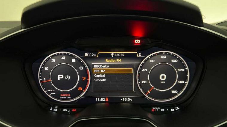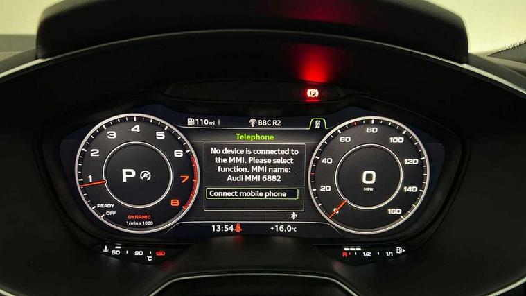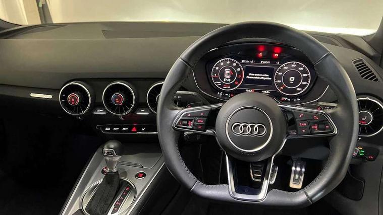 Audi drive select with 4 Pre configured modes, Audi smartphone interface, Audi virtual cockpit - 12.3" high-resolution LCD display with fully customisable instrument cluster, Cruise control + speed limiter, Emergency call service, MMI touch panel, Mobile phone preparation with bluetooth interface, Progressive power assisted steering, Service interval indicator, Start/Stop system with energy recuperation, TP memo, Sports suspension, AM/FM radio, Bluetooth audio streaming, DAB Digital radio, MMI Radio with CD player and SD/XC card slot, Auto dimming rear view mirror, Body colour bumpers, Body colour door mirrors, Electric folding door mirrors, Electric front windows, Electrically adjustable and heated door mirrors with integrated LED side indicators, Front fog lights, Green tinted heat insulating glass, LED 3rd brake light, Light and rain sensors, Rear boot, Retractable rear boot spoiler, Sunband for windscreen, Xenon headlights with LED daytime running lights with automatic headline range control + LED rear lights, brake lights and rear indicators, 12V socket, 2 rear seats, 3 spoke flat bottomed high multi-function leather sport steering wheel with gearshift paddles, Alcantara/Leather upholstery includes seat centre panels, door trim inserts in black Alcantara with side bolsters, head restraints in black leather, Aluminium door sill trims, Front centre armrest, Front passenger seat, Front sports seats, Heated front seats, Height/reach adjust steering wheel, Integrated head restraints, ISOFIX child seat mounting for front passenger seat with airbag deactivation, Manual adjustment of seat height, fore/aft position, seat angle, seat depth and backrest angle, Rear head restraints, Rear top tether child seat ISOFIX attachment, Split folding rear seat, Non smoking pack - TT/TT RS, 3 point front seat belts, ABS, ASR traction control, Curtain airbags, Driver and front passenger airbag with front passenger airbag deactivation, EDL traction control, Electromechanical parking brake, ESP, First aid kit, Front side airbags, Head airbags, Hill hold assist, Seatbelt warning, Tyre pressure loss indicator, Warning triangle, Anti theft alarm, Anti theft wheel bolts, Immobiliser, Keyless Go, Remote central locking, Aluminium design inlays, Tool kit, Tyre repair kit,