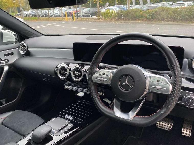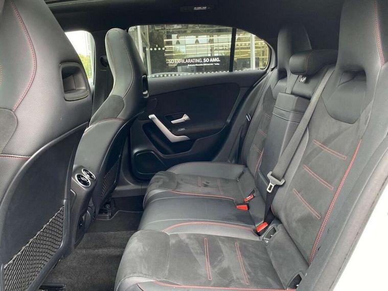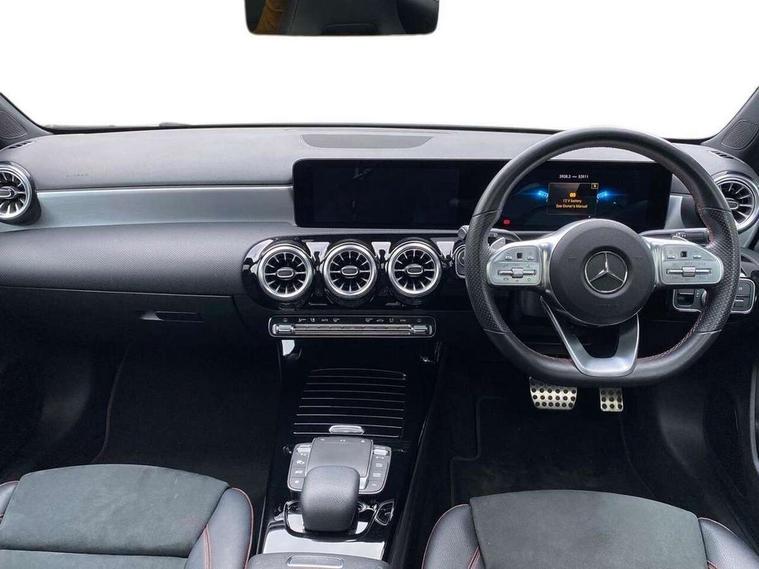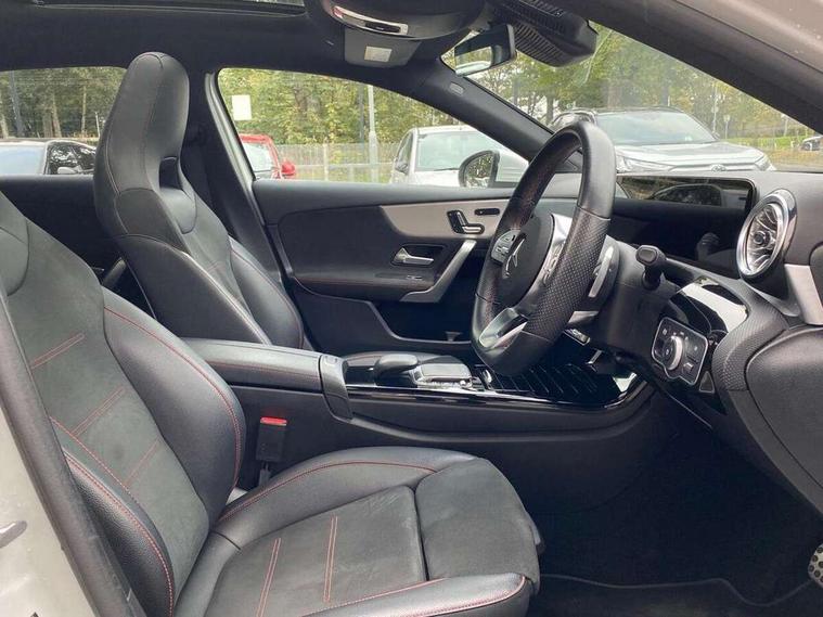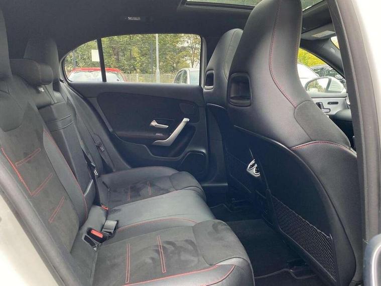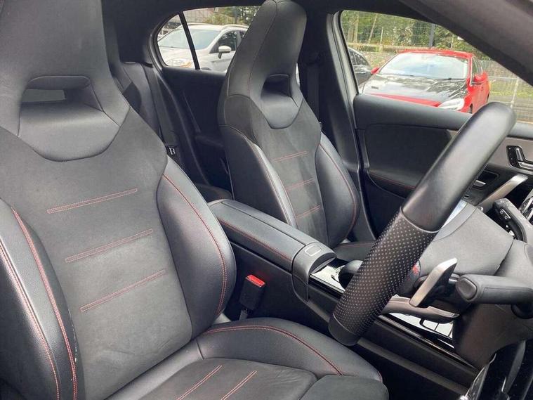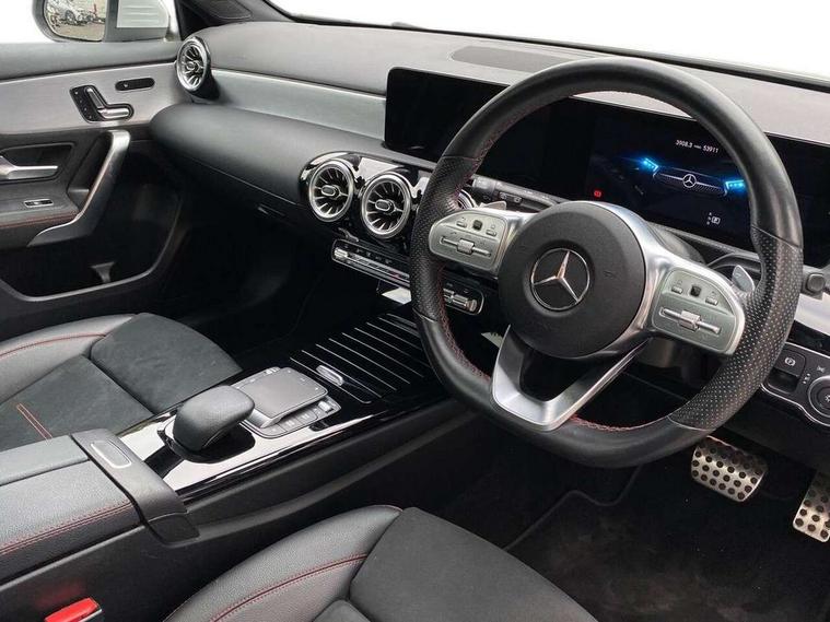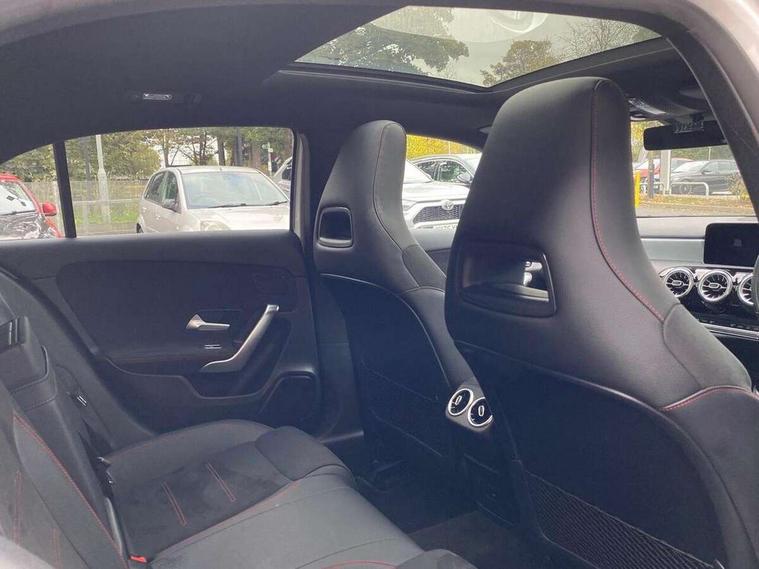 10.25" Digital instrument cluster display screen, 10.25" media display, 180 degree rear view camera with parking guidelines, Active parking assist with visual and audible warning of detected obstacles, Attention assist, Brake pad wear indicator warning light, Car wash mode, Direct steering, Dual bluetooth interfaces, DYNAMIC SELECT with a choice of driving modes (ECO, Comfort, Sport and Individual), ECO start/stop function, Fluid level warning indicator for fuel, oil, coolant and washer fluid, Hard-disk navigation, Hey Mercedes Voice activation, Lamp failure indicator, MBUX augmented reality for navigation, Mercedes me connect including emergency call system, accident recovery, breakdown and maintenance management, Mercedes me remote services, Outside temperature gauge, Owners manual in English, Pre-installation for private car sharing, Preinstallation for Mercedes Benz link, Service indicator (ASSYST), Smartphone integration with Apple CarPlay and Android auto, Traffic sign assist, Trip computer, Ultrasonic sensors positioned in the front and rear bumpers, Wireless charging, Lowered comfort suspension, Rear axle torsion beam, 10 speakers, 2 USB ports (type C) in rear stowage compartment and one in front of center console, DAB Digital radio, MBUX multimedia system with DAB digital radio and touchpad including satellite navigation, Mercedes-Benz advanced sound system - 225W, 4 Electric Front and Rear windows, Adaptive brake lights, AMG bodystyling - Front apron with splitter in chrome, rear apron with chrome trim and chrome visible trim elements in tailpipe, Black weather strip, Body colour bumpers, Body colour door handles, Body colour side skirt, Body coloured door mirrors, Chrome beltline trim, Diamond radiator grille with chrome pins and silver louvre + chrome insert, Electric adjustable and heated door mirrors with integrated LED side indicators, Exhaust system - Twin visible tailpipes in polished stainless steel, Headlamp assist automatic headlamp activation, Heated glass rear windscreen + timer control, LED high performance headlamps with integrated LED daytime running lights, LED tail lamp, LED third brake light, Multibeam LED with adaptive highbeam assist plus, Panoramic sliding sunroof, Privacy glass, Radio aerial, Rain sensing windscreen wipers with two sensitivity settings, Rear fog lights, Rear wiper, Window line trim strip in chrome, 3 Spoke flat bottom leather multi function steering wheel with perforated leather in grip area, 40:20:40 split folding rear seats, Artico man-made leather/Microfibre Dinamica upholstery with red contrast stitching, Auto Mercedes-Benz child seat recognition sensor, Black air vents with surround in silver chrome, Black roof lining, Brushed stainless steel sports pedals with rubber studs, Controller on centre console with chrome surround, Electrically adjustable front memory seats including lumbar support, Floor mats with stitched edging and AMG lettering, Front centre armrest with storage compartment, Front seat backs luggage nets, Front seat cushion length adjustment, Galvanished gear shift paddles on steering wheel, Heated front seats, Height/reach adjustable steering column, Illuminated front door sills with changeable cover, Interior lighting - 64 colour Ambient lighting, Interior mirror with reading lamps in black and frameless, Rear armrest with 2 cupholders, Rear head restraints, Seat occupancy sensor for front passenger seat, Sports seats with integrated headrests, Stowage compartment in centre console with retractable cover, Sunvisors with illuminated vanity mirrors, Touchpad on center console, Twin front cupholders, Two zone thermotronic luxury automatic climate control, Light and sight pack - A Class, Mirror package - A Class, Seat comfort pack - A Class, 3 rear 3 point seatbelts, ABS with Brake Assist, Active bonnet, Adaptive brake assist with hold function and hill start assist, Black seatbelts, Childproof locks manually operated for rear doors and electrically operated for rear power windows, Crash responsive emergency lighting, Driver and passenger head and side airbags, Drivers knee airbag, Dual stage driver/passenger airbags, Electronic parking brake, ESP curve dynamic assist, ESP with ASR, Front and rear seatbelt reminder, Front brake callipers with Mercedes Benz lettering, ISOFIX and top tether child seat fixing points in two outer rear seats, Tyre pressure monitoring system, Warning triangle and first aid kit, Window airbags, Alarm system/interior protection/immobiliser, Keyless entry lock/unlock, Keyless Go, Remote central locking and crash sensor with emergency opening function, Urban guard vehicle protection system with immobiliser and interior protection, Light aluminium with longitudinal grain interior trim, 18" AMG 5 twin spoke light alloy wheels in titanium grey with highsheen finish, Summer tyres, Tirefit sealant kit,