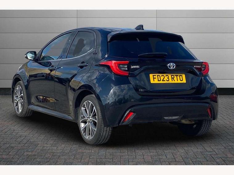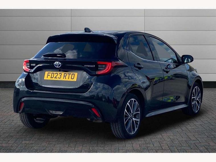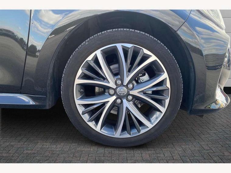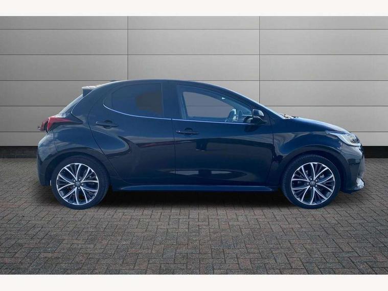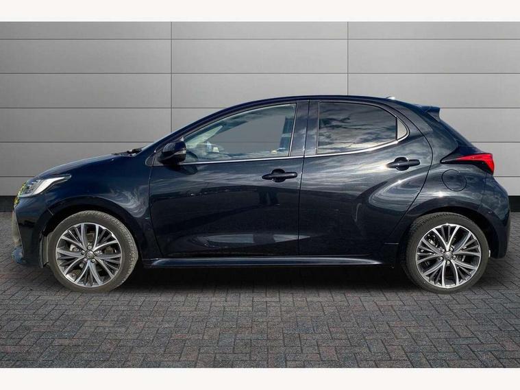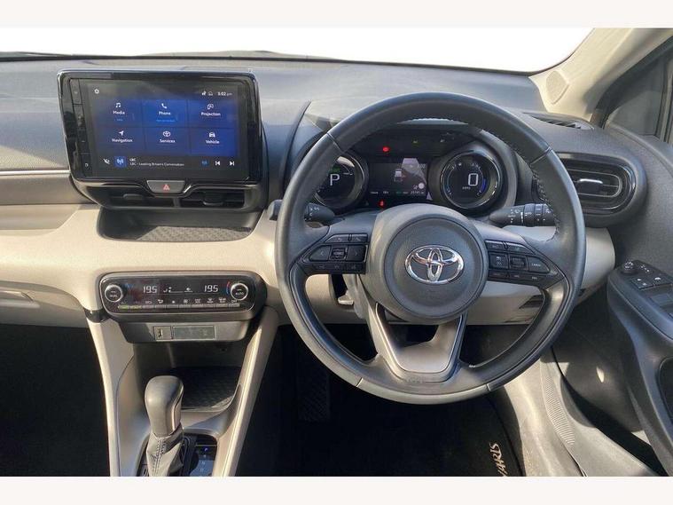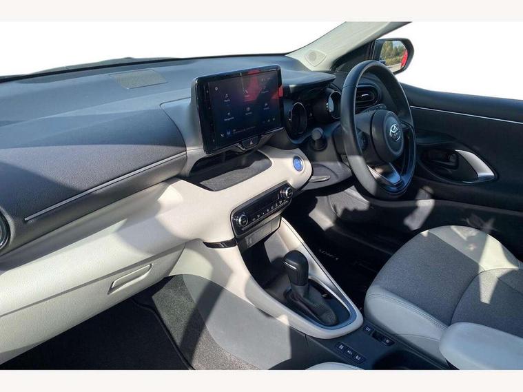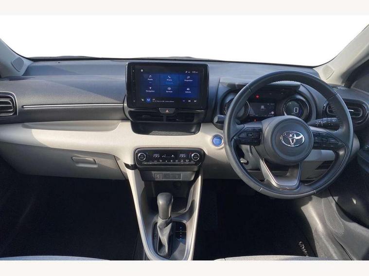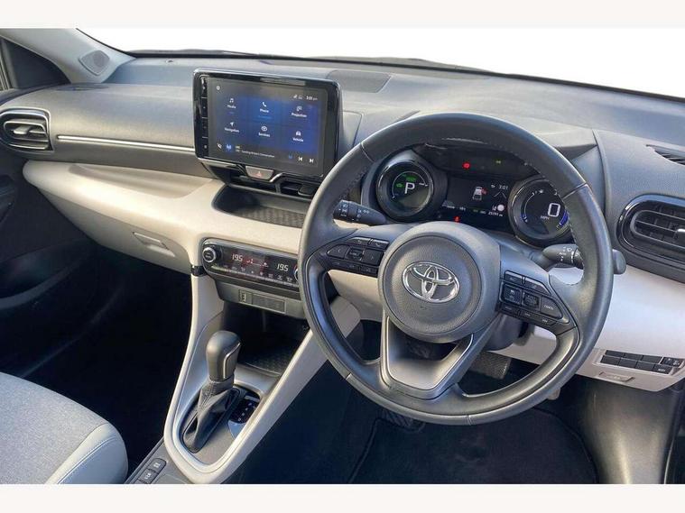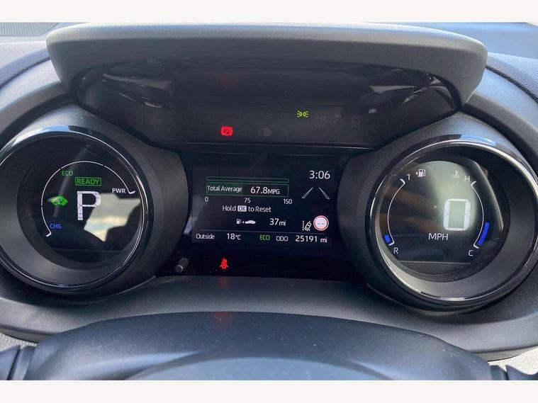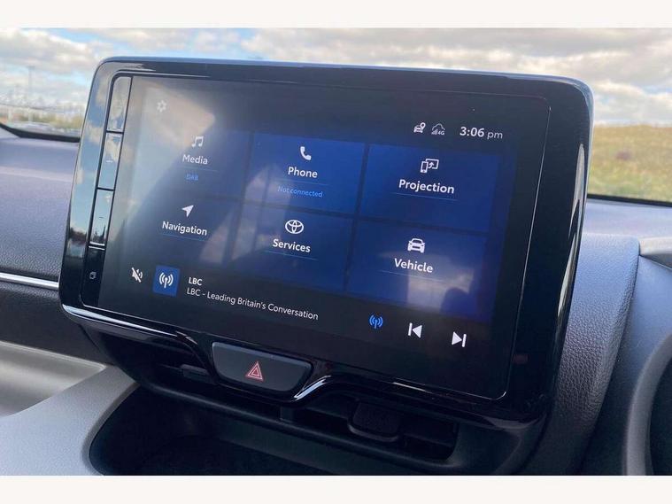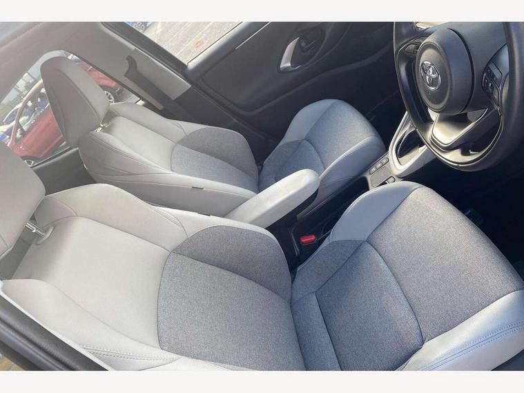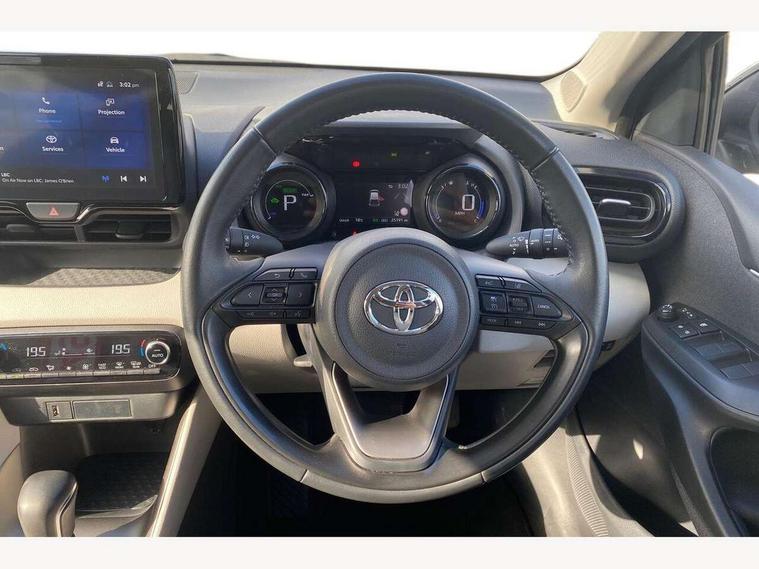 Adaptive cruise control, Adjustable speed limit with speed warning, Blind spot monitoring, Bluetooth connectivity, Colour binocular inspired displays with digital speedometer, E-call, Electric power steering, Hybrid energy display, Multi information display switches on steering wheel, Reversing camera, Smartphone integration with Apple CarPlay and Android auto, Tailgate, Touch 2 navigation system, Voice recognition, Vehicle Stability Control (VSC), 6 speakers, 9" HD multimedia display touch screen with Toyota smart connect, USB connection, Acoustic windscreen glass, Auto windscreen wipers, Automatic headlights, Automatically retractable door mirrors, Body coloured door mirrors, Electric adjustable heated door mirrors, Follow me home headlights, Front auto power windows with anti jam protection, Full LED rear lights, LED daytime running lights, LED front fog lights, LED front light guide, LED Headlights, LED High mounted stop lamp, LED Indicators, LED rear light guide, Manual headlight levelling, Painted chequered front grille, Rain sensor, Rear auto power windows with anti jam protection, Rear privacy glass, Rear side wing doors, Rear spoiler, Rear wiper, Satin lower front grille, Shark fin antenna, Turning signal integrated indicators in door mirrors, Variable front intermittent wipers, 3 adjustable rear headrests, 3 seat bench in 2nd row, 3 spoke leather steering wheel, 60/40 split folding rear seat, Active headrests, Adjustable boot height, Coat hooks in rear grab handles, Cup holders (2 front & door), Data Communication Module (DCM) connected services, Dual zone automatic air conditioning, Fabric seat with partial synthetic leather upholstery, Front armrest, Front sport seats, Glovebox, Grey roof lining, Height adjustable driver's seat, Height adjustable passenger seat, Isofix seat fixing, Leather gearshift, Map pockets on the backs of the front seats, Pollen filter, Shopping bag hooks, Single front passenger seat, Tilt/telescopic steering column, Parking pack - Yaris, 3 point seatbelts on all rear seats, ABS+EBD+Brake assist, Electronic parking brake, Emergency brake light system (EBS), Front passenger airbag on/off switch, Front seatbelt reminder, Hill start assist control (HAC), Rear child proof door locks, Rear seat belt reminder, Supplemental Restraint System (SRS) 8 airbags: Driver & passenger's airbags, dual side curtain airbags, side impact airbags, front centre airbag, Toyota Safety Sense 2, Precollison + Night time Pedestrian & Cyclist Detection, Lane Trace Assist, Auto High Beam, Intelligent ACC & Road Sign Assist, Tyre pressure warning system, 2x Master key, Alarm/immobiliser, Keyless smart entry with push button start, Remote AC via MyT, Remote locking via MyT, Remote powered central double locking doors, Satin chrome interior styling, Soft touch instrument panel, Space saver spare wheel,